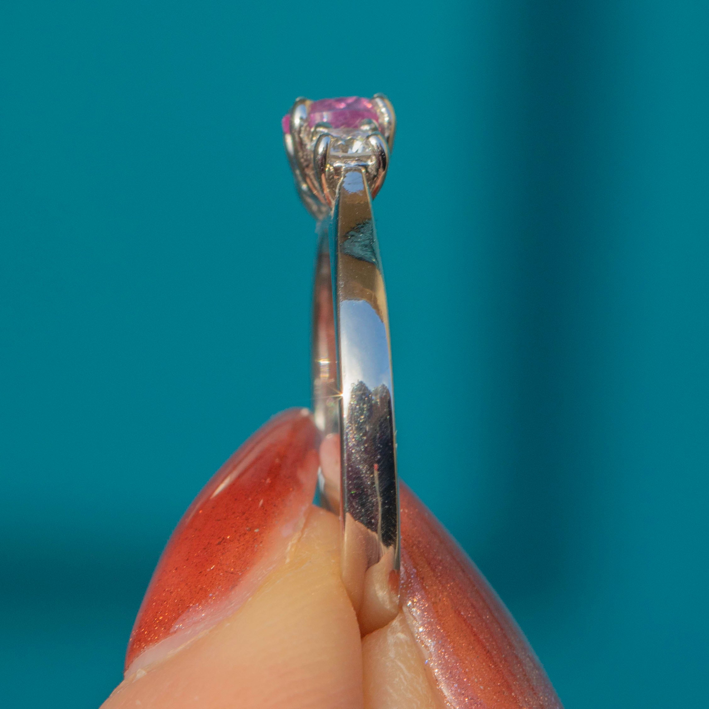 Crafted from cool, smooth Platinum settings, her sleek design glides onto your finger like a dream, making her perfect for daily wear. This Pink Sapphire ring is a dazzling piece and would make a fine choice for a unique engagement ring!