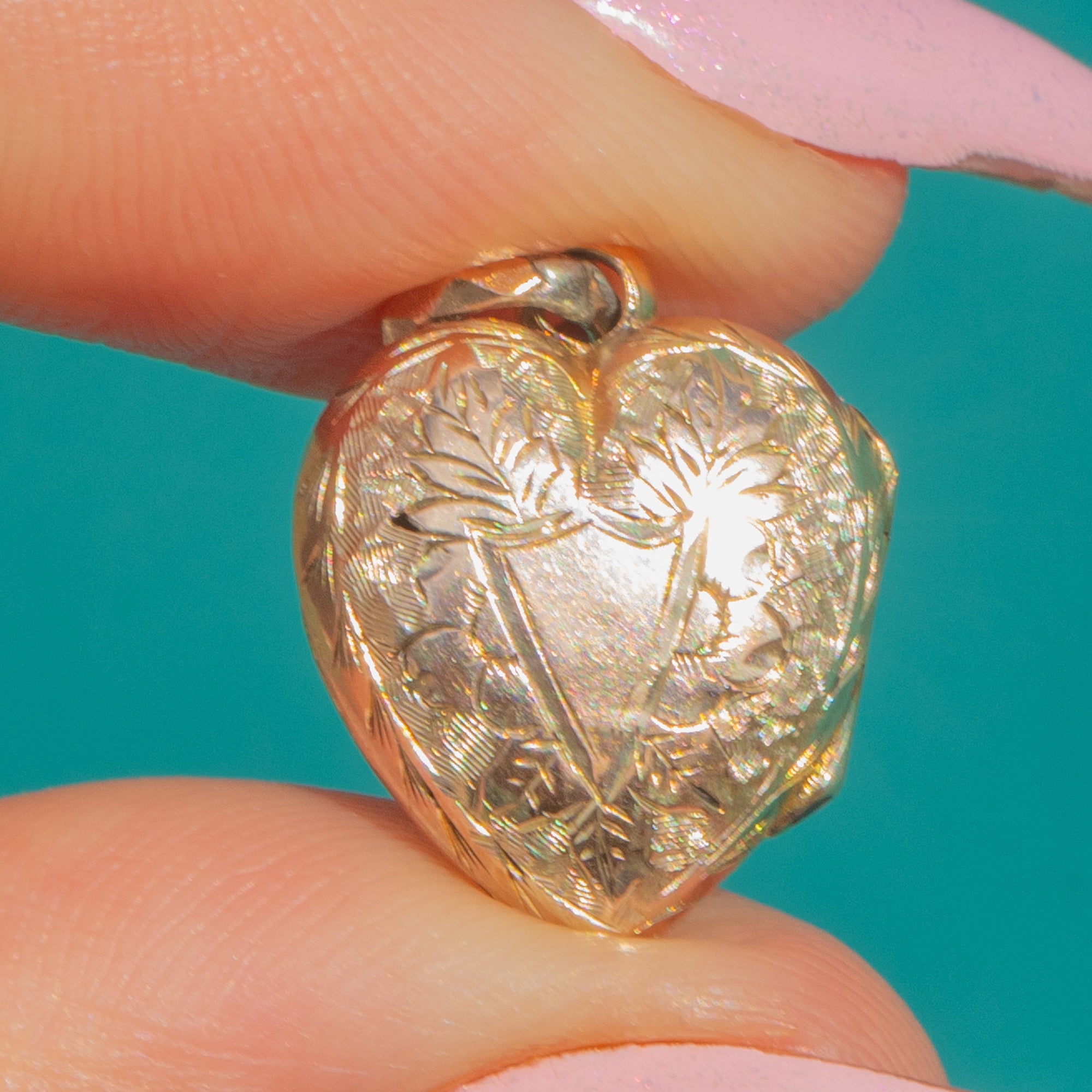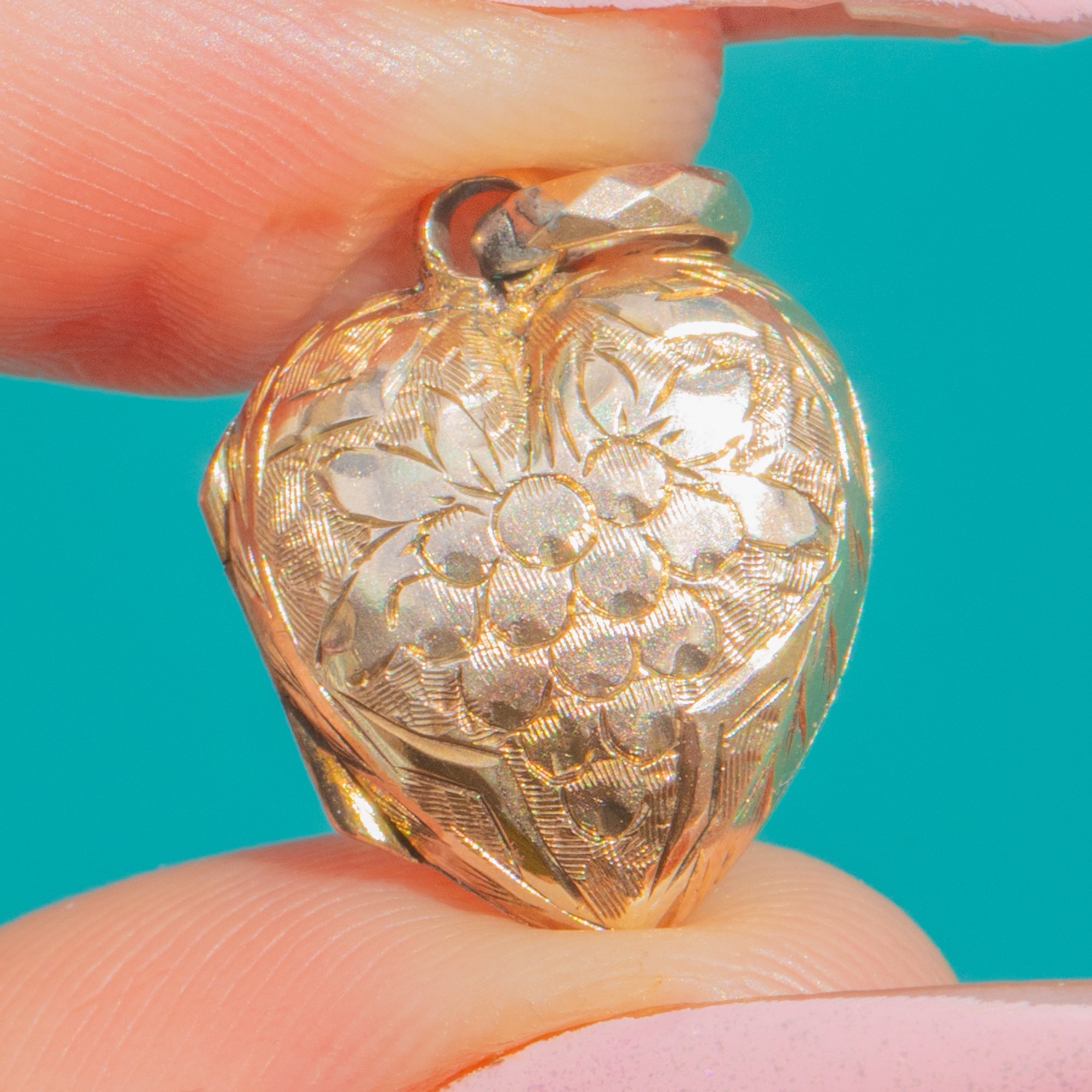 Dainty and romantic, this Victorian 9ct Gold puffy heart locket charms with intricately engraved grapes and forget-me-not flowers framed by a slim polished border. A faceted jump-ring adds a tiny flash of sparkle to the top, completing the ornate-in-miniature feel.