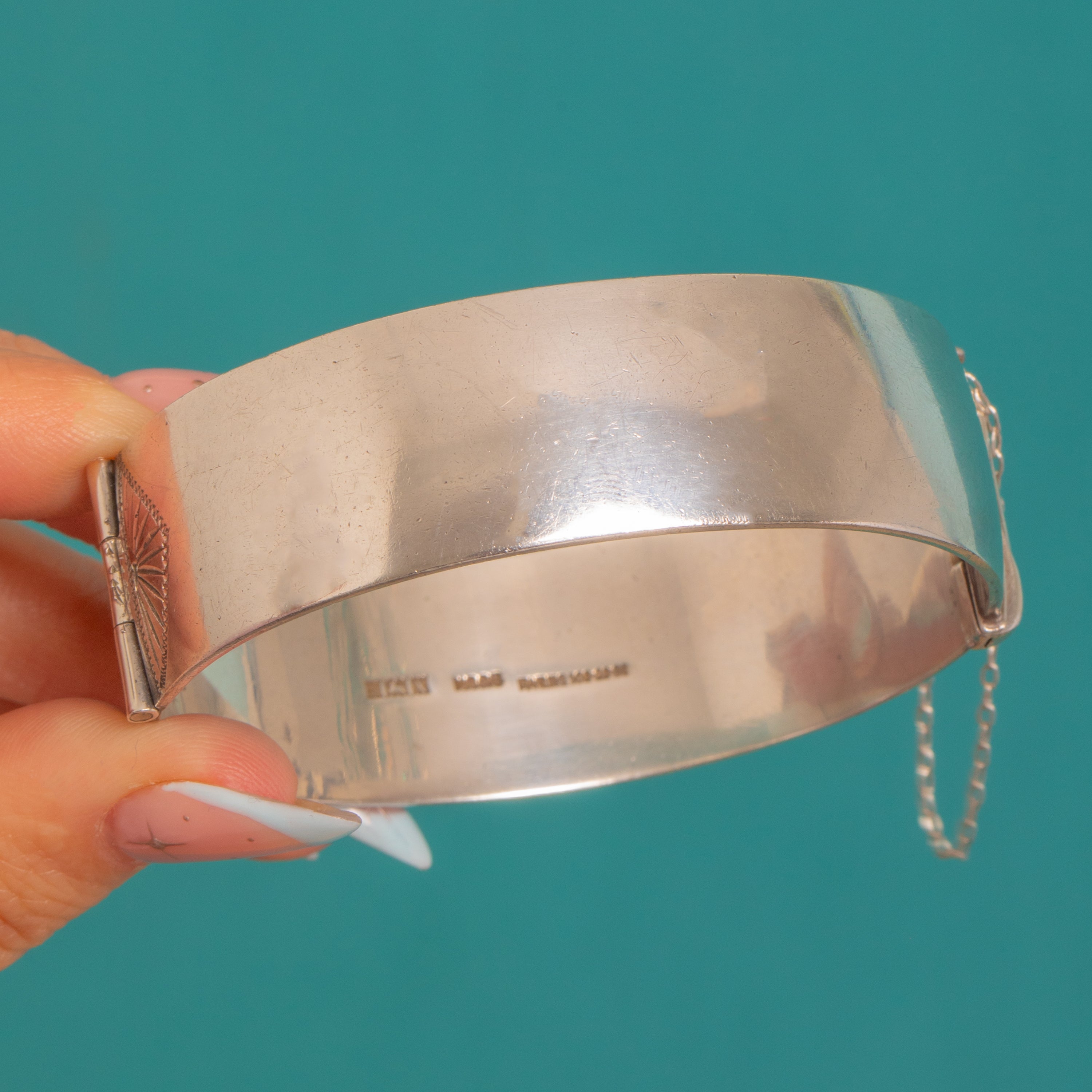 Brimming with nature’s poetry, this wide Vintage Sterling Silver hinged bangle pairs crisp bright‑cut engraving of ferns, leaves and petite flowers with applied 9ct Gold butterflies and birds. The two‑tone contrast dances across a bold 19mm width, framed by a fine beaded, zig‑zag edge for that chic, textural finish.