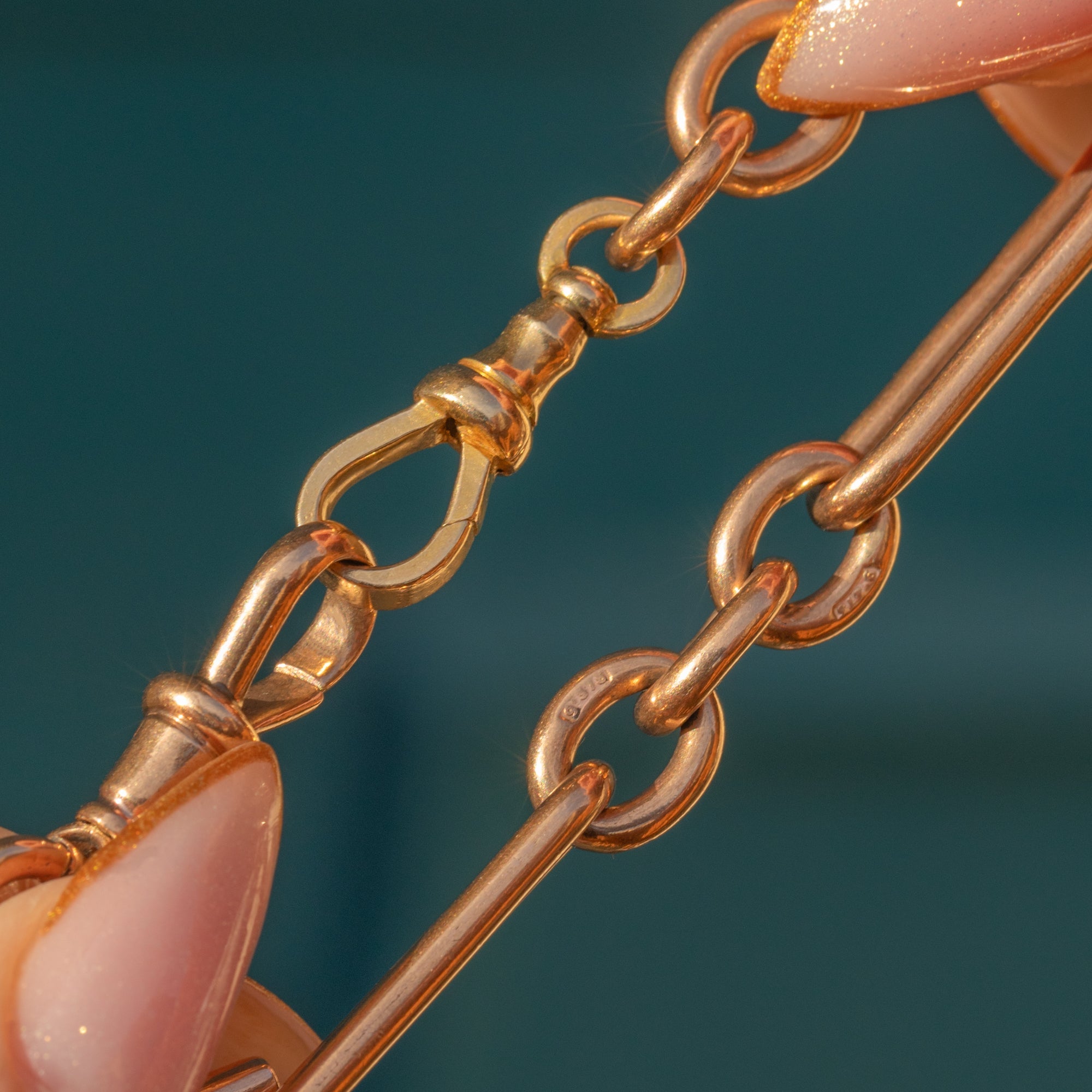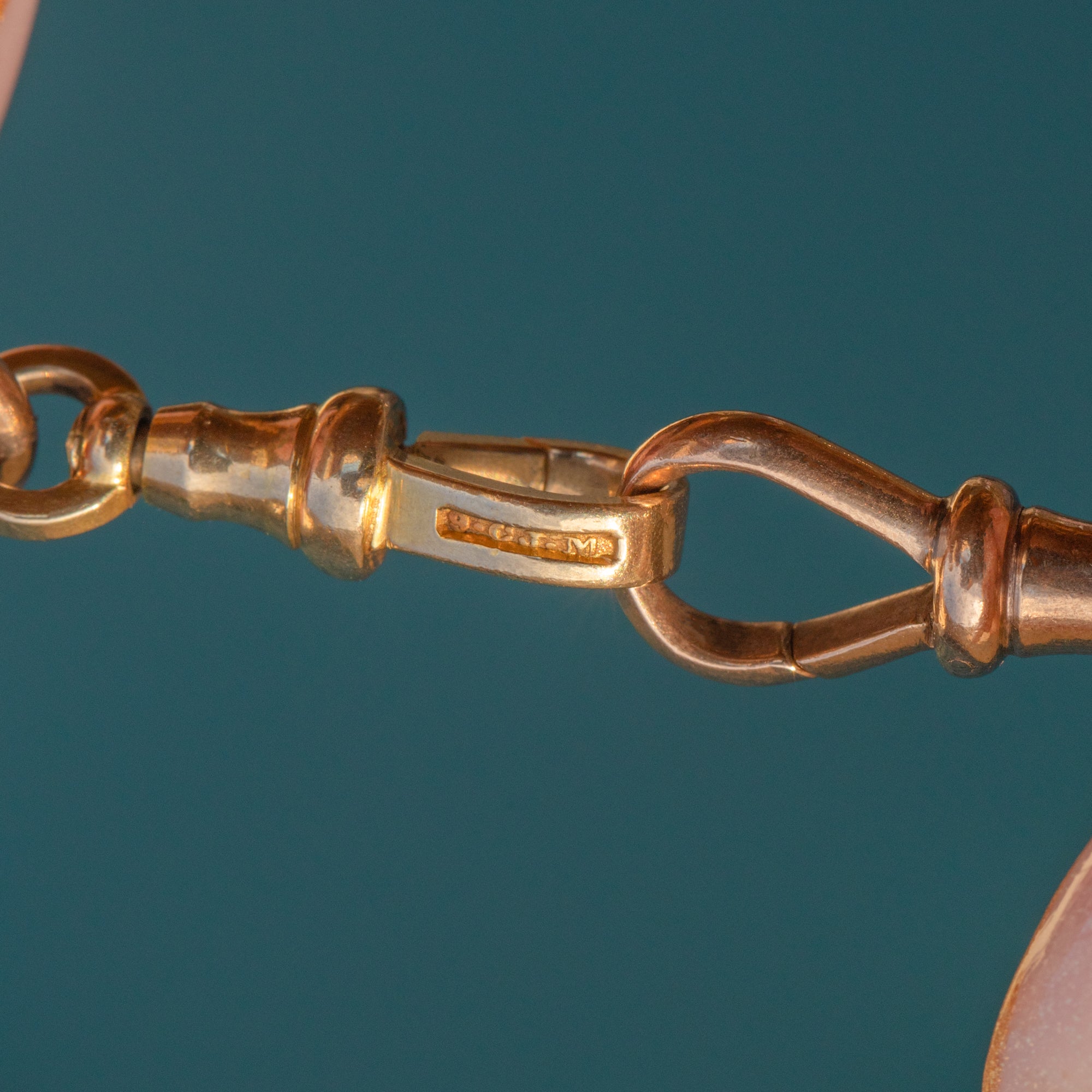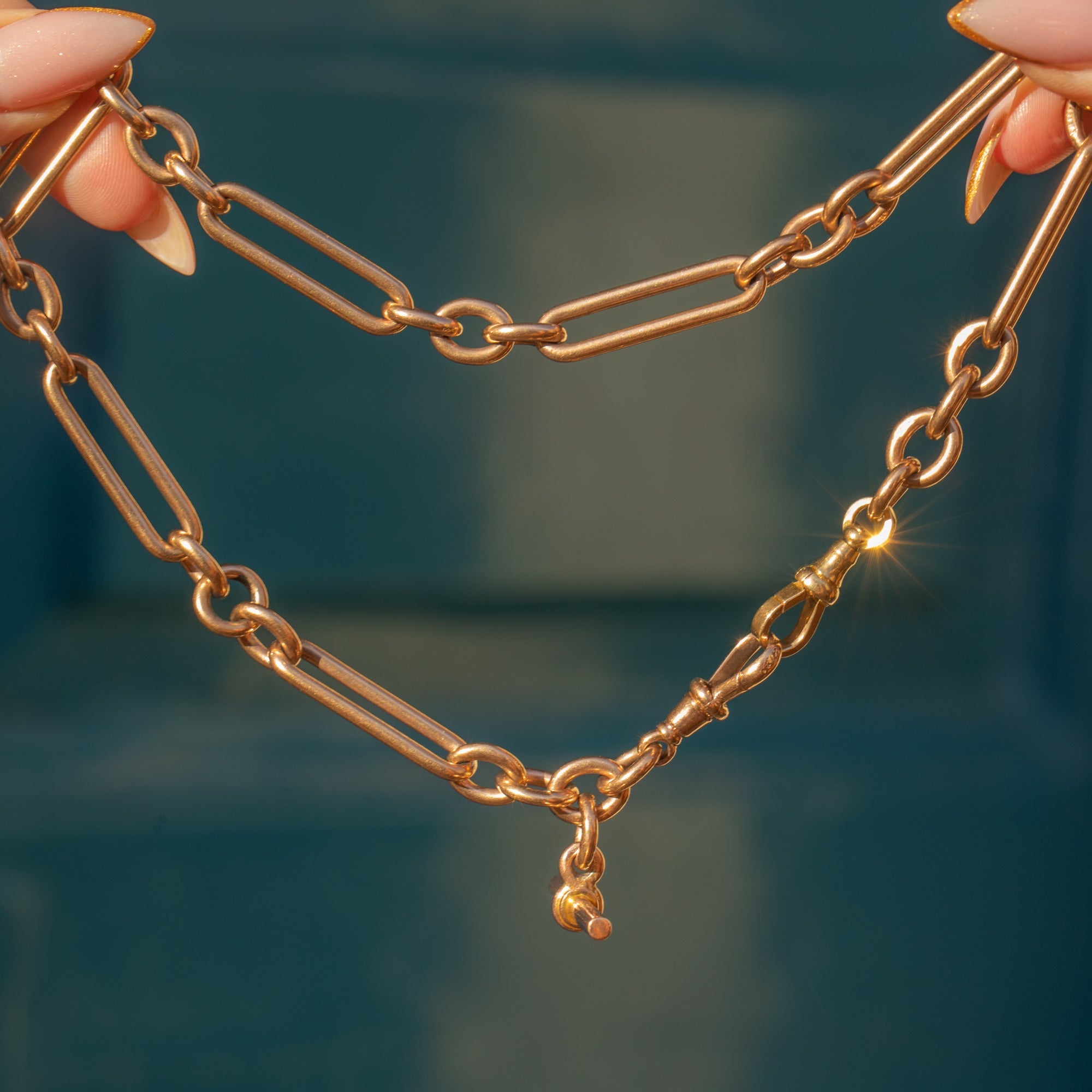 EXCELLENT: Thick, robust links in beautiful condition with no stretching or thinning. Both antique dog-clips are strong, functioning smoothly and closing securely. Crisp stamps throughout and a rich, even antique Gold glow. A remarkably well-preserved and fully wearable Victorian chain.