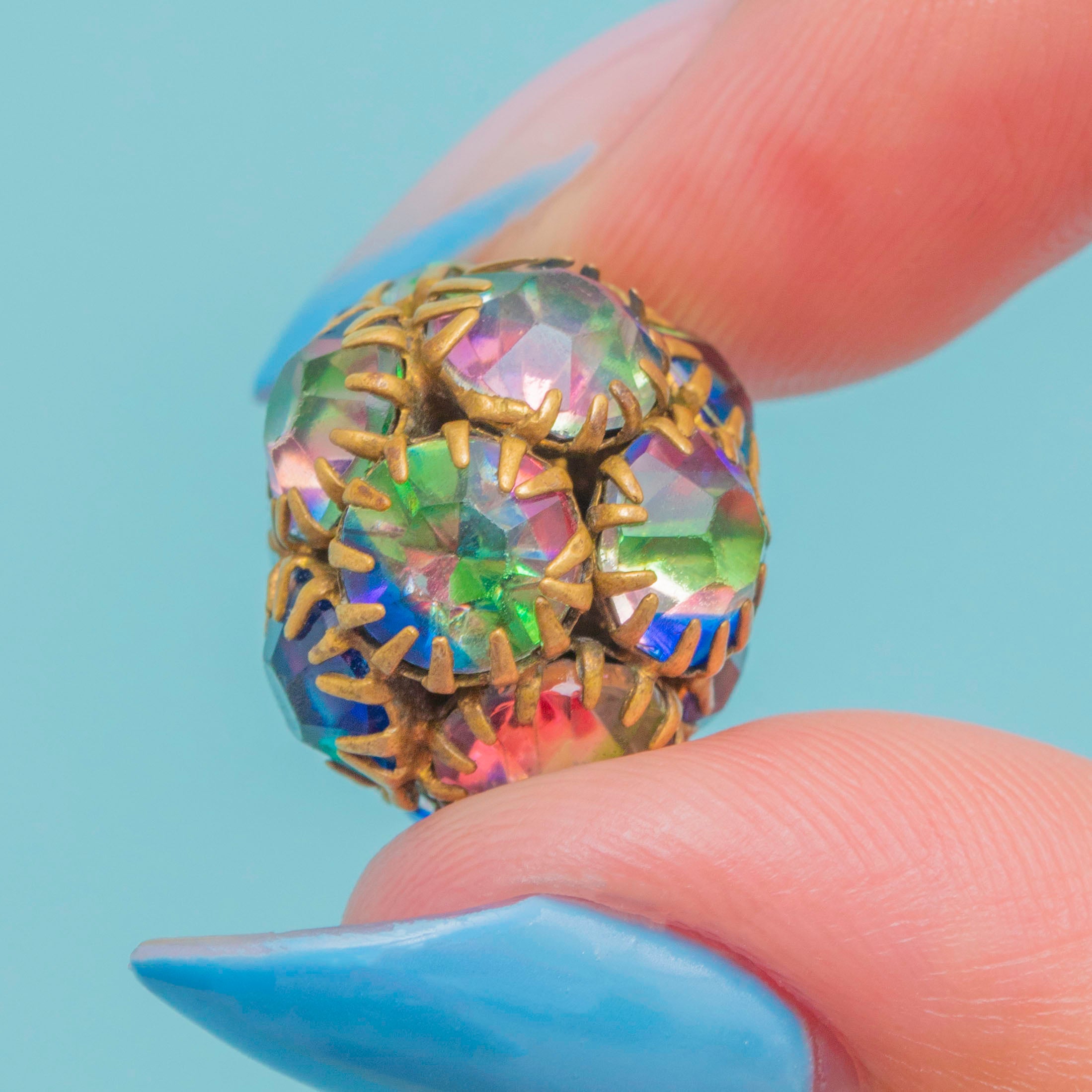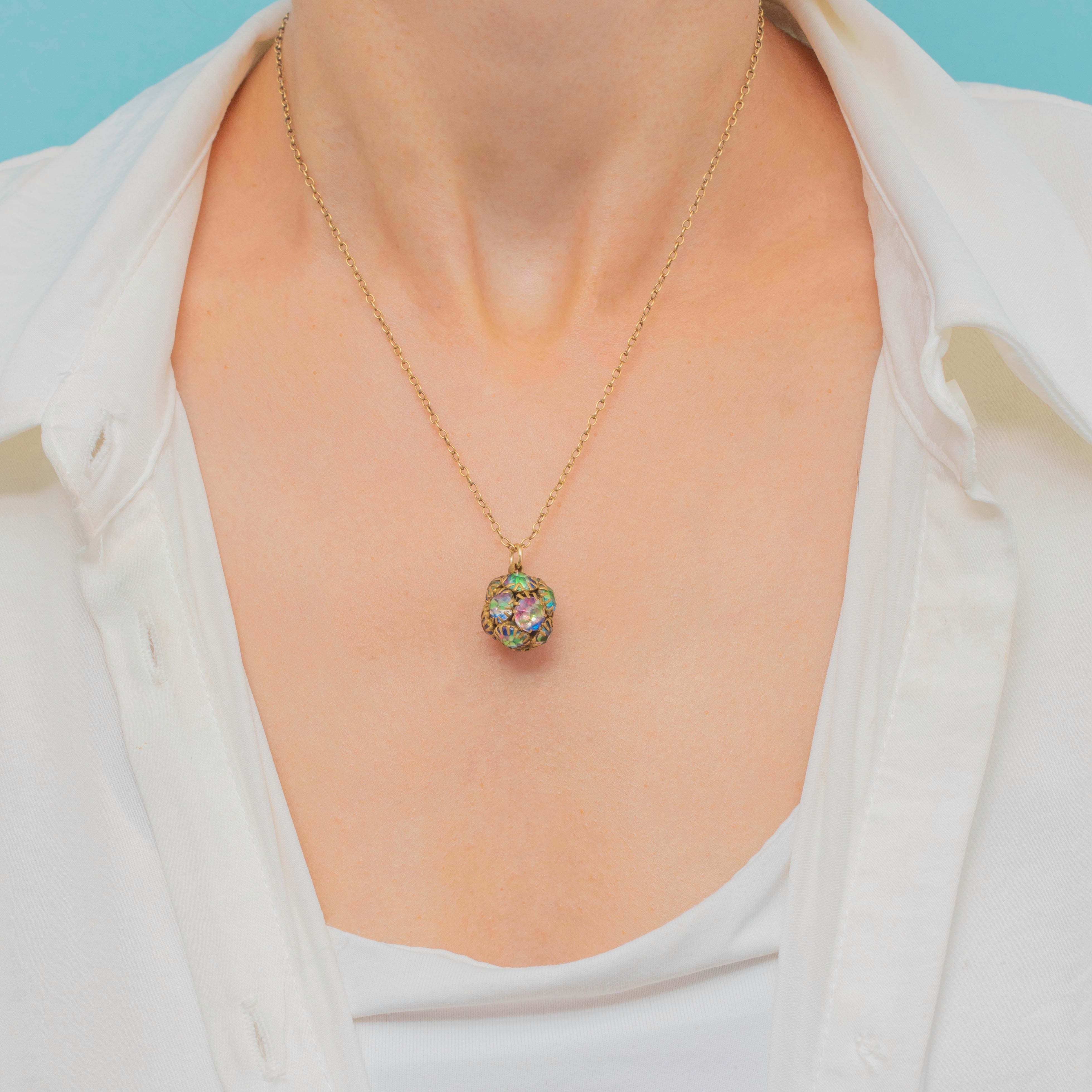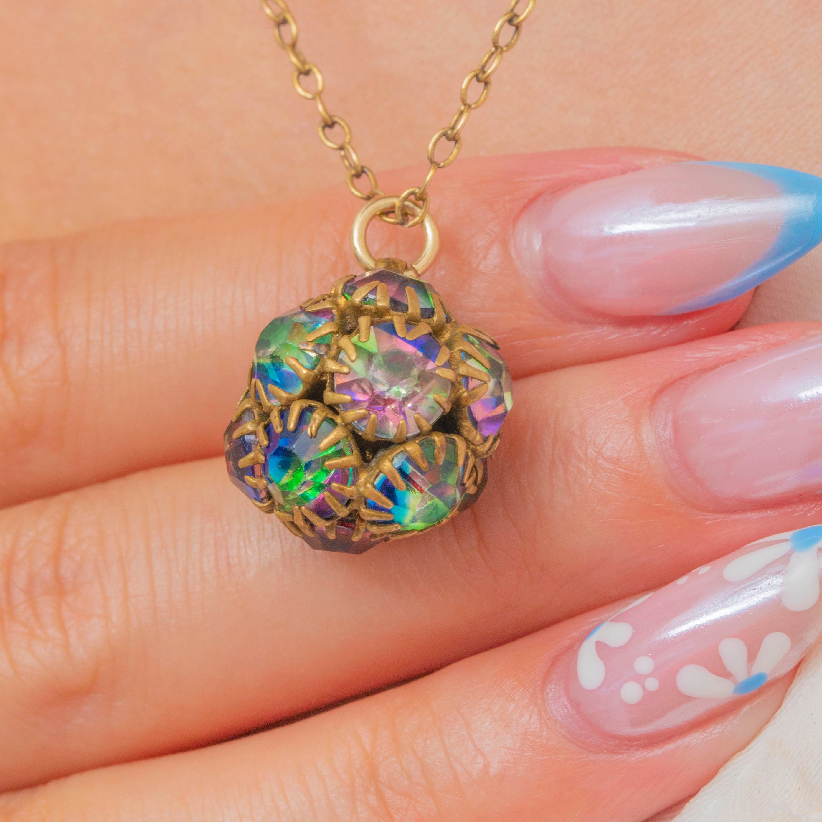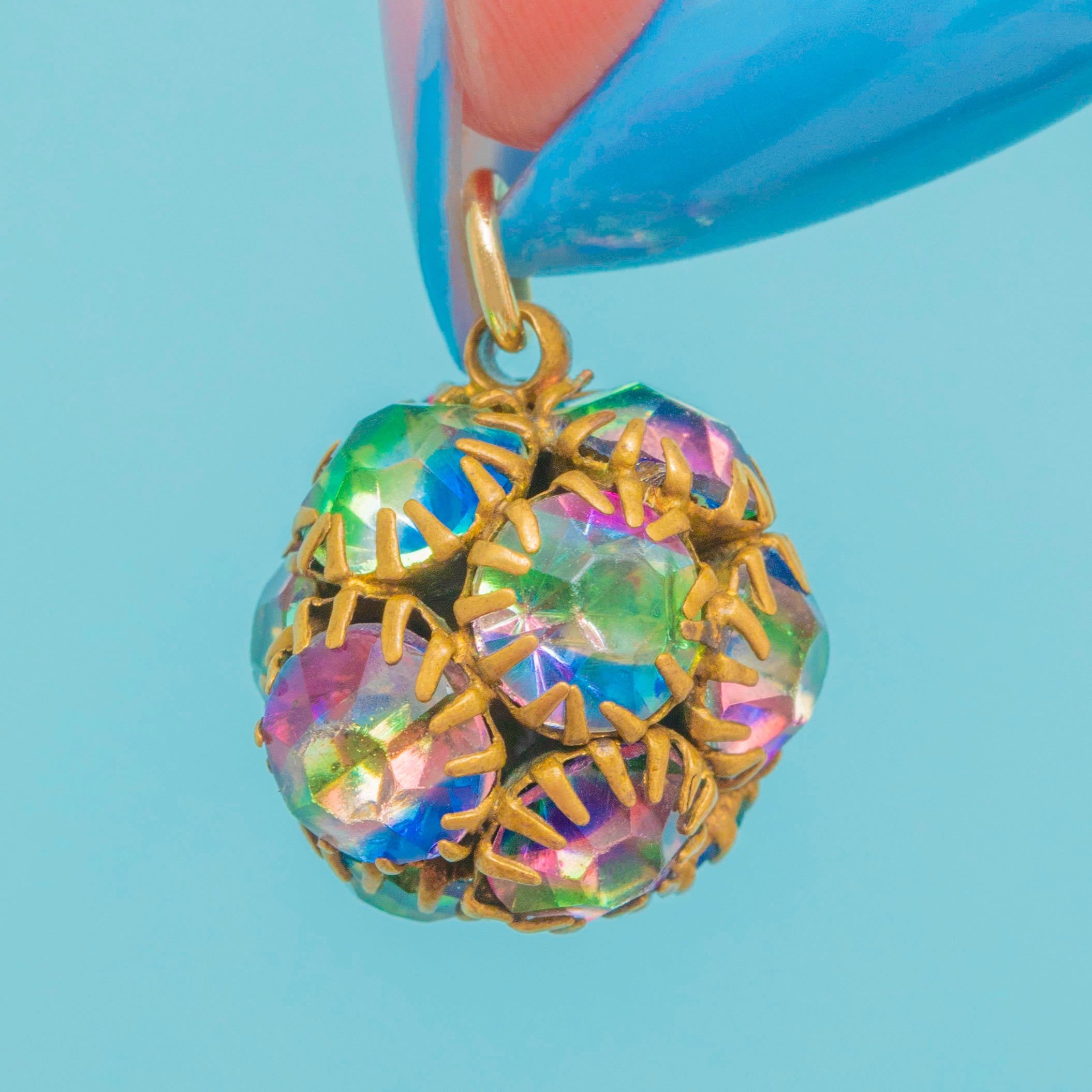 This Art Deco pendant is a rare little treasure! The spherical pendant is inlaid with vibrant Iris Glass, each hand-cut piece projecting bright splashes of pink, green and blue, embraced by stylistic Gold-toned metal claws.