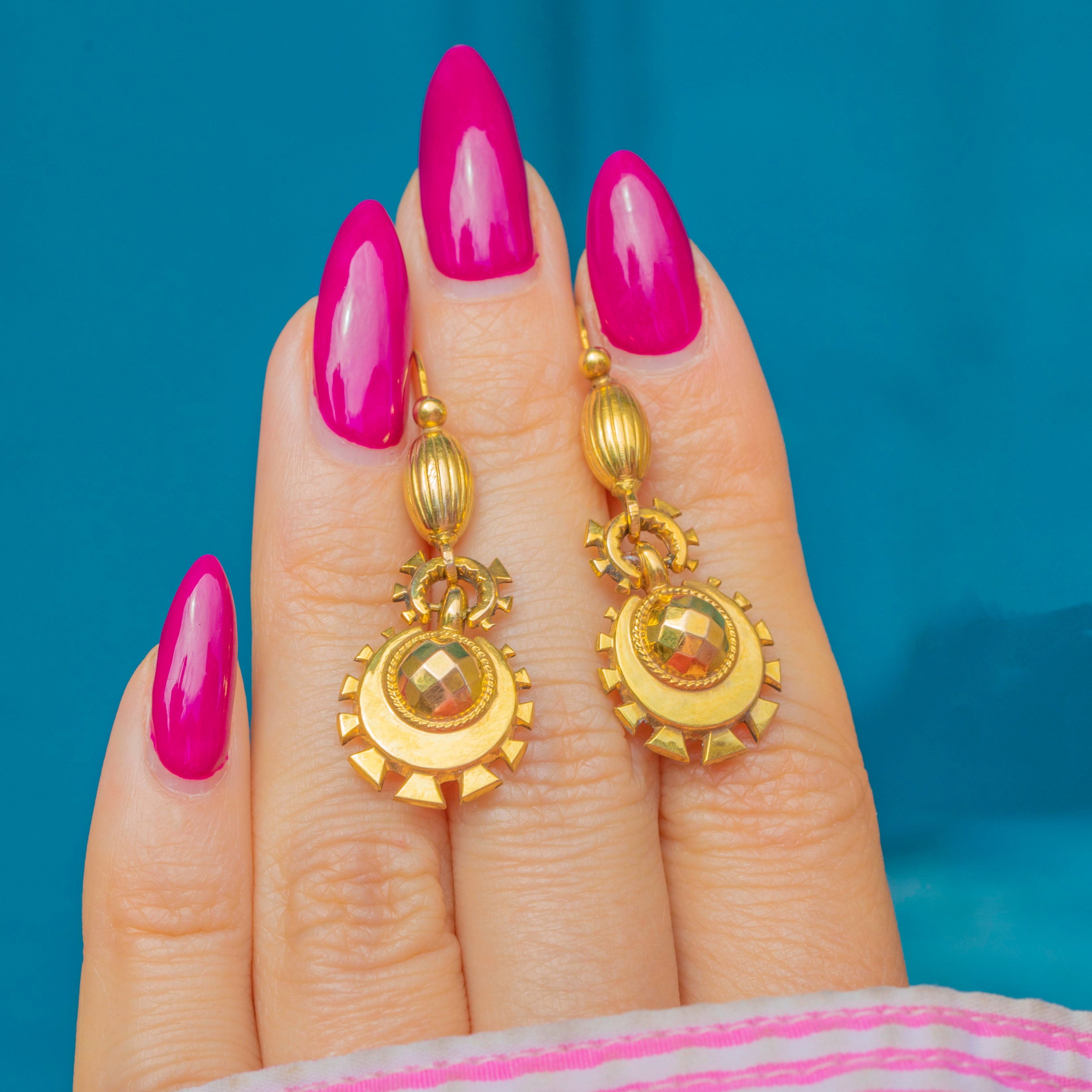 They are complete with a rare Victorian registration mark, dating these earrings to 14th May 1880. Radiating antique charm and dancing with movement as they suspend from your lobes, these glossy Gold Etruscan earrings are a wonderfully glamorous pair.