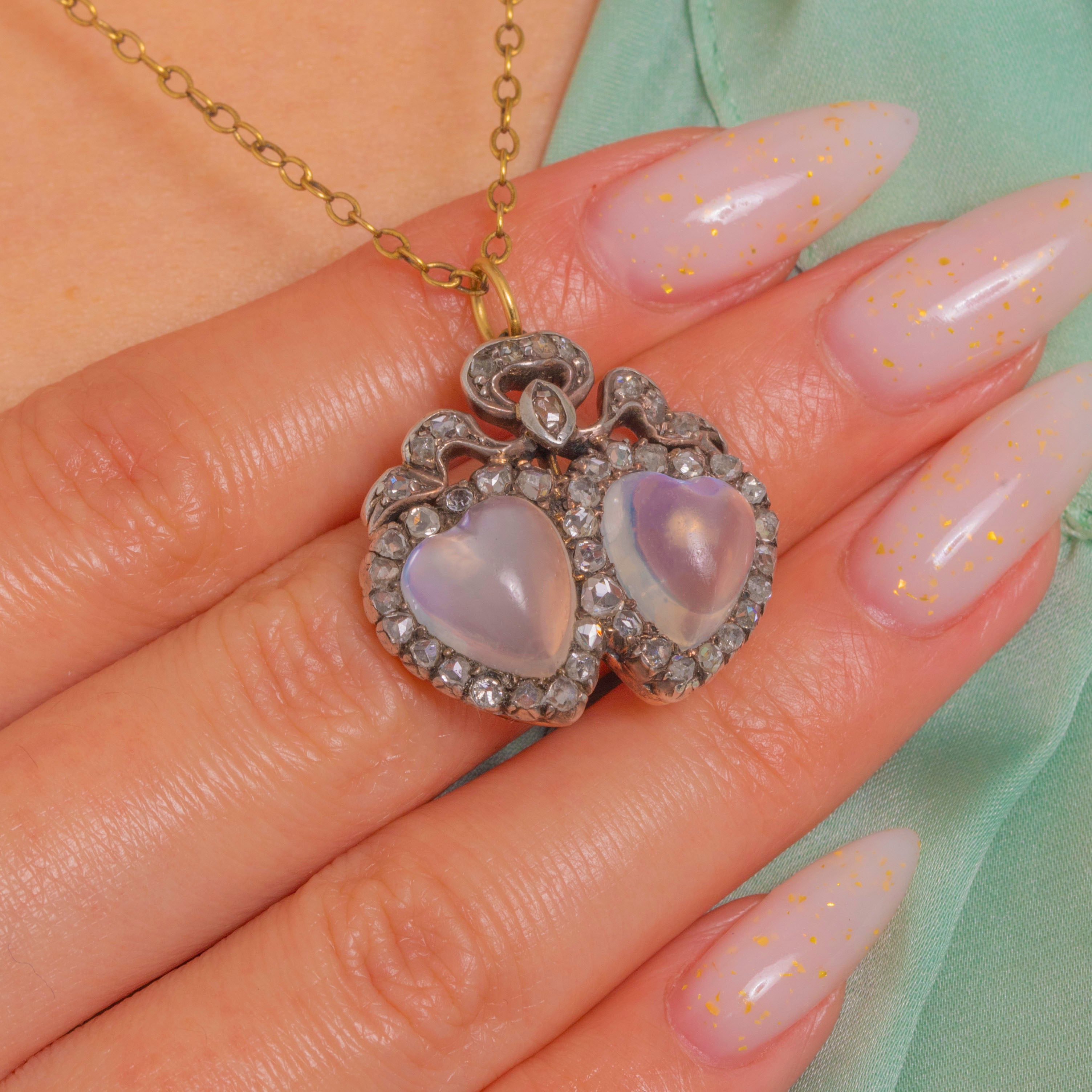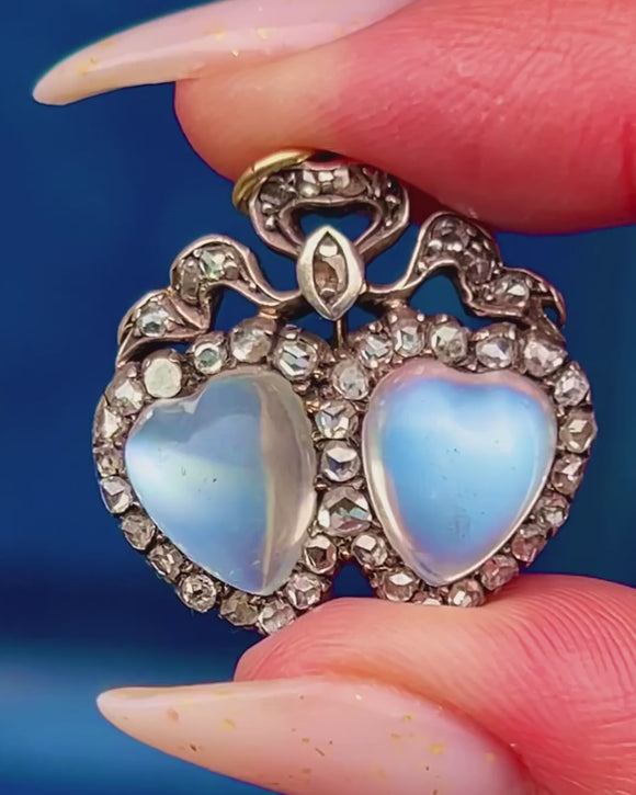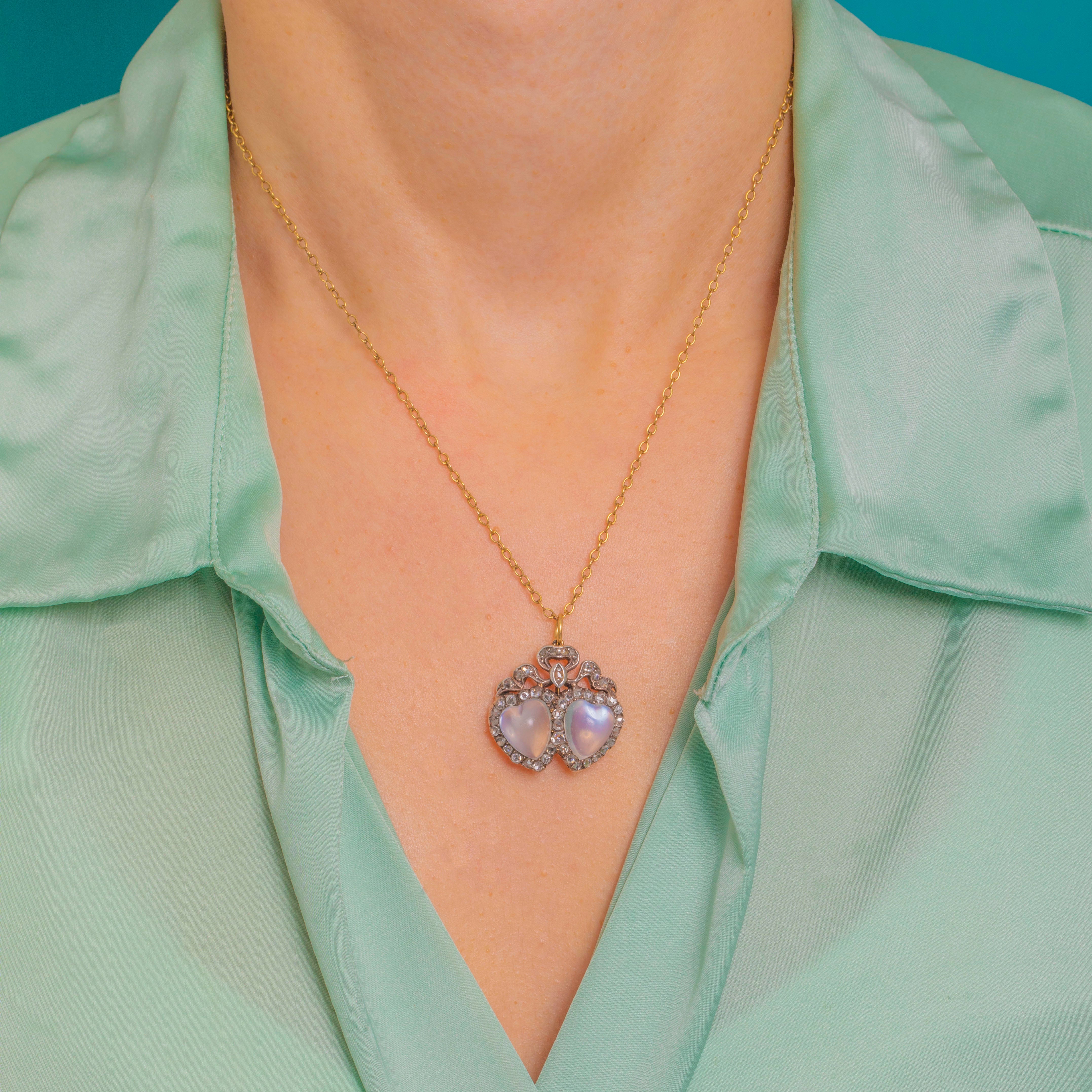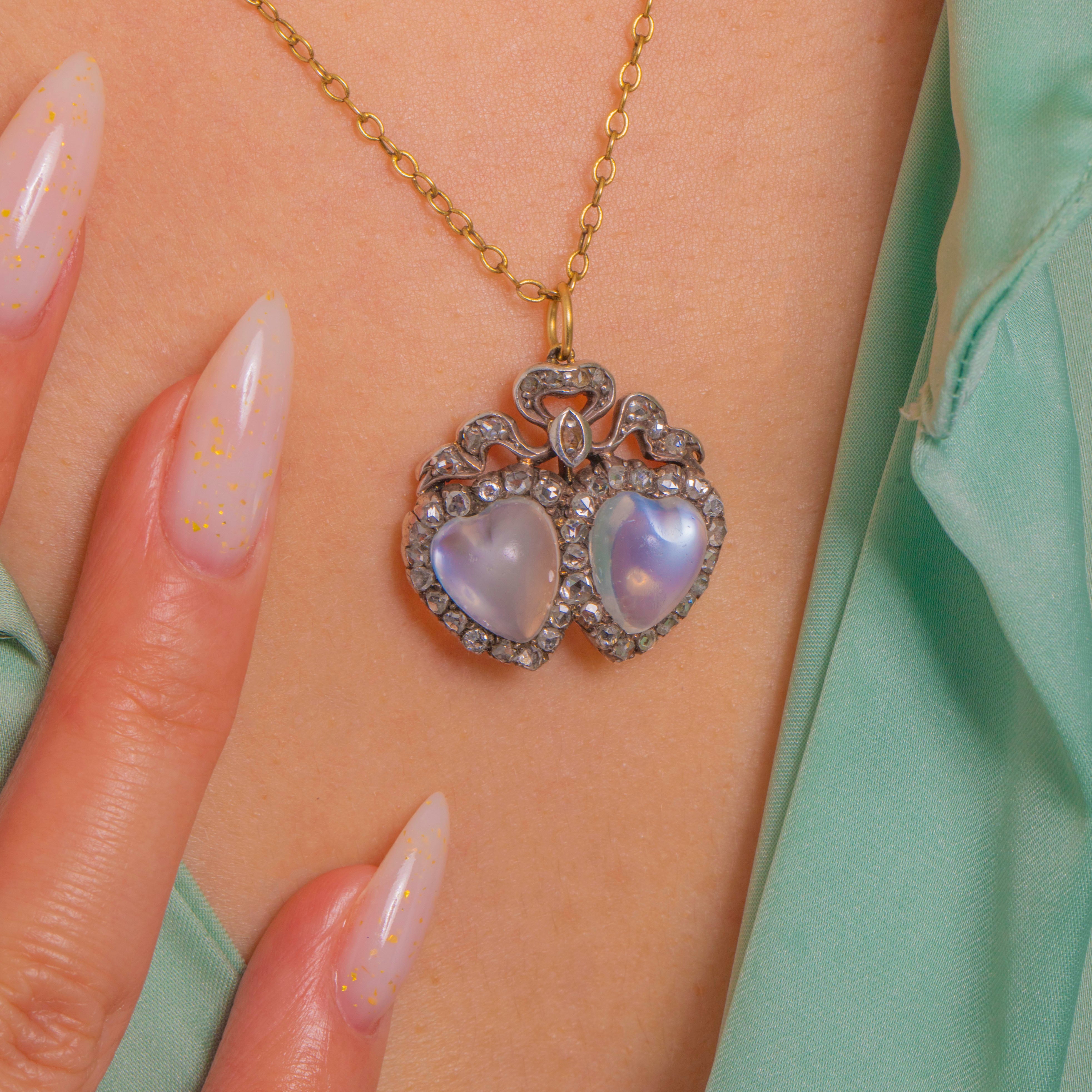 A quintessential token of Victorian romance, this double-heart and bow pendant pairs two luminous, hand-carved heart-shaped Moonstone cabochons with scintillating rose-cut Diamond halos. The hearts are crowned by a graceful ribbon bow accented with a tiny navette Diamond, creating a delicately ornate silhouette that feels both sentimental and luxuriously refined.