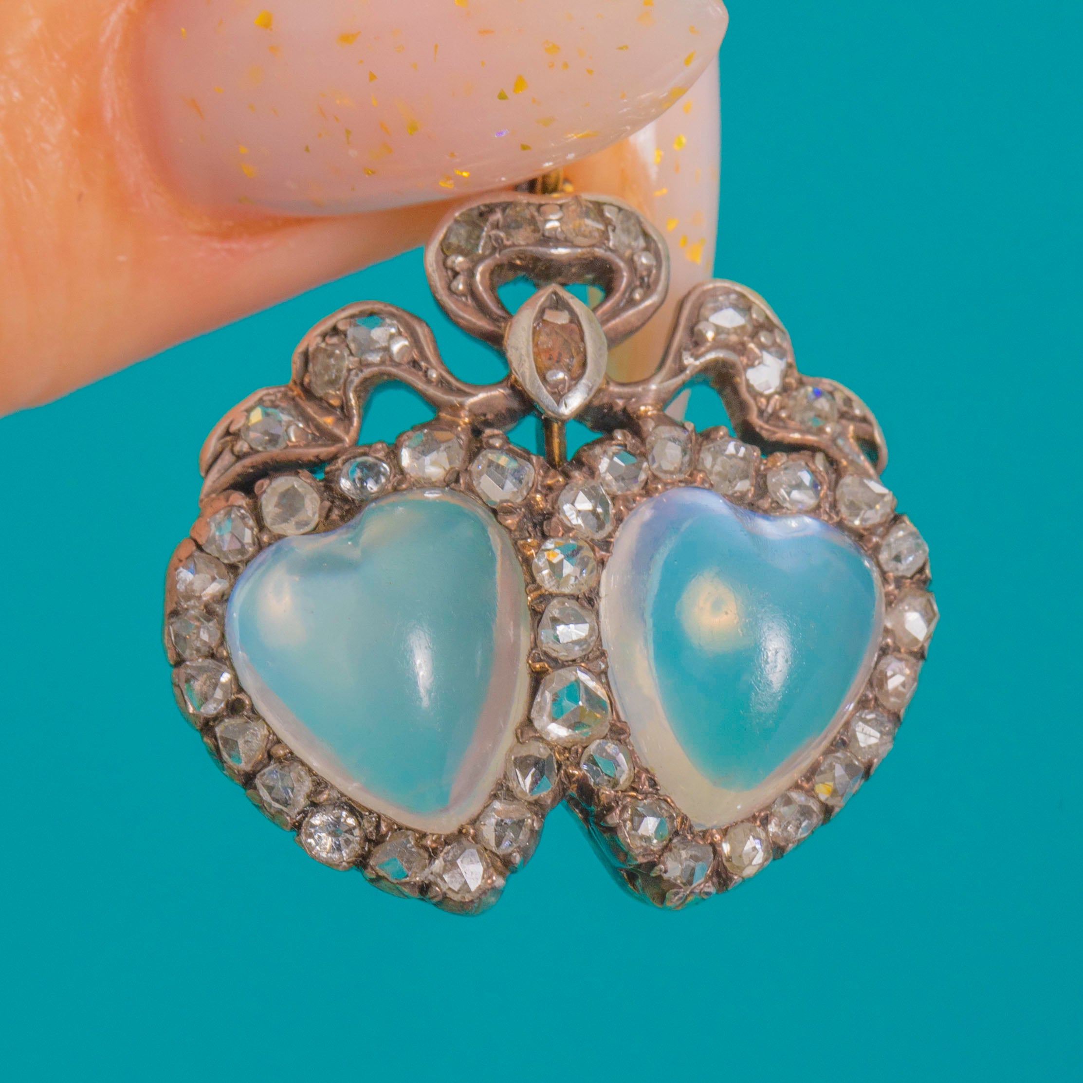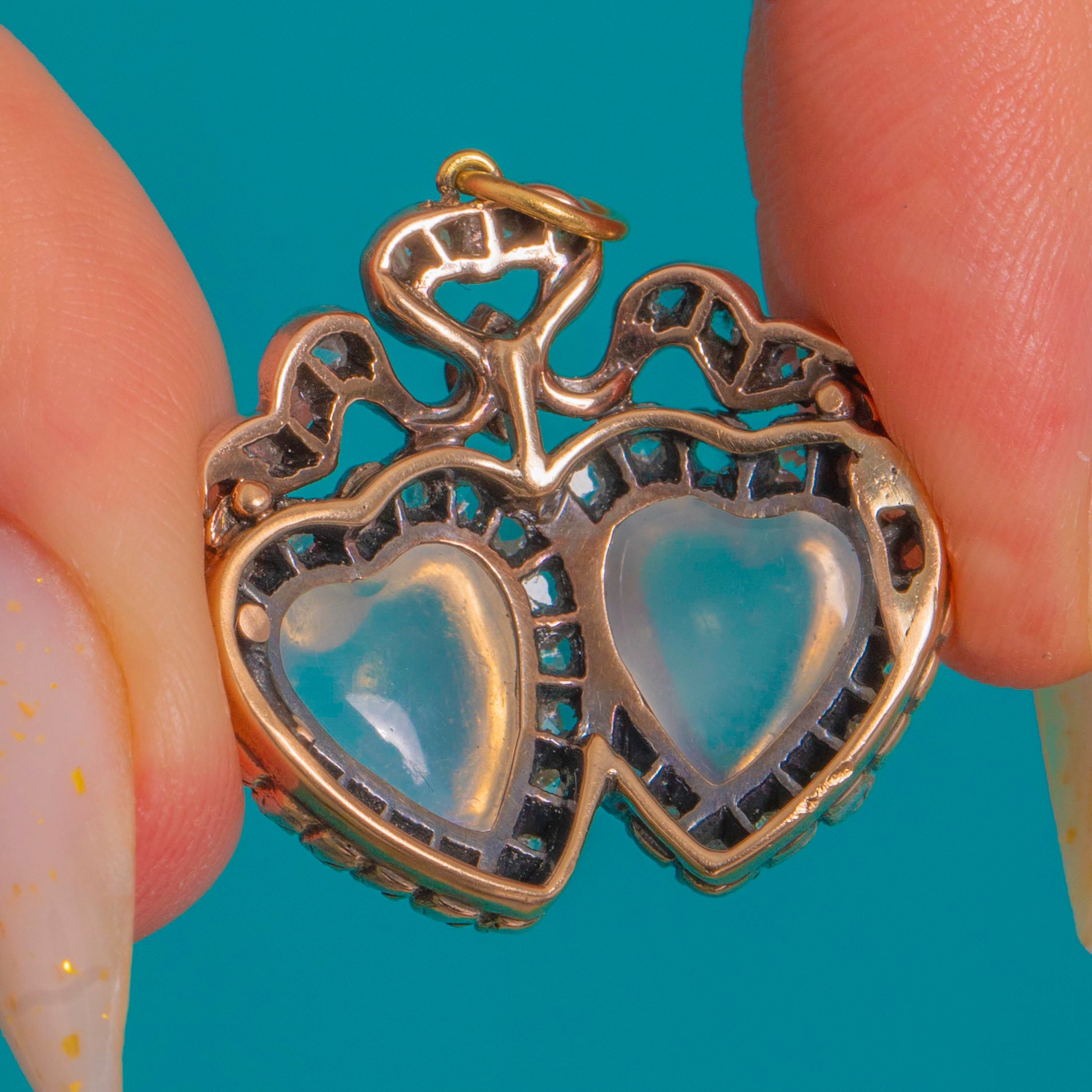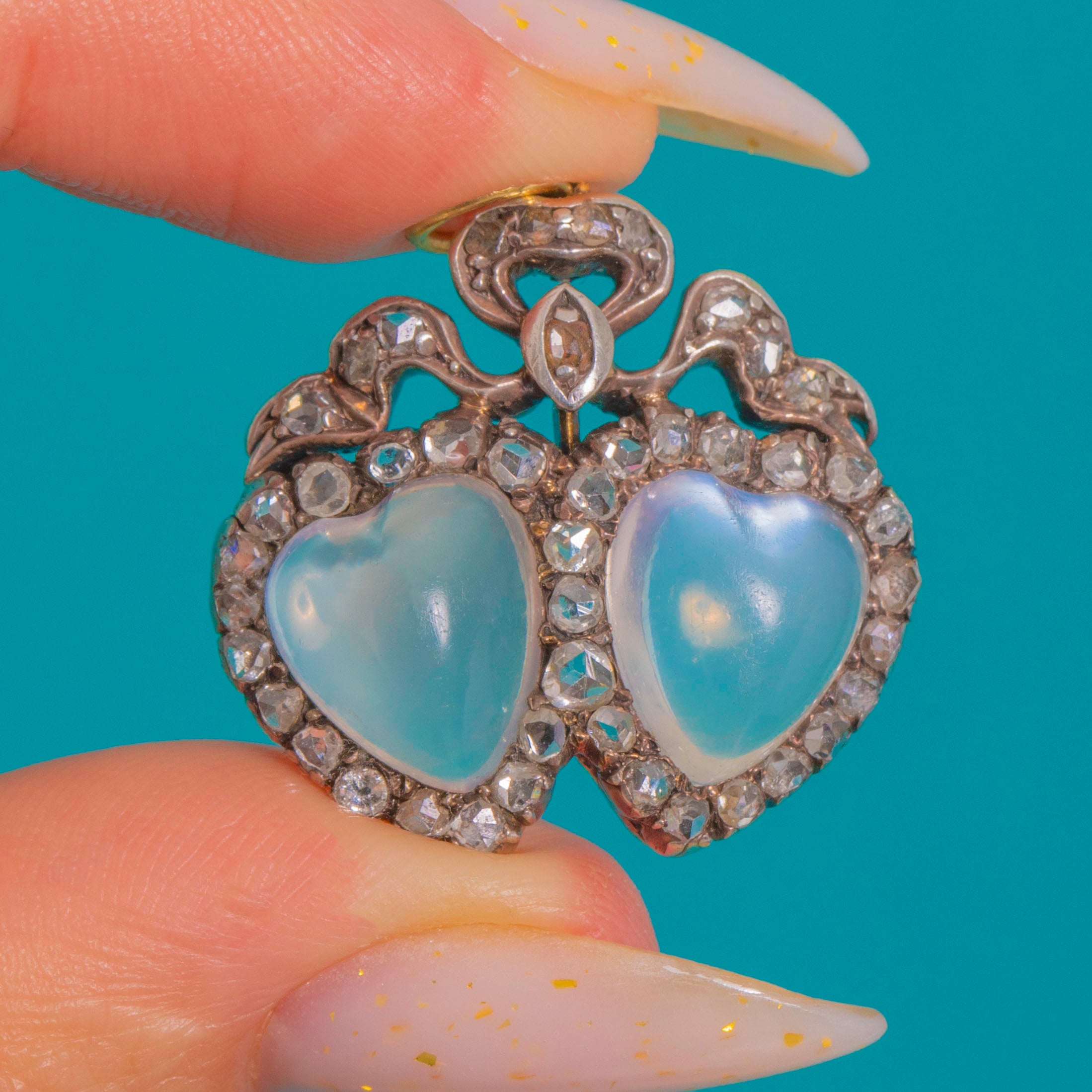 A quintessential token of Victorian romance, this double-heart and bow pendant pairs two luminous, hand-carved heart-shaped Moonstone cabochons with scintillating rose-cut Diamond halos. The hearts are crowned by a graceful ribbon bow accented with a tiny navette Diamond, creating a delicately ornate silhouette that feels both sentimental and luxuriously refined.
