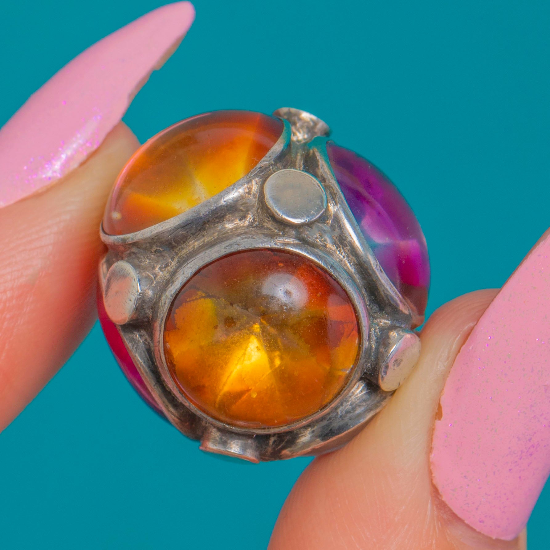 A rare Victorian orb pendant crafted in Sterling Silver and set with foiled cabochons of Amethyst, Citrine and Rock Crystal. The sculptural, multi-panel sphere is defined by raised closed-back bezels and neat applied disc accents, creating a bold, architectural silhouette with captivating colour play.