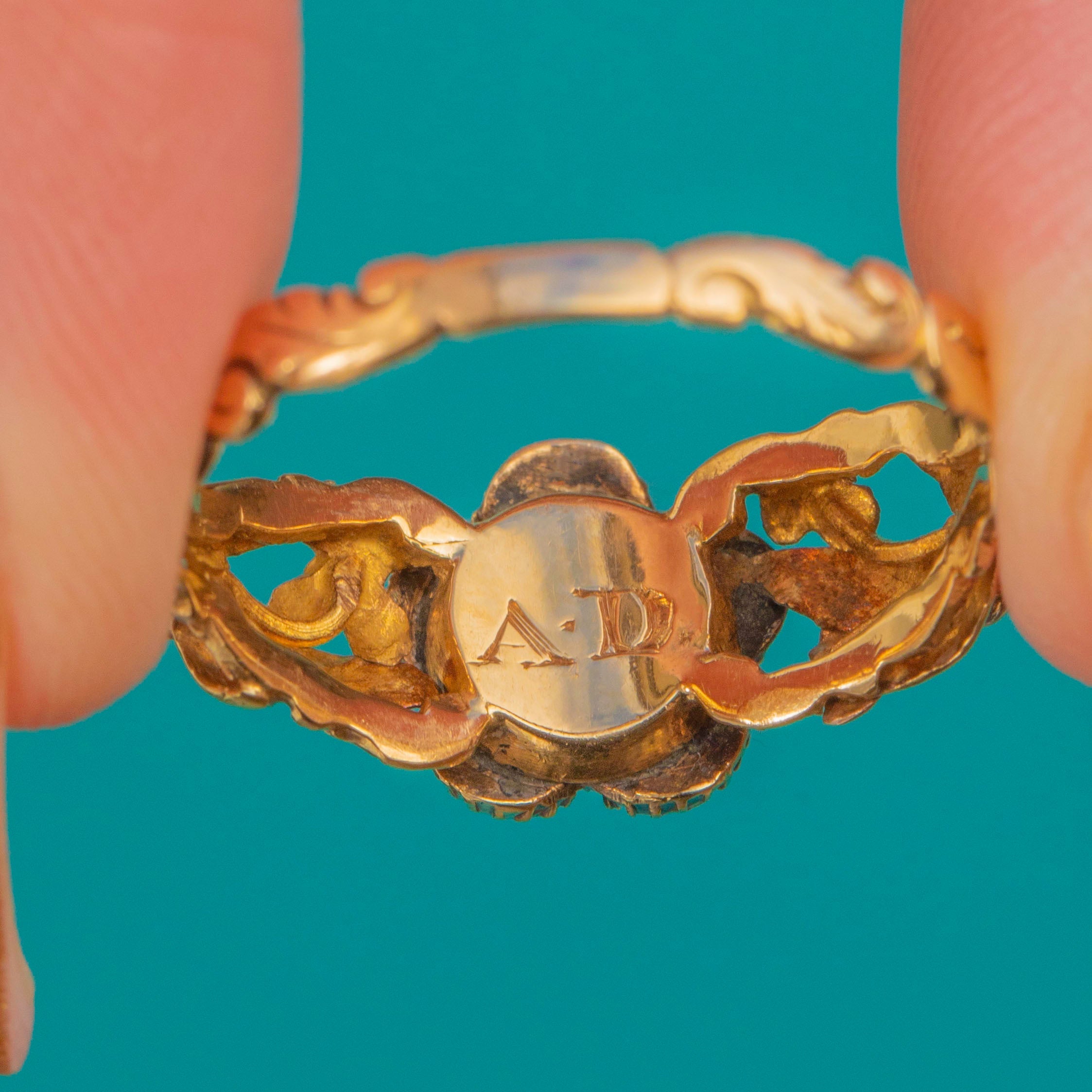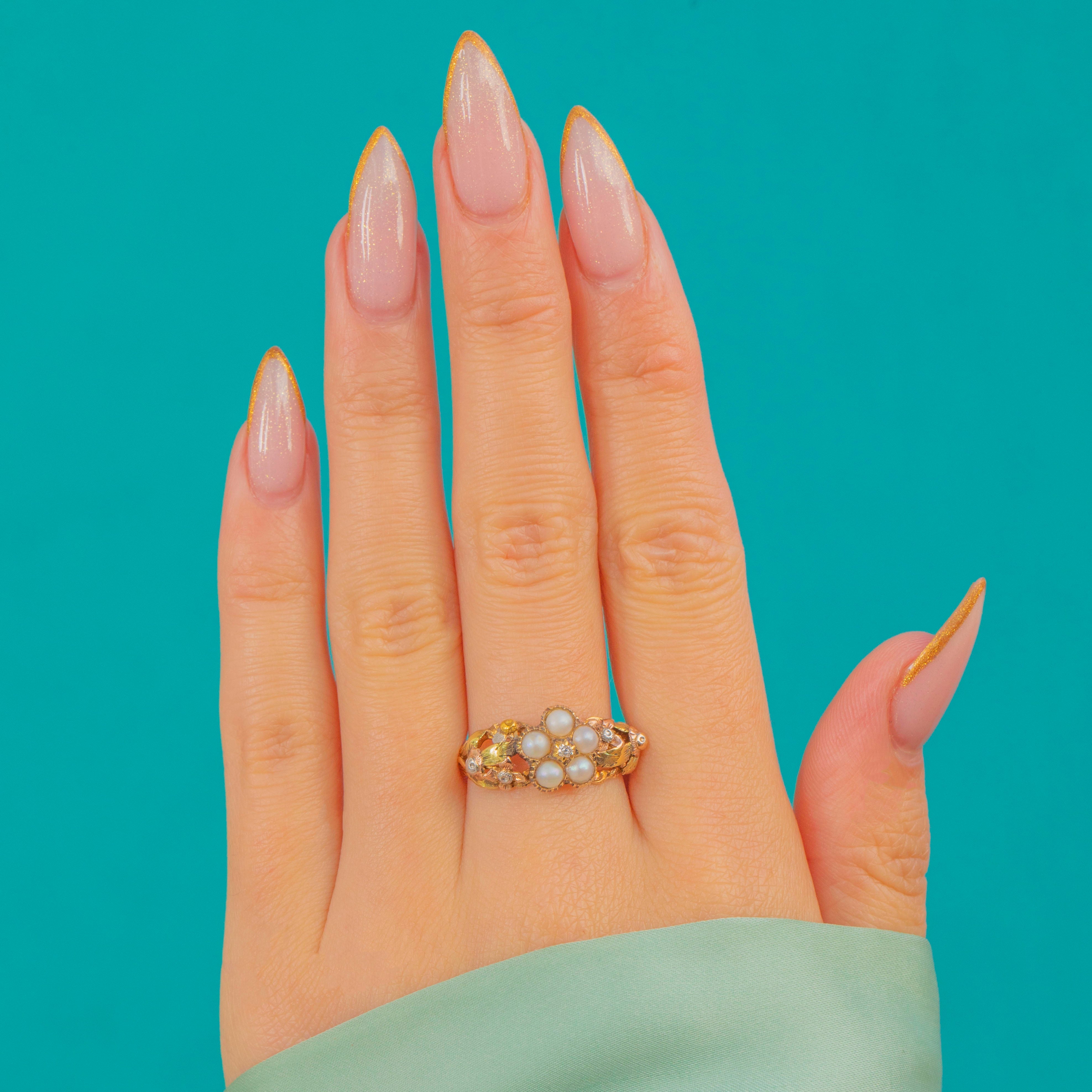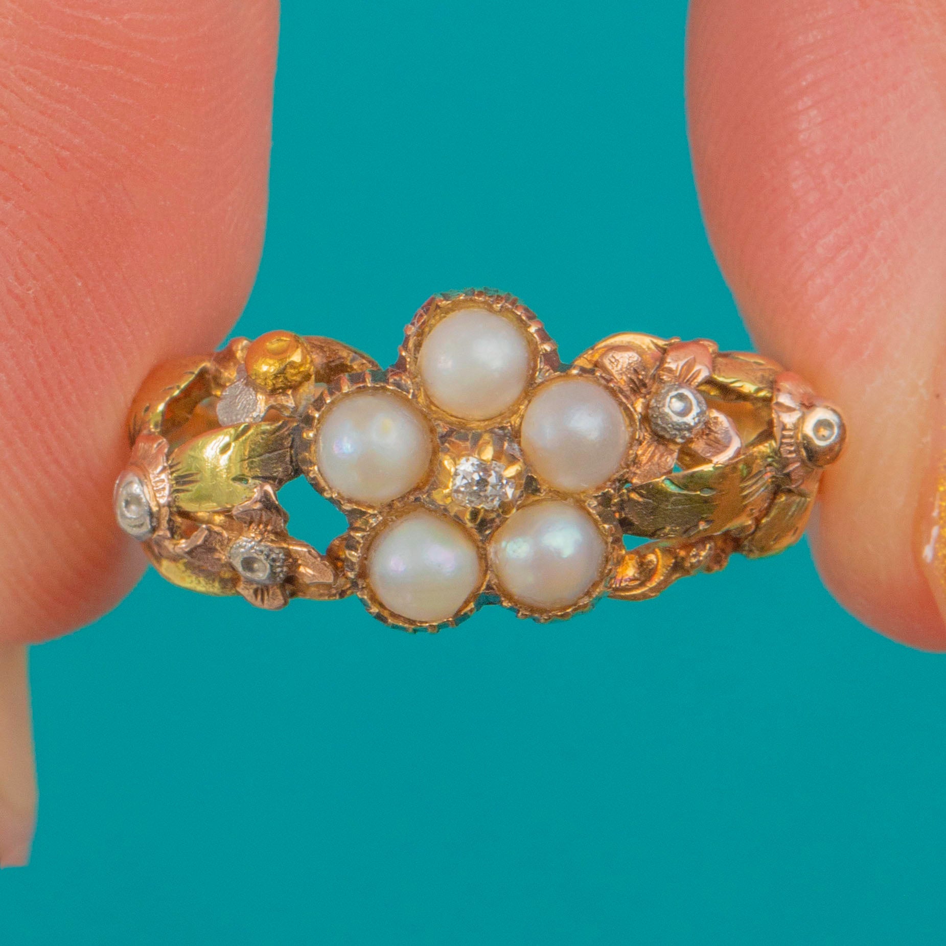 A beautiful early 19th-century cluster ring from the late Regency Georgian era, c.1830. Crafted in rich 18ct Gold with both Rose and Yellow tones, it features a romantic Pearl cluster centred by a tiny antique Diamond. The soft glow of the Pearls and the warm antique Gold give this ring a delicate, refined presence typical of Georgian jewels.