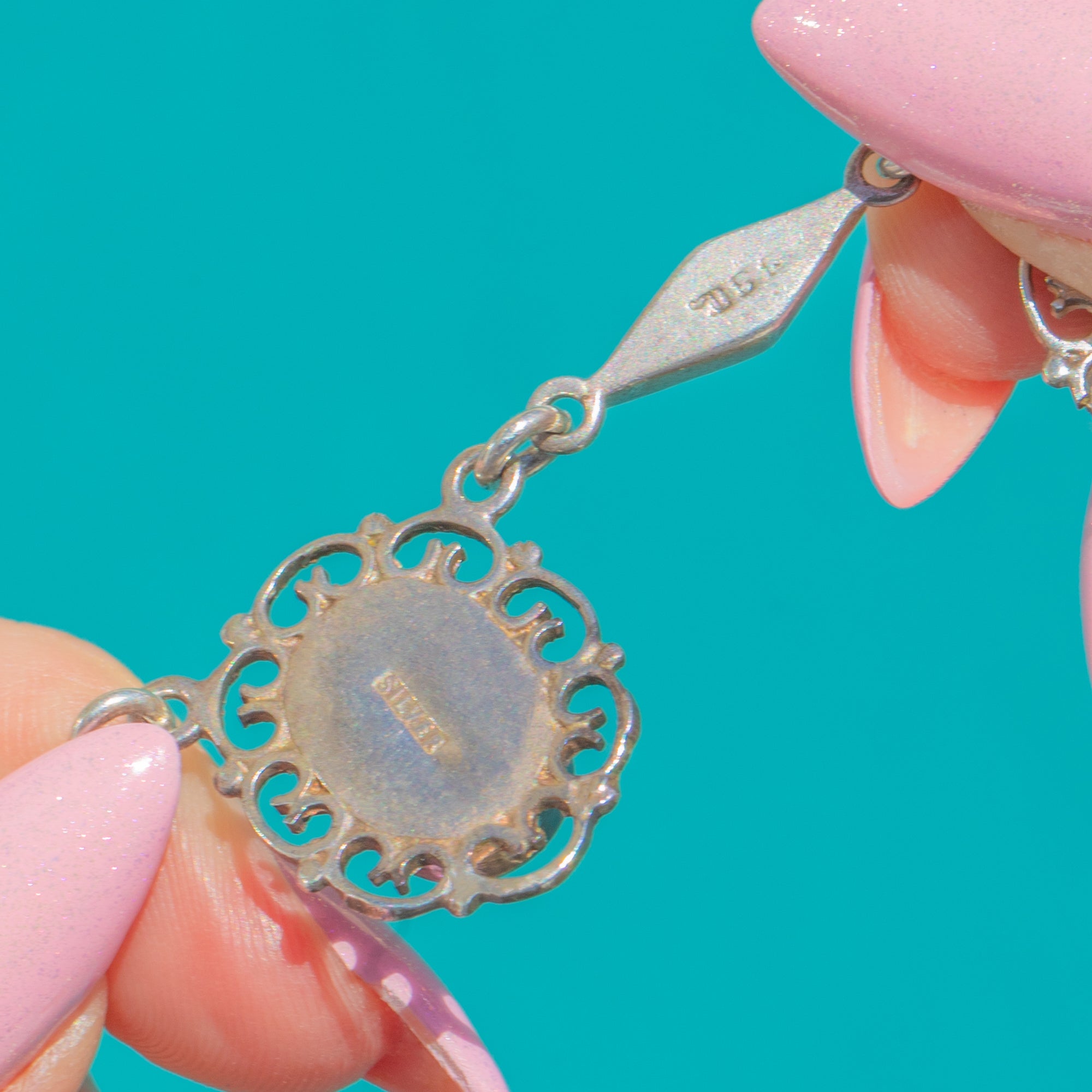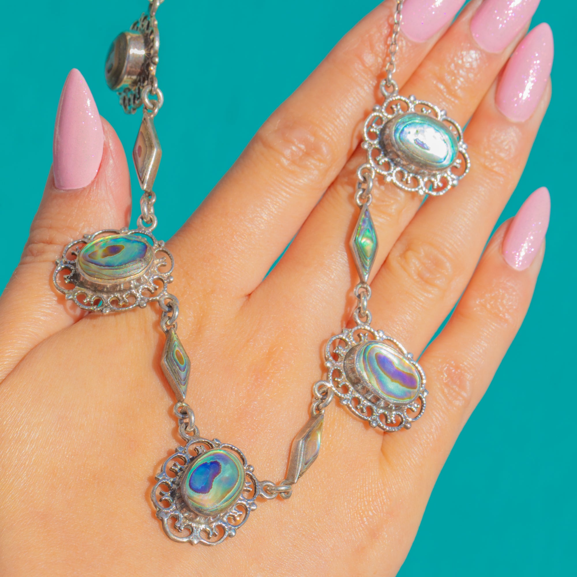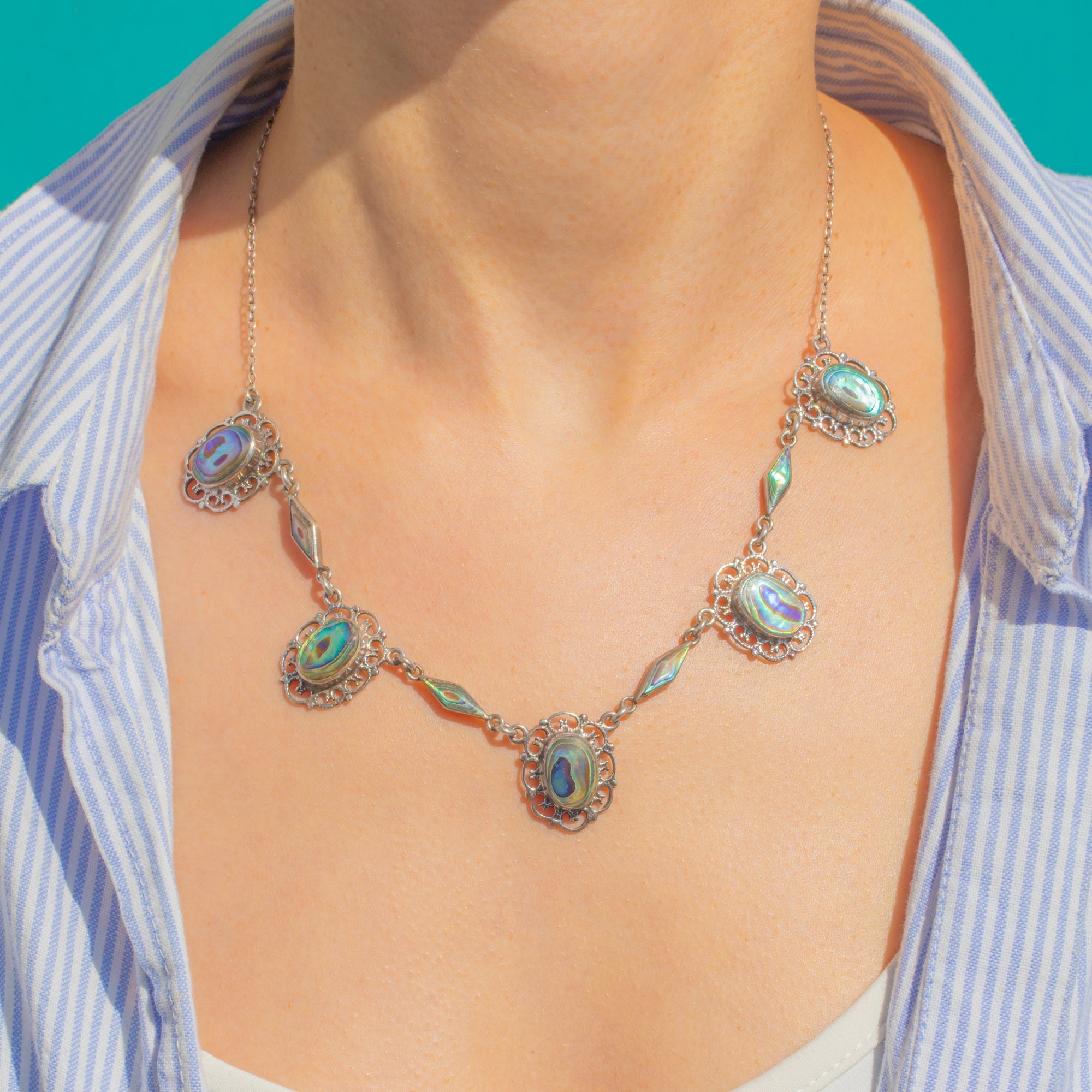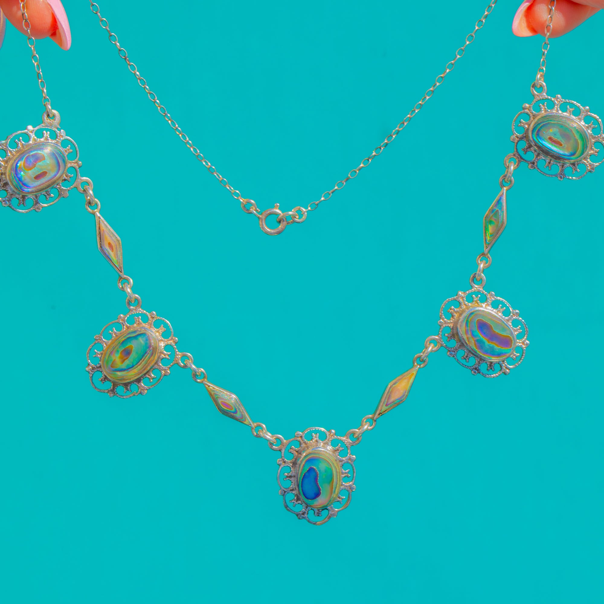 Shimmering with hypnotic peacock hues, this Vintage Abalone Shell necklace is a graceful celebration of colour and light. Each domed cabochon flashes oceanic blues, greens and purples, nestled within ornate openwork filigree frames and paired with alternating lozenge links for a rhythmic, elegant flow around the neckline.
