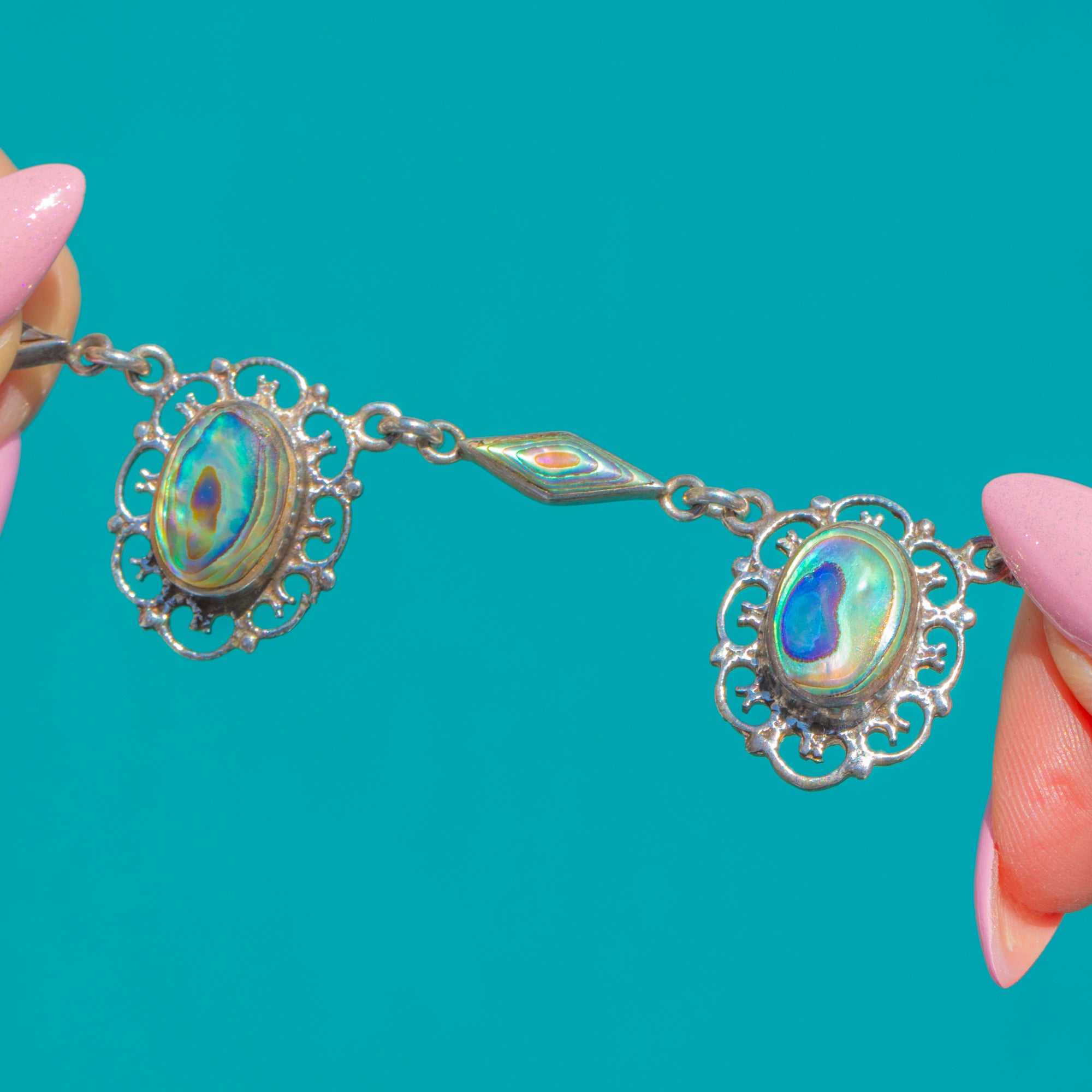 EXCELLENT: Abalone Shell cabochons are glossy and vibrant with no obvious chips or abrasions. Silver shows light surface wear and a gentle patina in the recesses, consistent with age. Articulation and settings appear secure with wear commensurate with careful use.