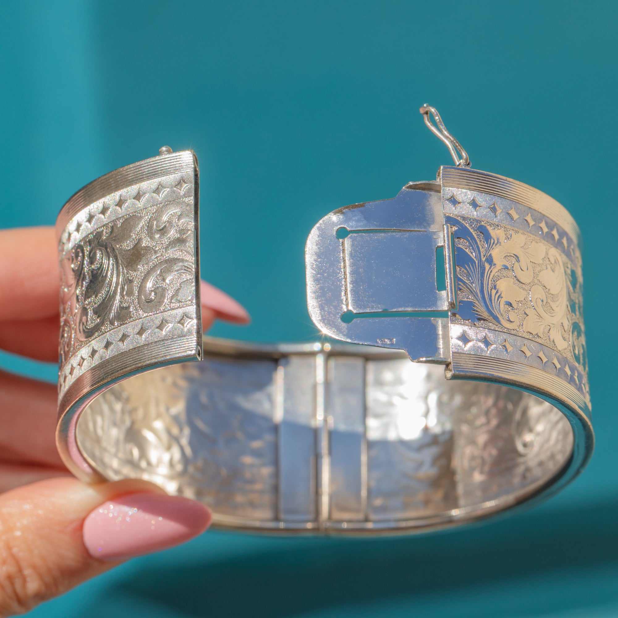 VERY GOOD: This Silver engraved cuff bangle is in very good condition. The Silver is bright and the engravings have all remained crisp, with a light patina having accrued making the details pop. One side looks slightly flatter from previously being misshapen, but the bangle still sits comfortably around the wrist. With a secure clasp, you can wear this vintage Silver bangle confidently!