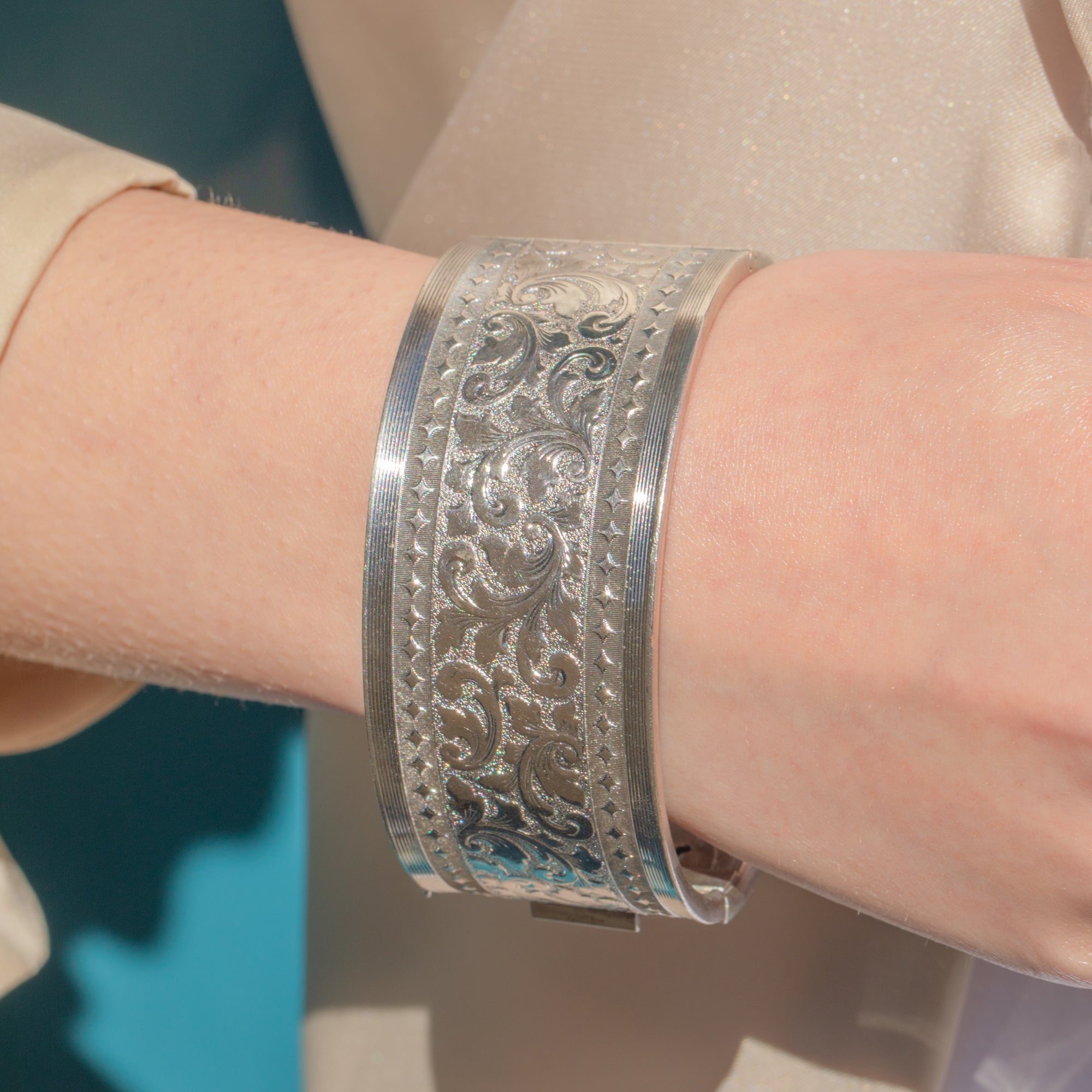This Silver engraved cuff bangle will become an everyday essential! Intricately engraved floral details span the entire circumference of this vintage bangle, with sweeping lines that catch the light beautifully.