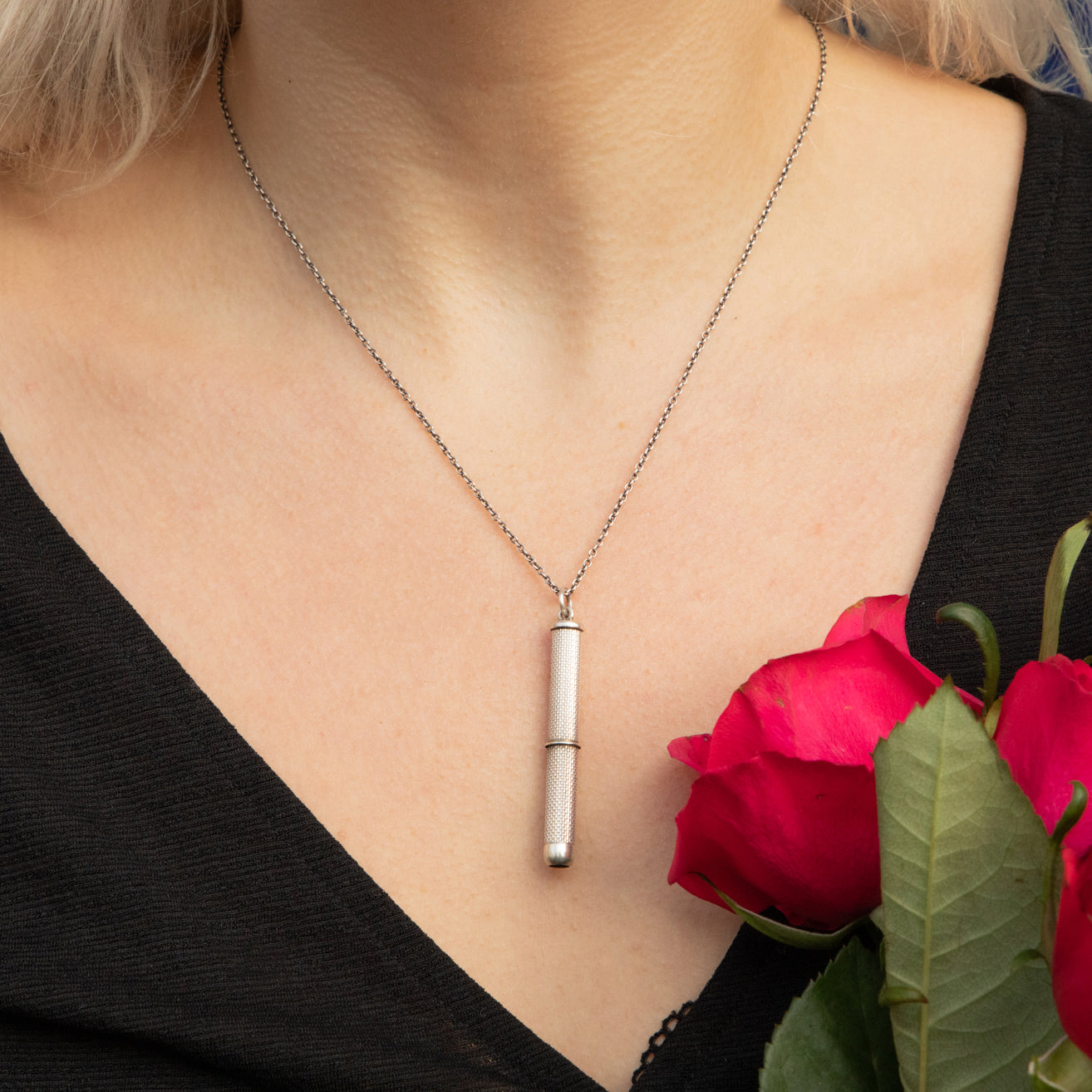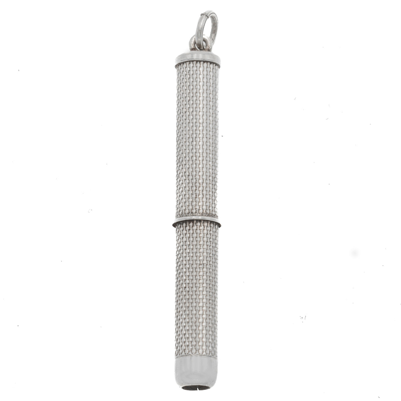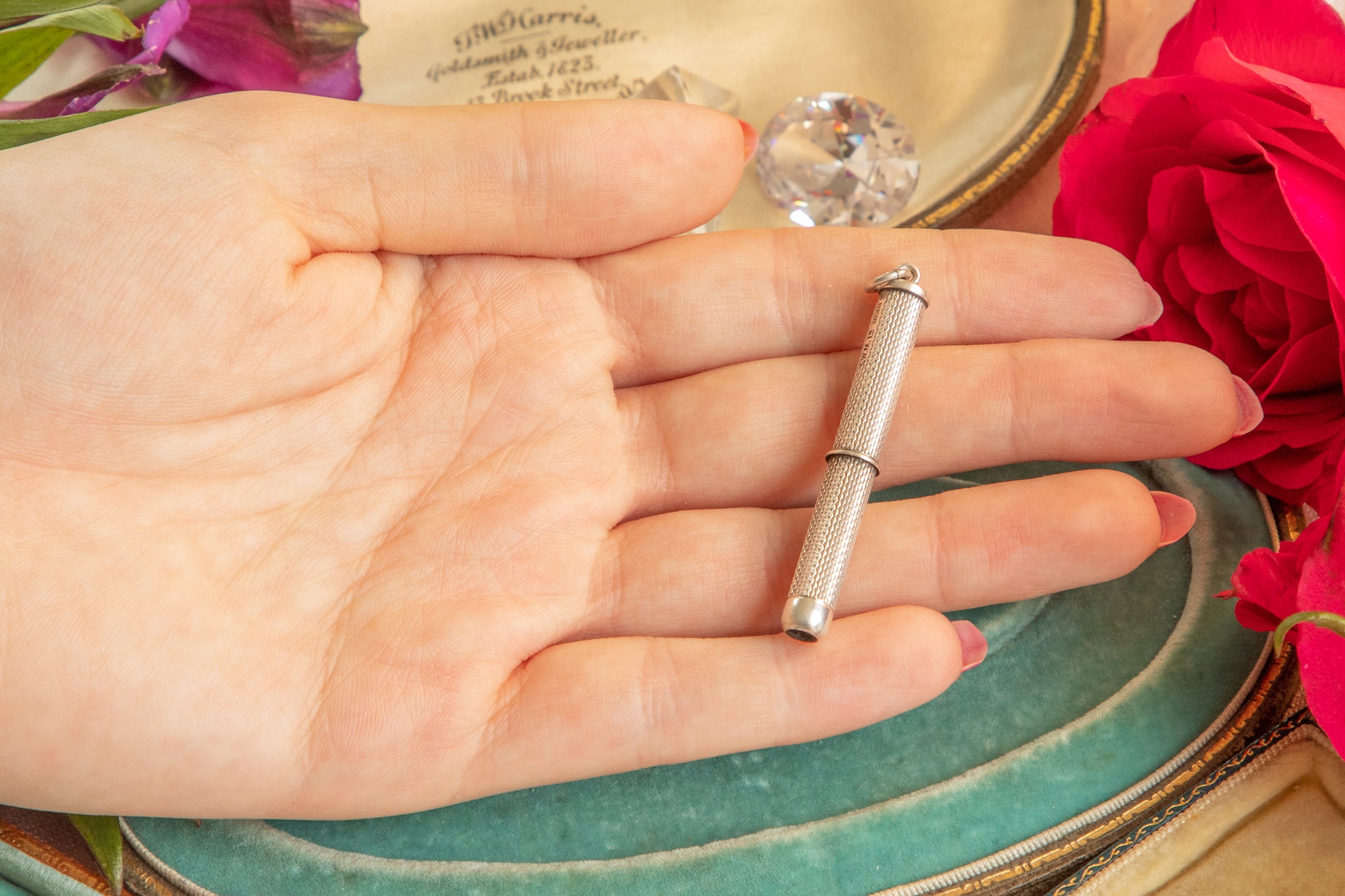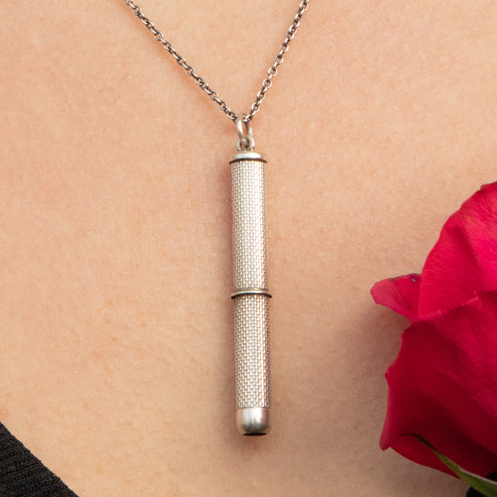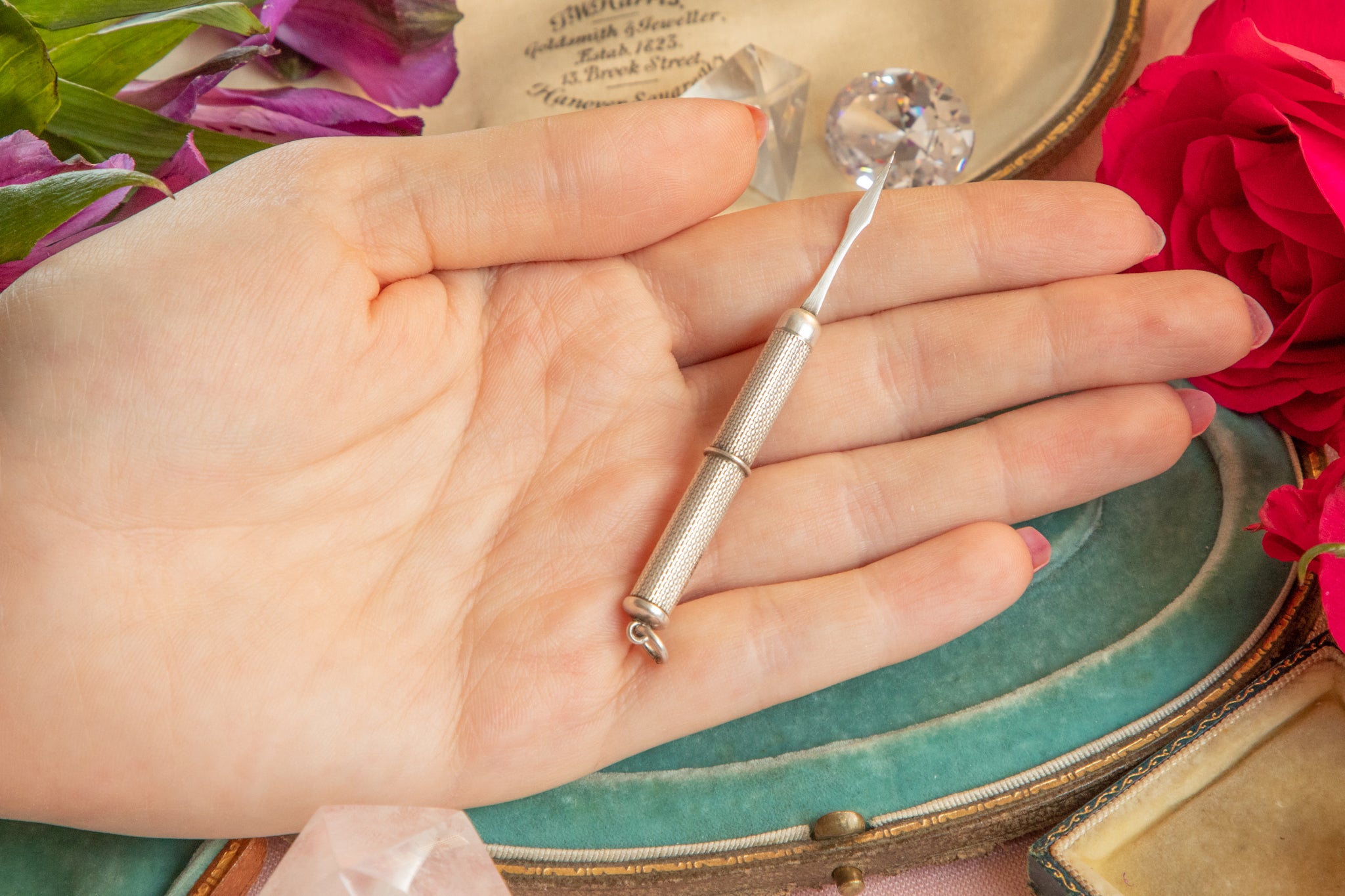 EXCELLENT. This Silver engraved toothpick pendant is in immaculate condition. The toothpick itself remains very sharp indeed, and the Silver engraved design is strong. Attached securely to a Silver jump ring, you can wear her with confidence. The Silver remains bright and unharmed throughout, and her twisting mechanism is in fine working order, so she is ready to be admired by all!