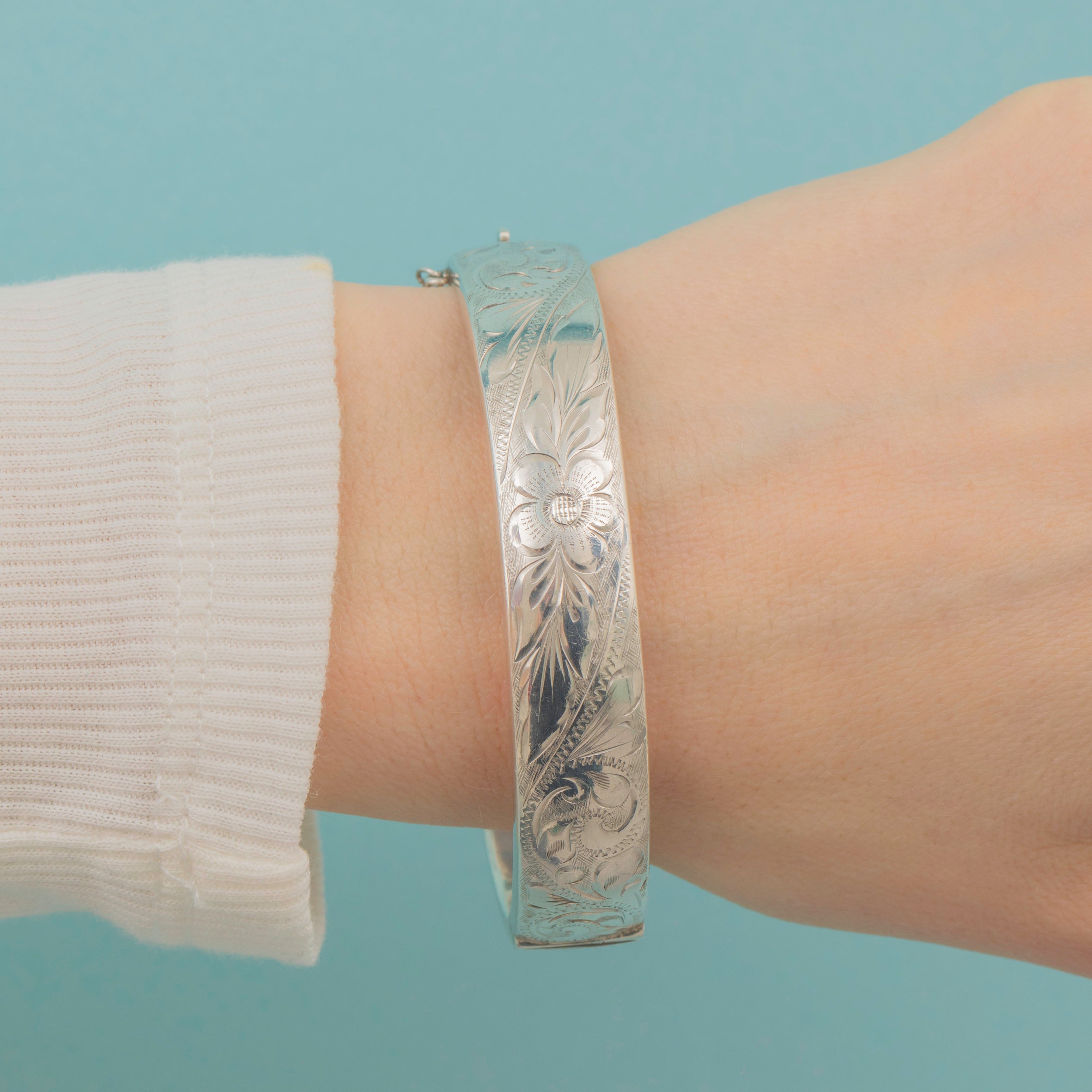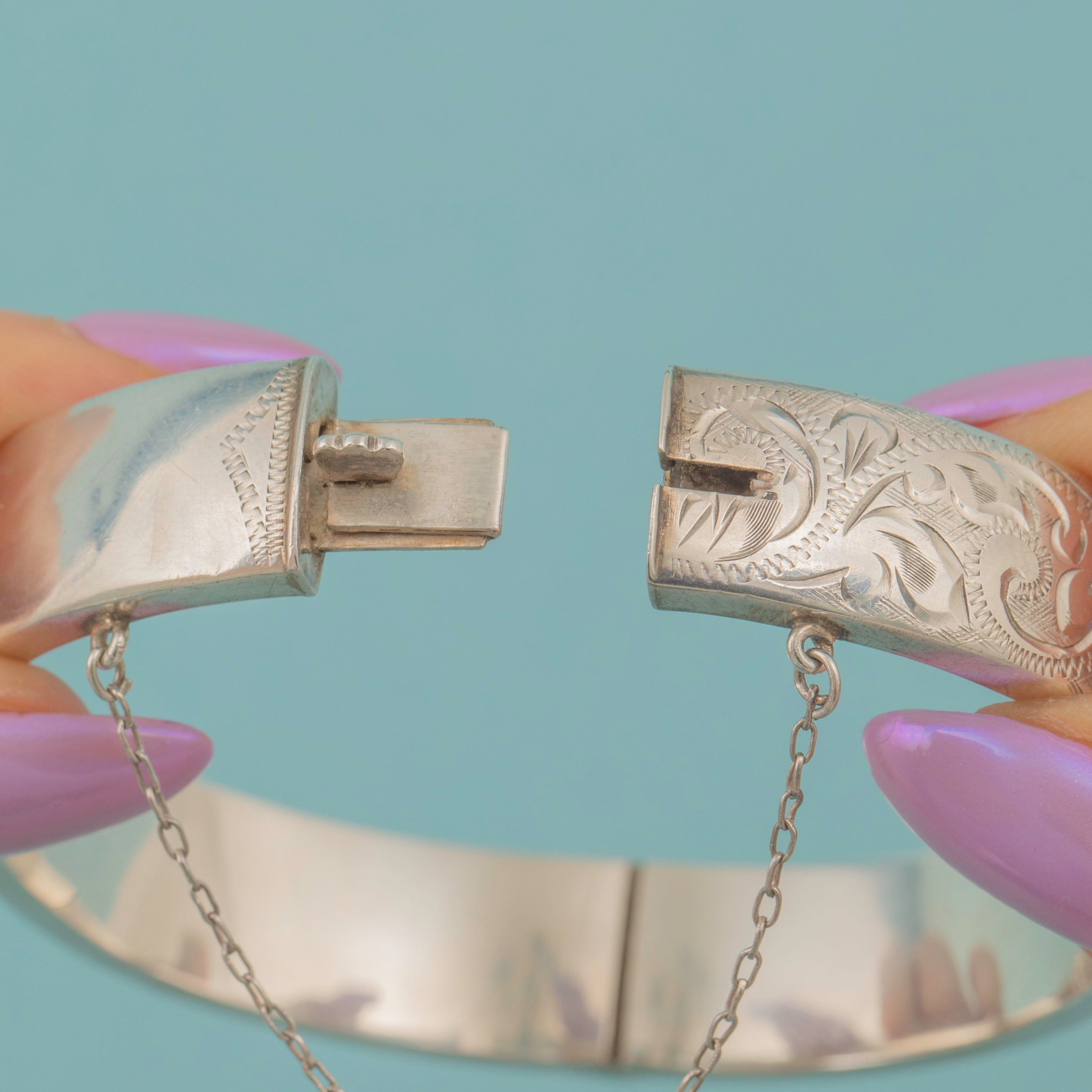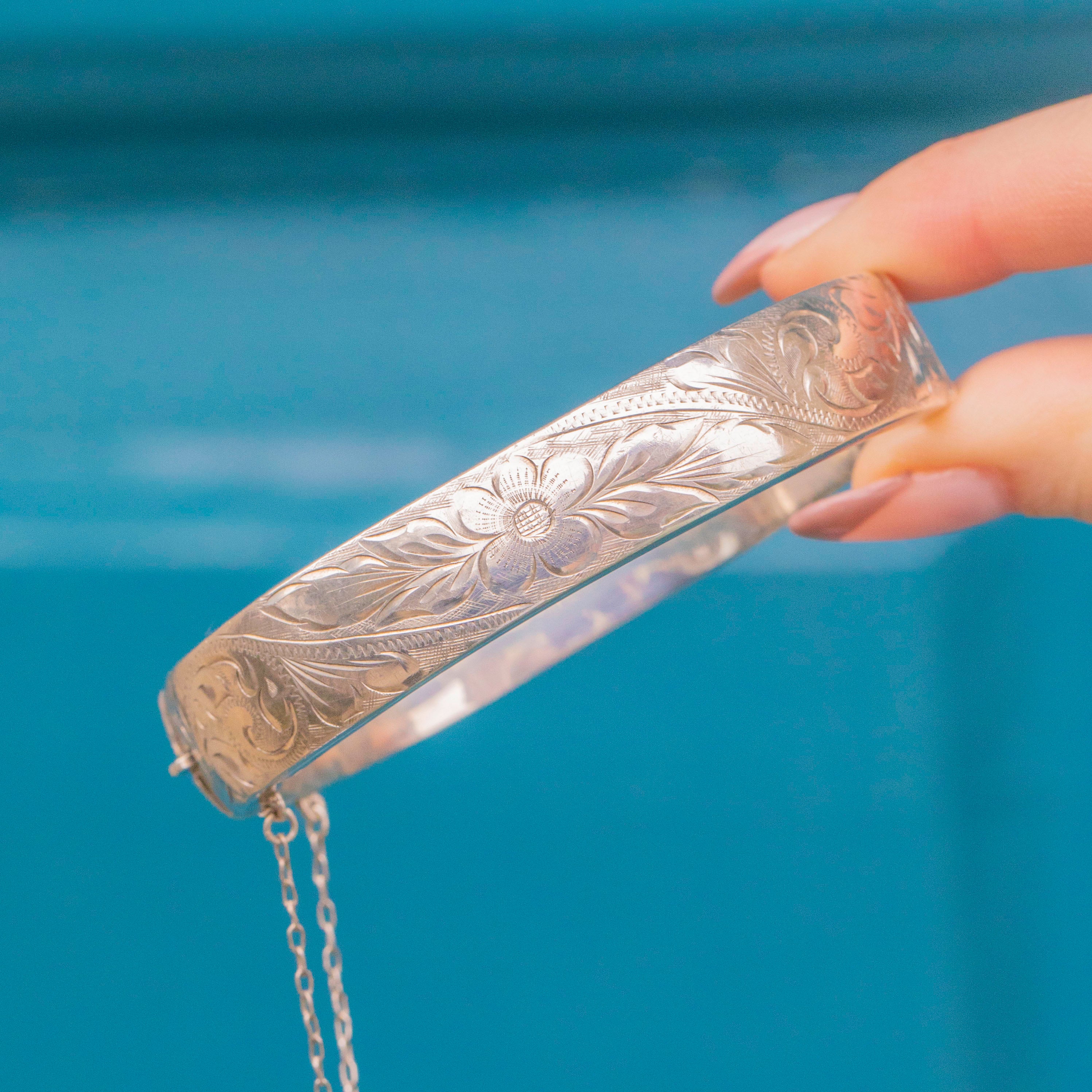 EXCELLENT. This mid-century Silver floral engraved bangle is in excellent condition. Her engravings are crisp and intricate, with only very minor surface wear visible under a jeweller's loupe. Complete with a safety chain and clasp in perfect working order, you can wear her with confidence!