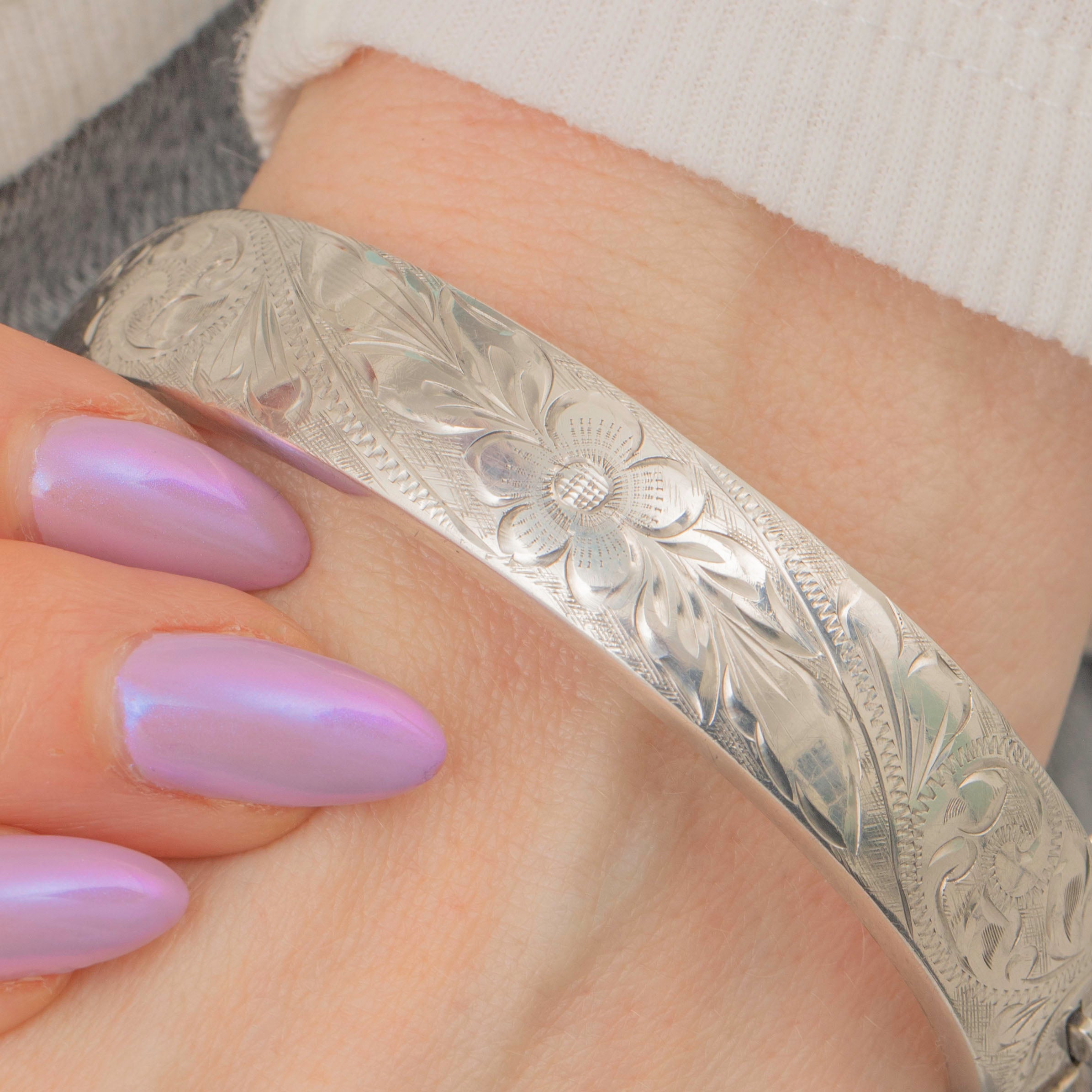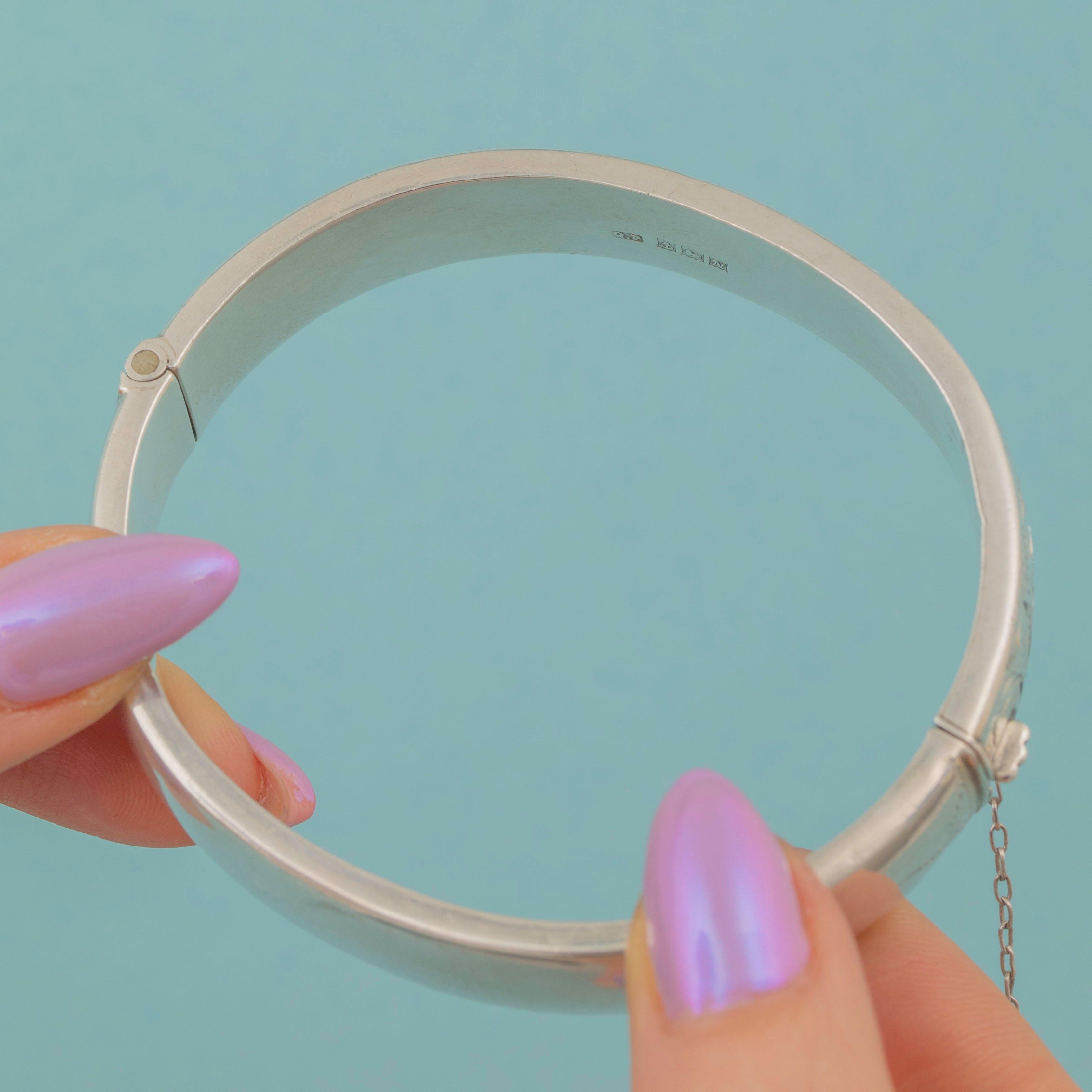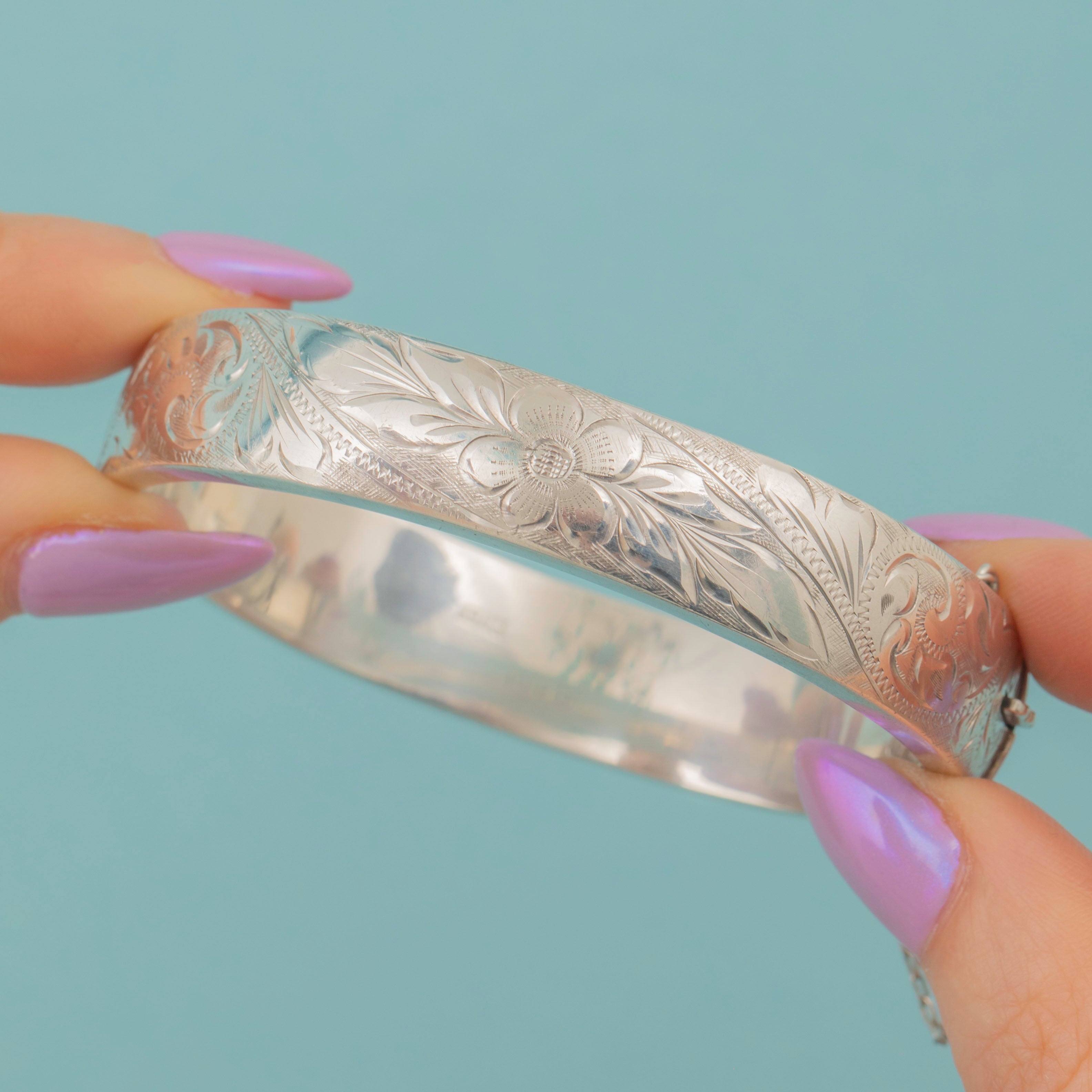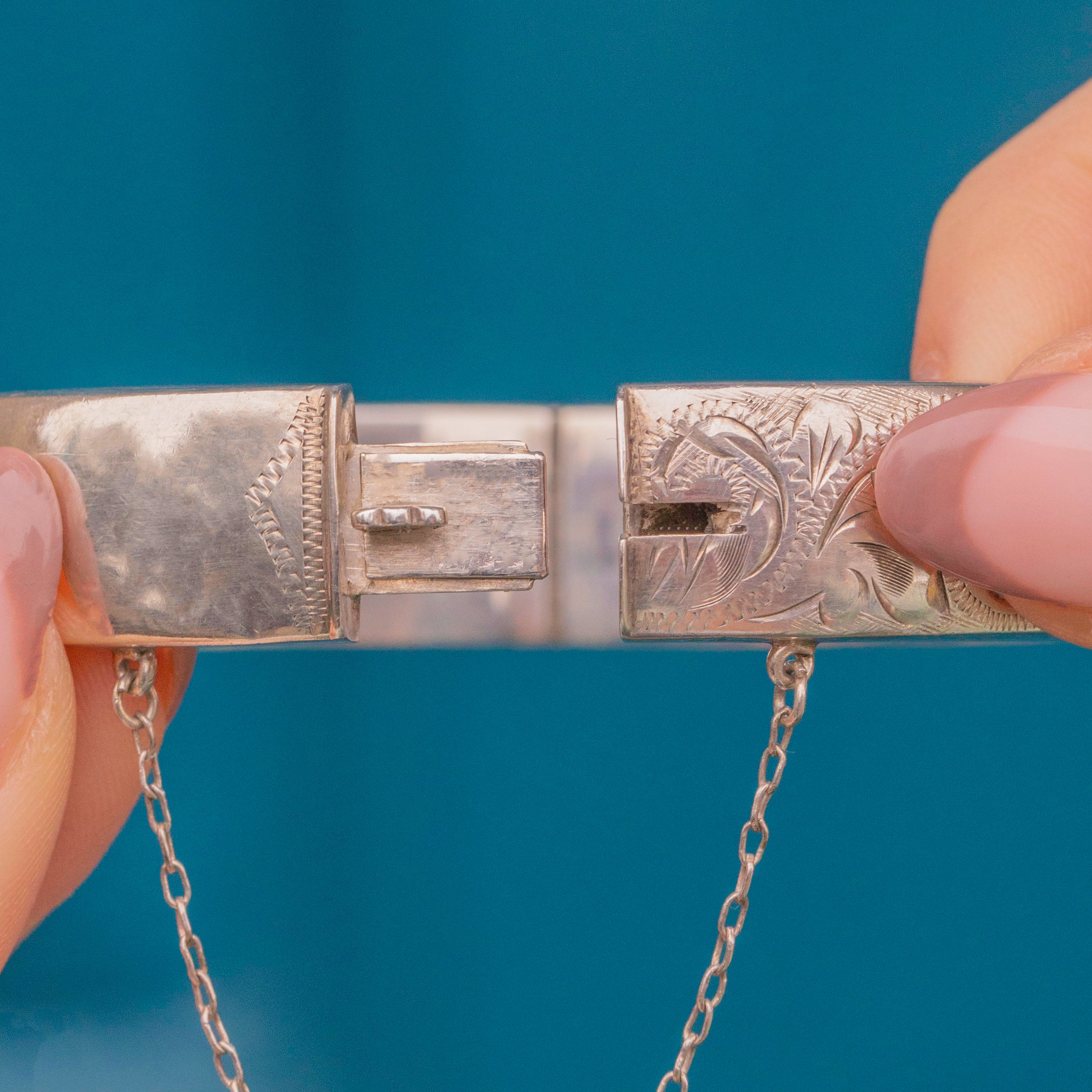 EXCELLENT. This mid-century Silver floral engraved bangle is in excellent condition. Her engravings are crisp and intricate, with only very minor surface wear visible under a jeweller's loupe. Complete with a safety chain and clasp in perfect working order, you can wear her with confidence!