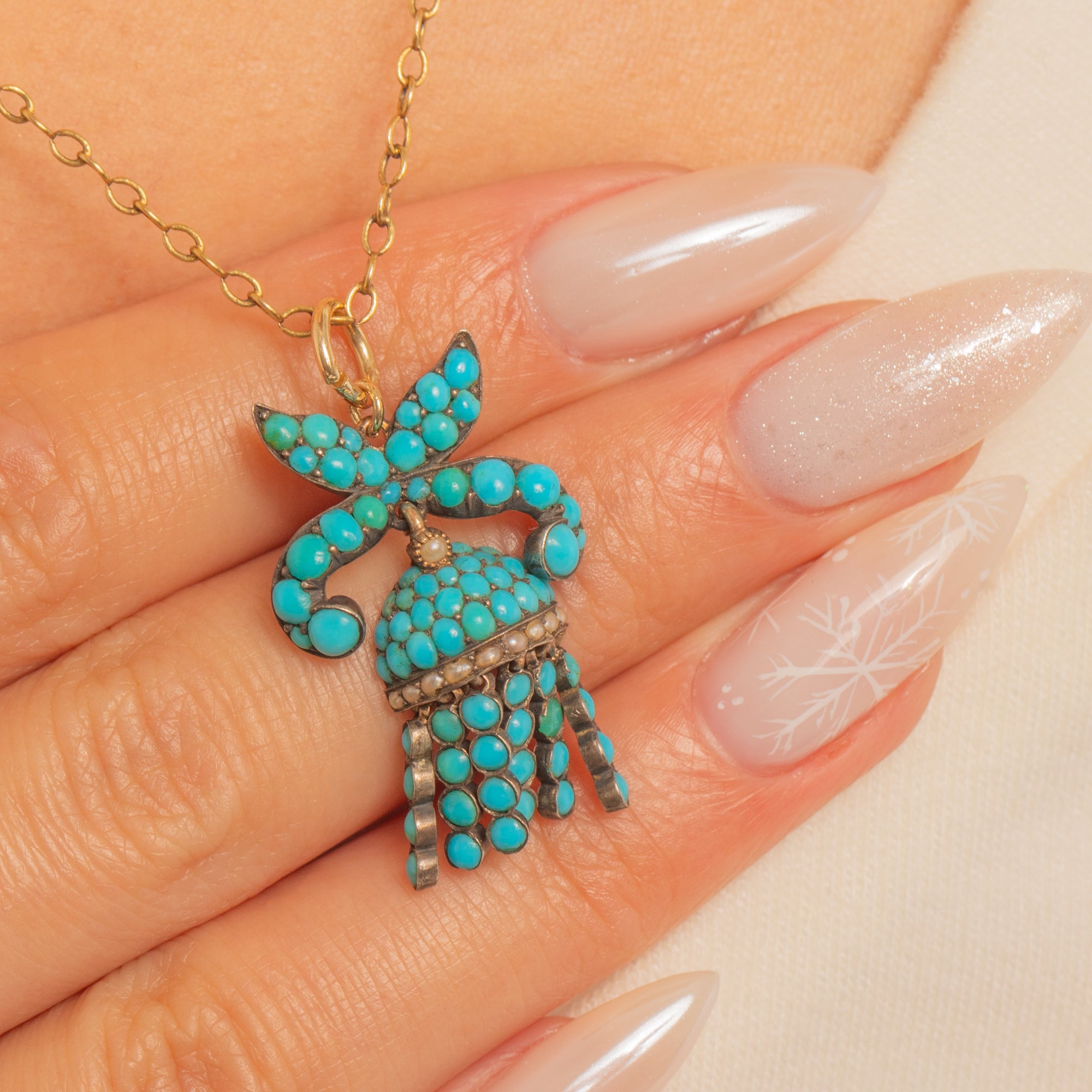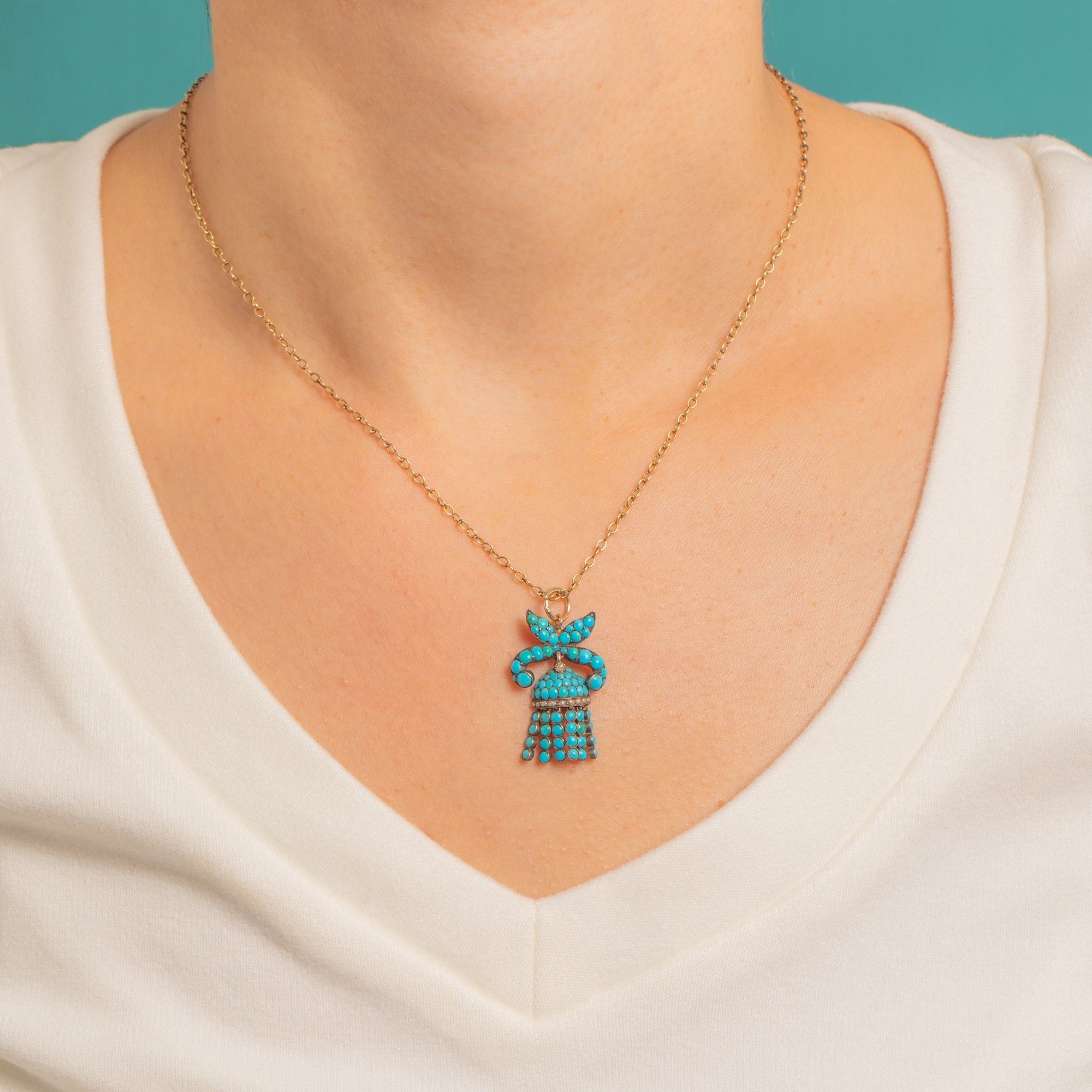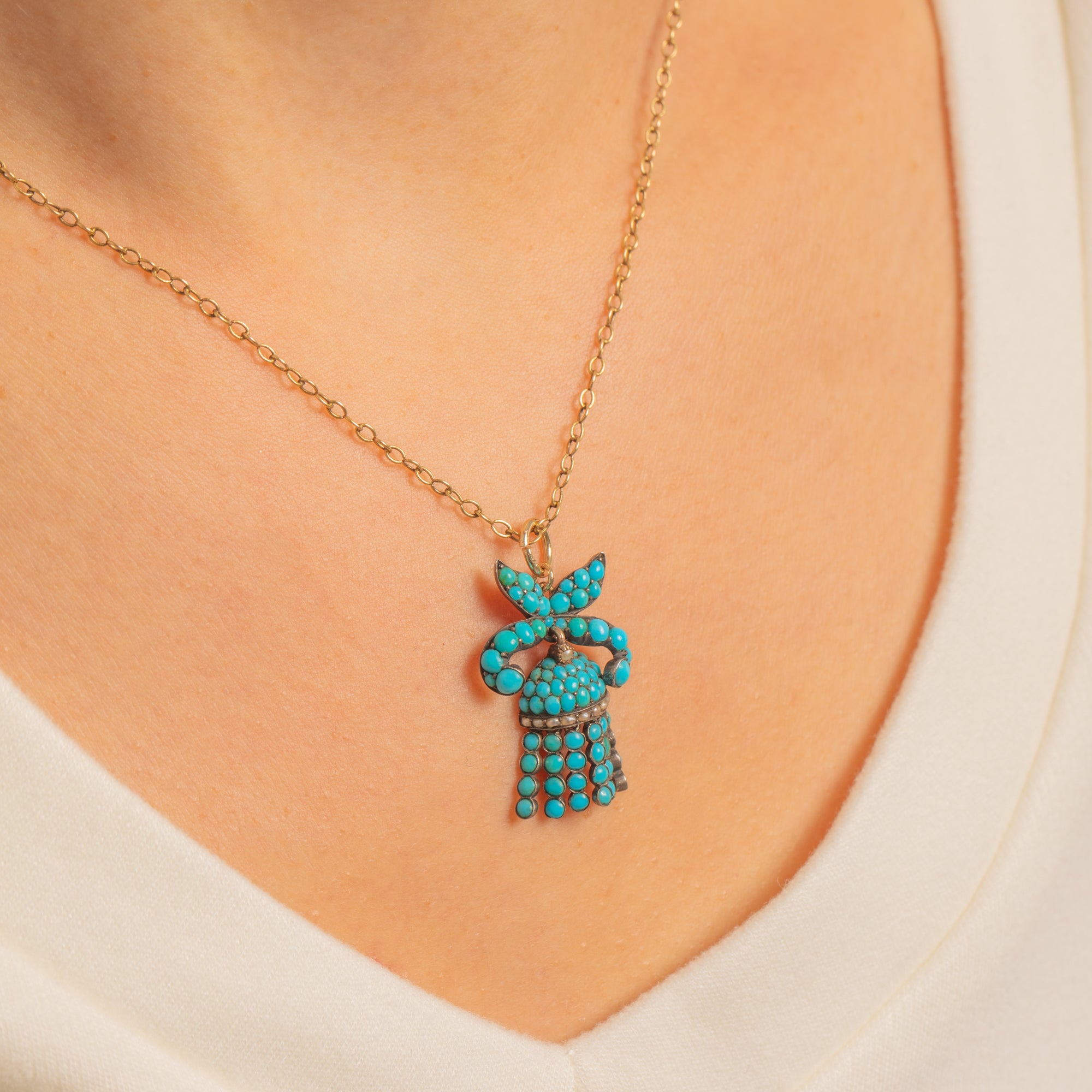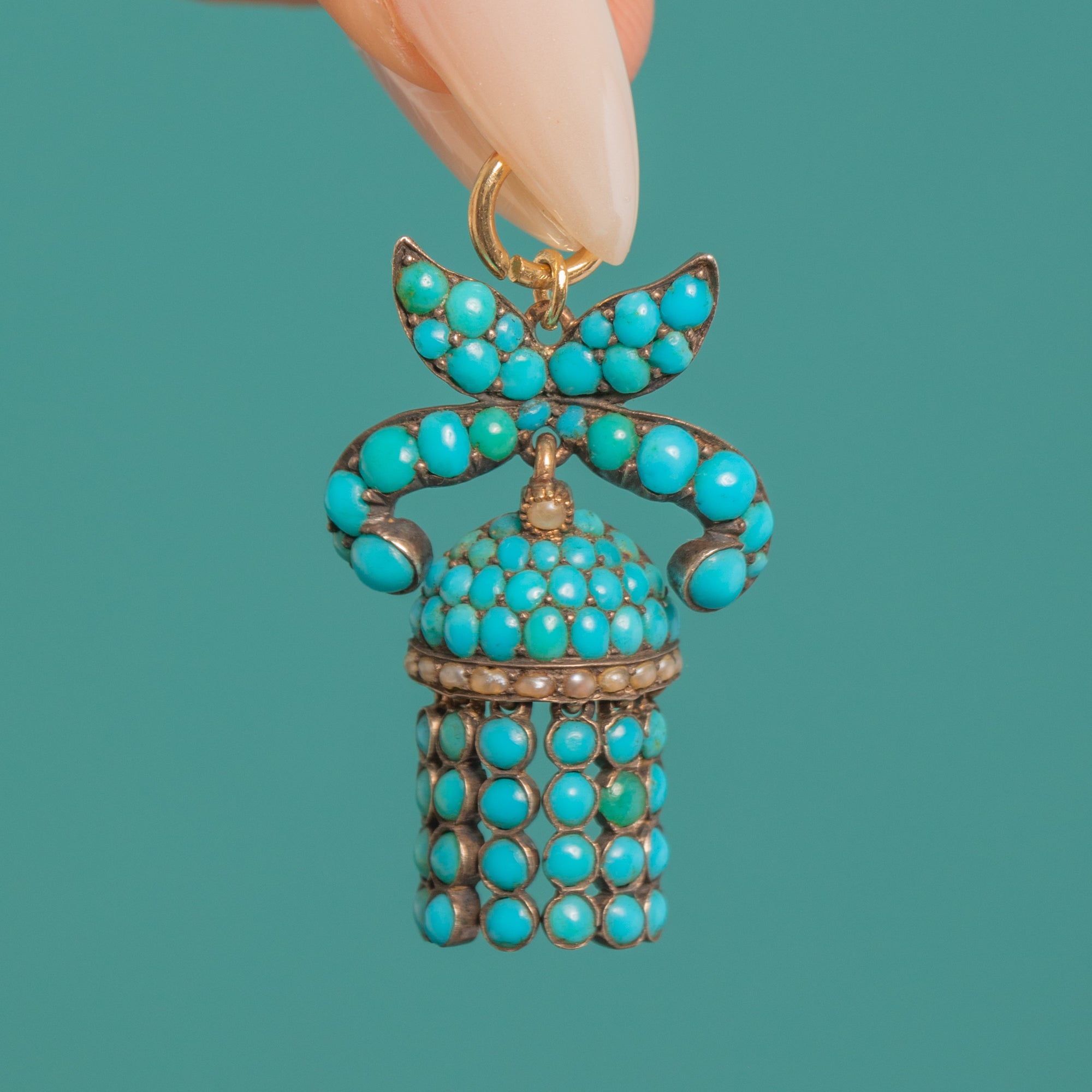 A delightful Victorian Silver pendant, modelled as a ribboned bow suspending a domed Turquoise cluster framed by a slim Pearl border and finished with five articulated tassels. The pavé of robin’s‑egg blue cabochons glows against the softly oxidised Silver, and the fringe has a lively, graceful movement.