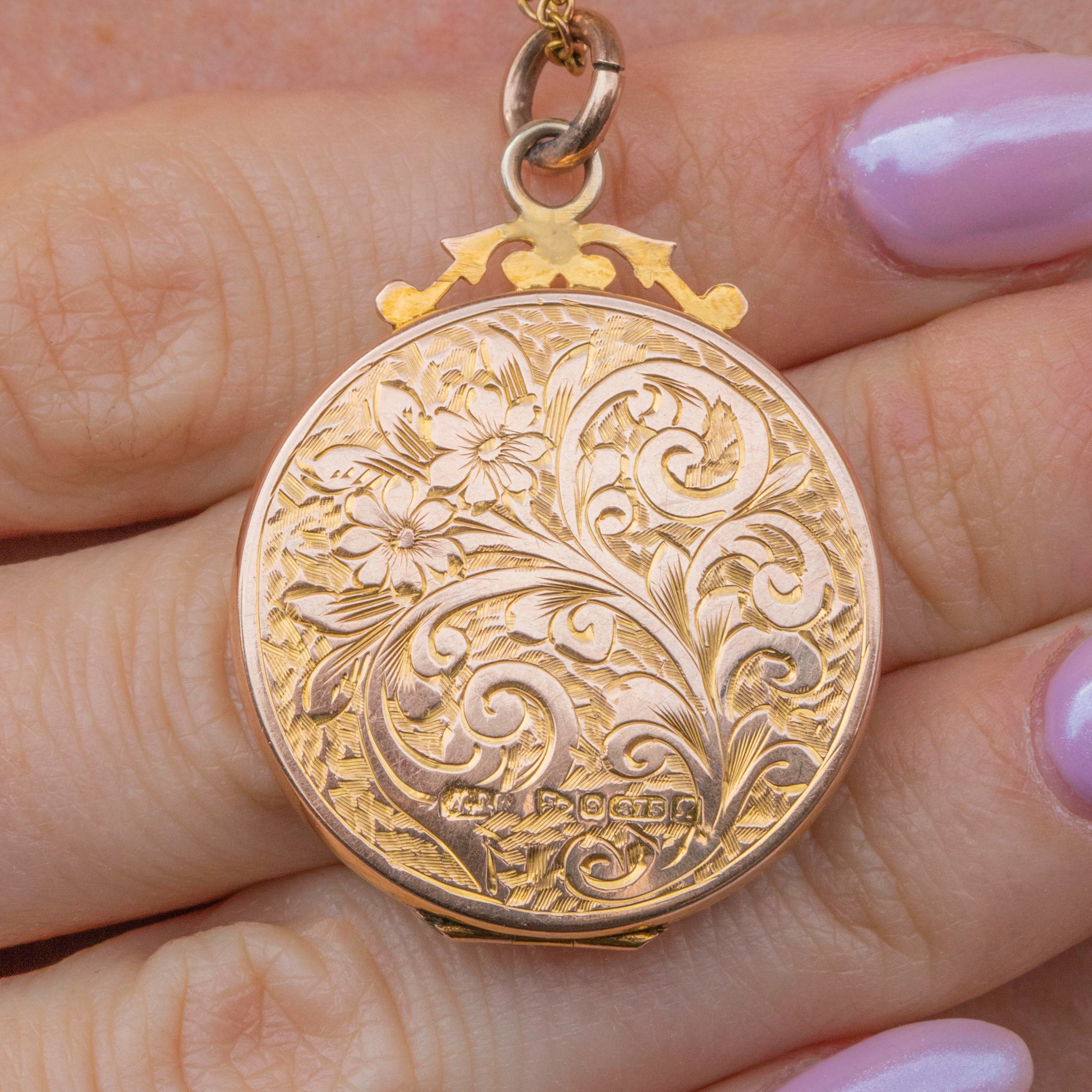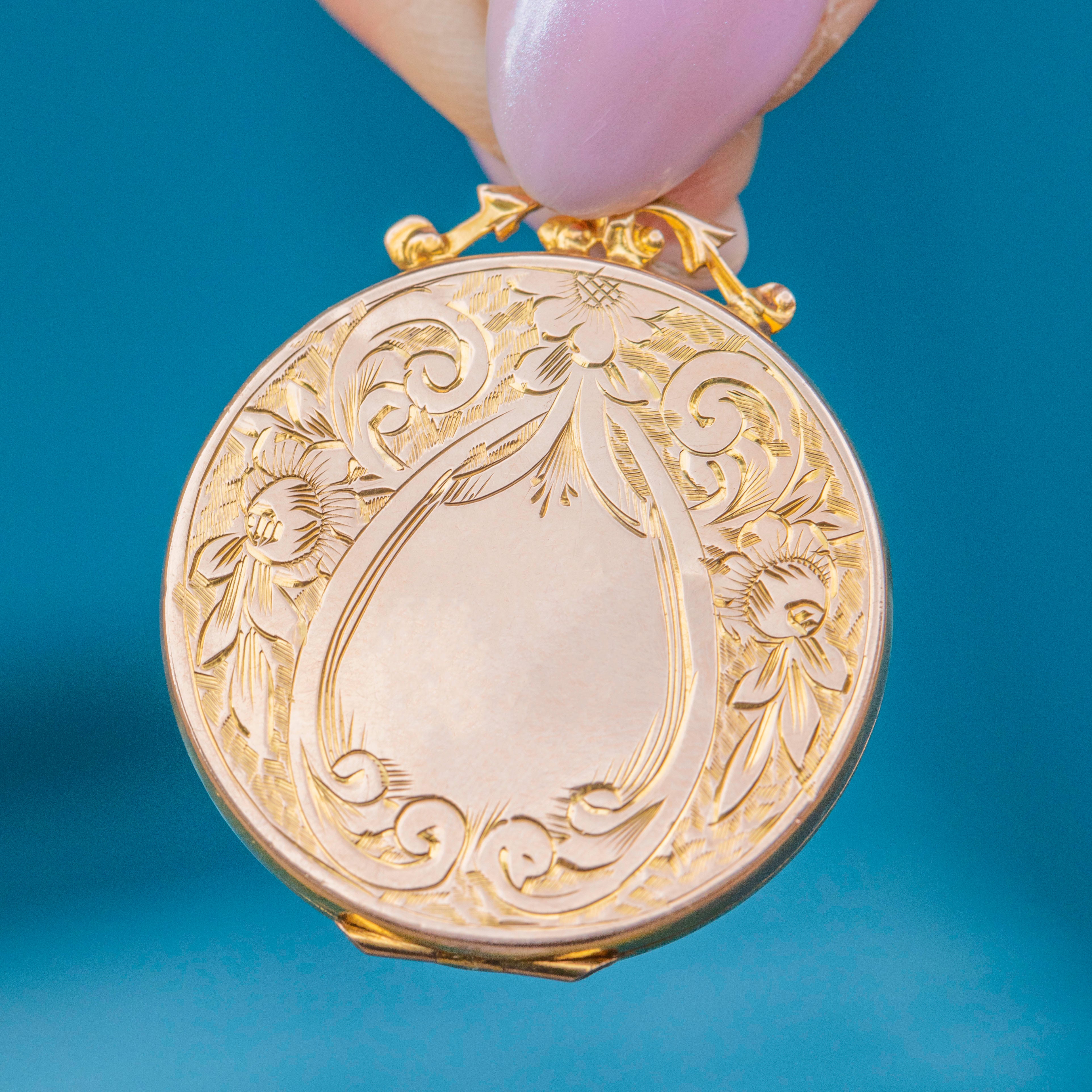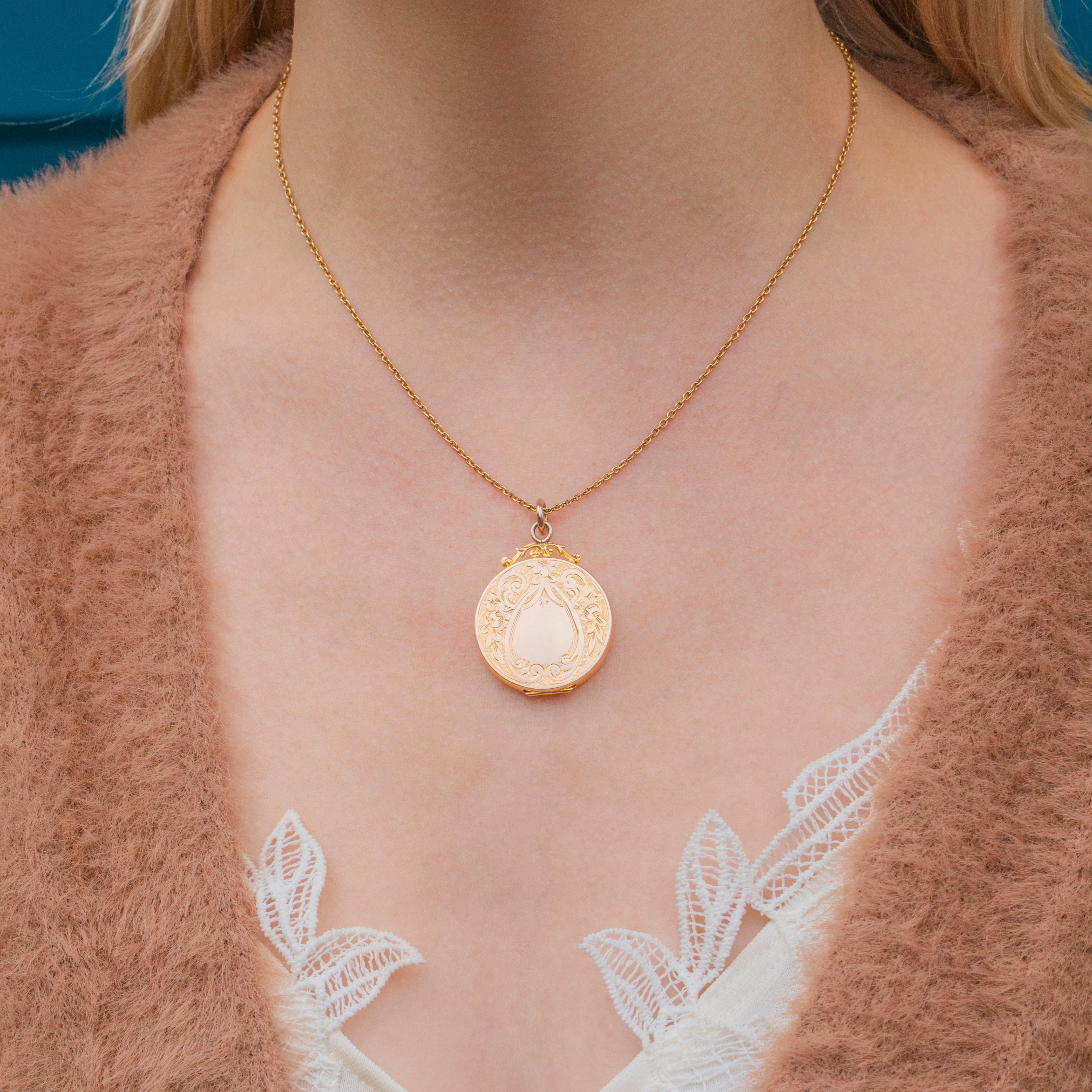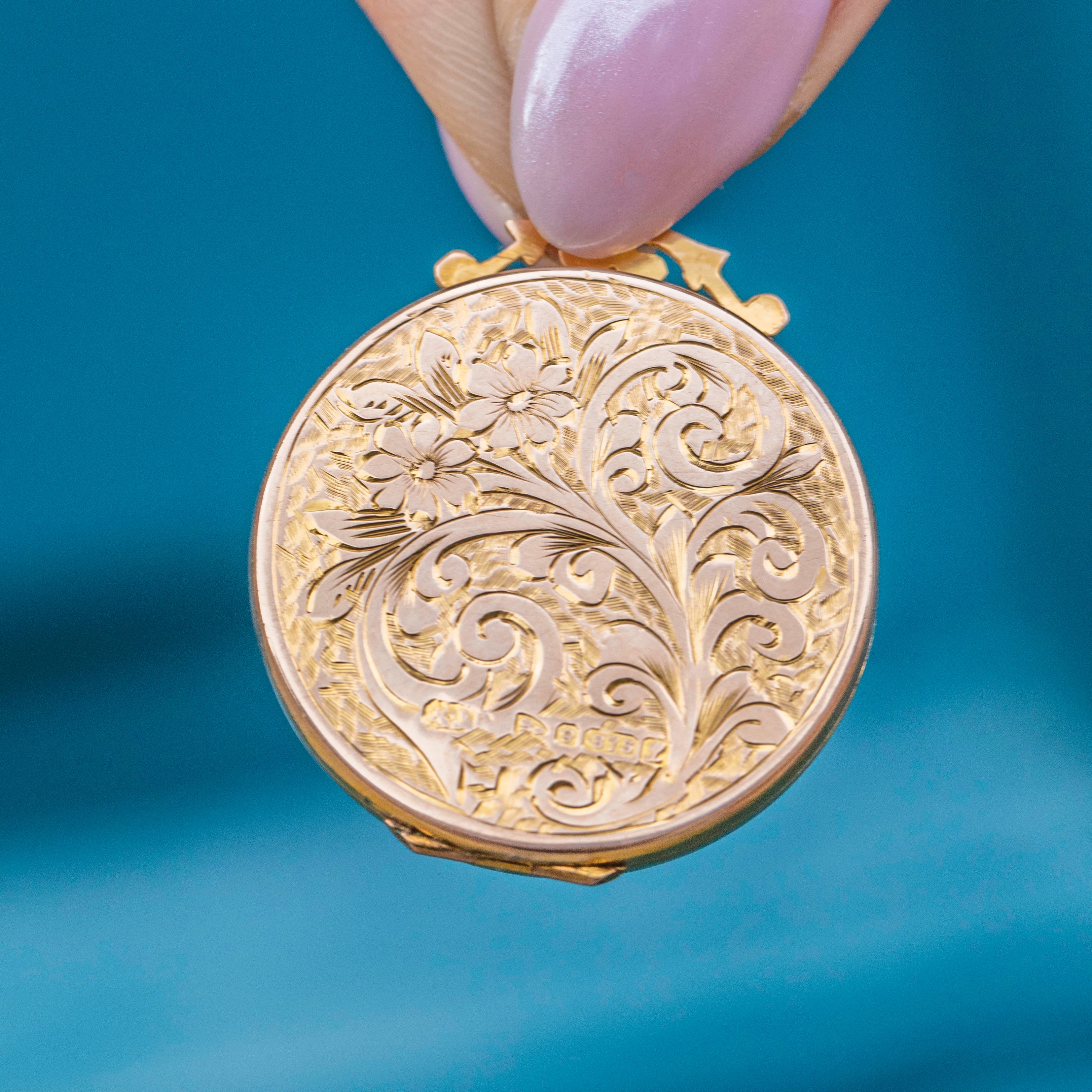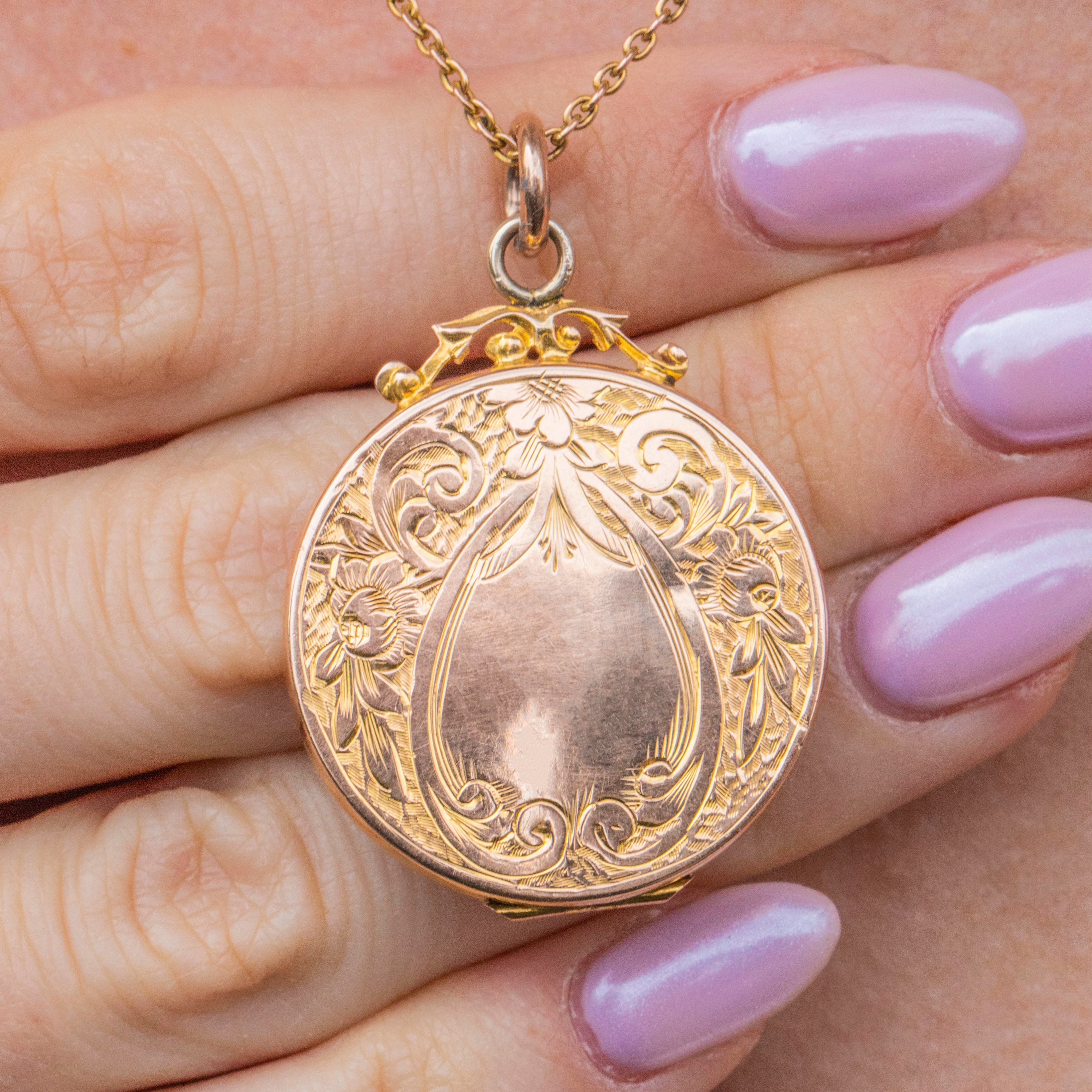 This solid 9ct Gold engraved round locket is simply sublime! From front to back, this Edwardian locket is inlaid with sweet forget-me-not and acanthus leaf engravings, with one side displaying a blank cartouche allowing you to add your own personal touch if you wish.