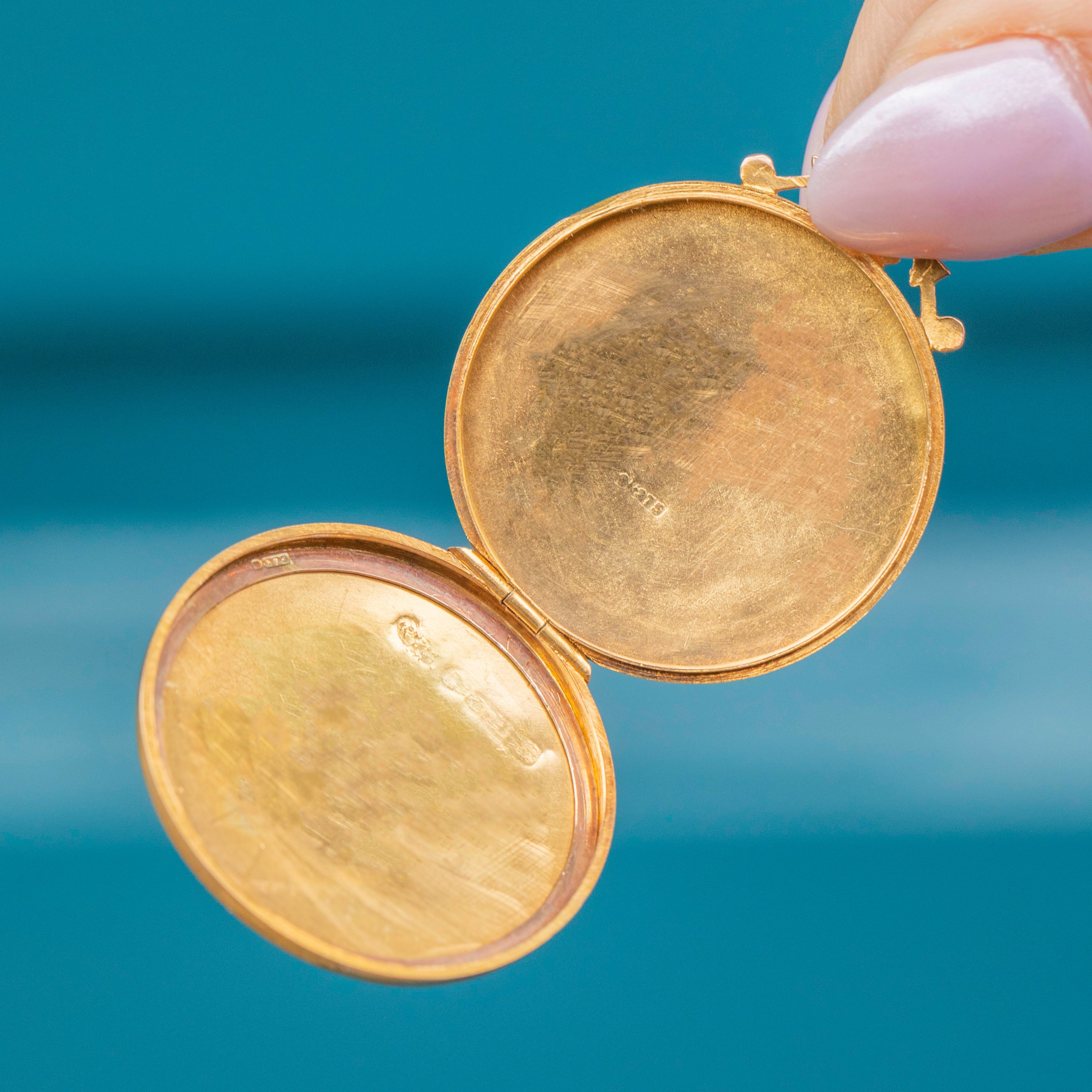 Her large circular form allows space to home one of your most cherished photographs, keeping your loved ones close to you at all times. This antique Gold locket is bound to become a cherished heirloom for generations to come.