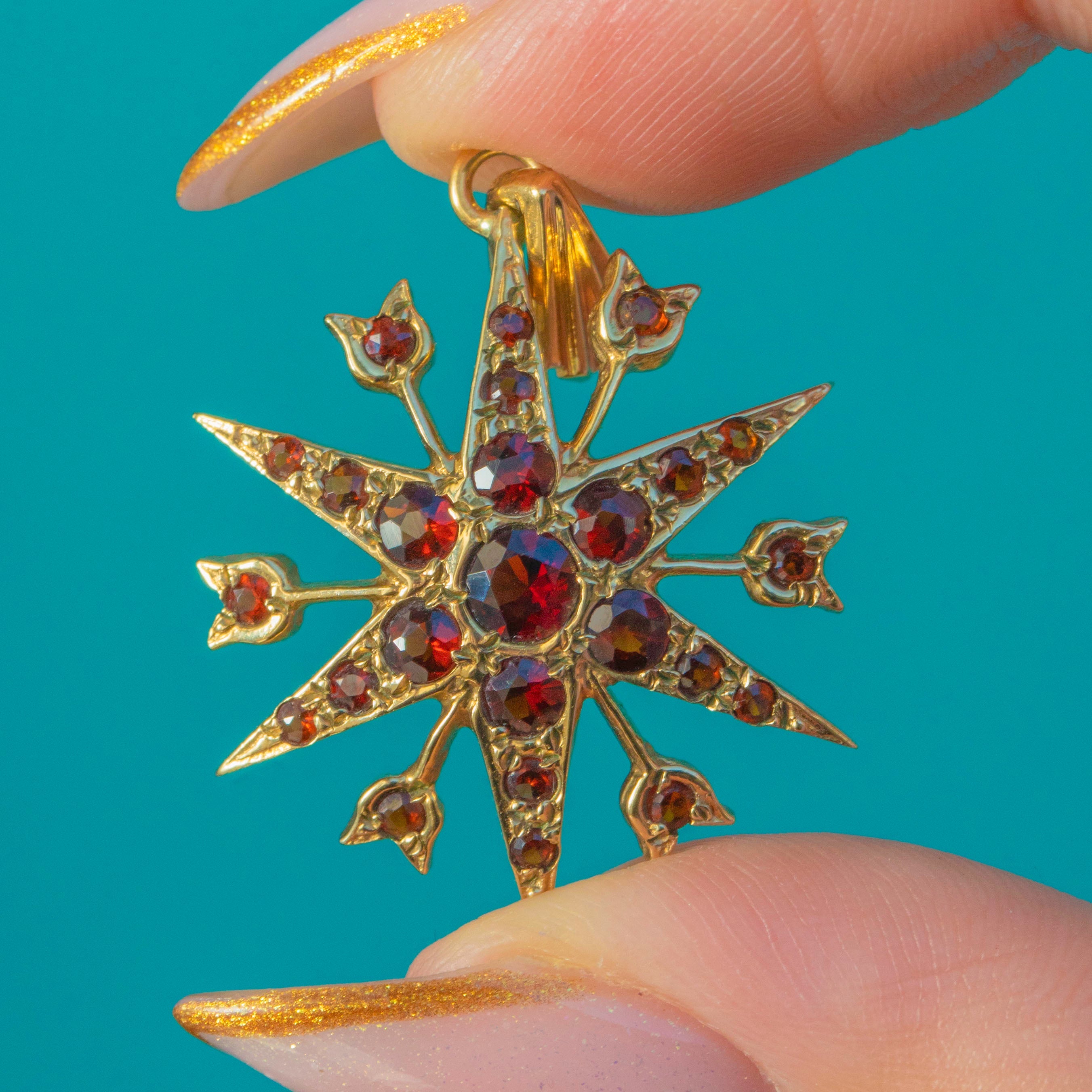 EXCELLENT: Garnets are vibrant, well-matched and securely set with no chips or abrasions. The Gold is bright with minimal surface wear. The structure is strong and the bale secure. A beautifully preserved Vintage star pendant.