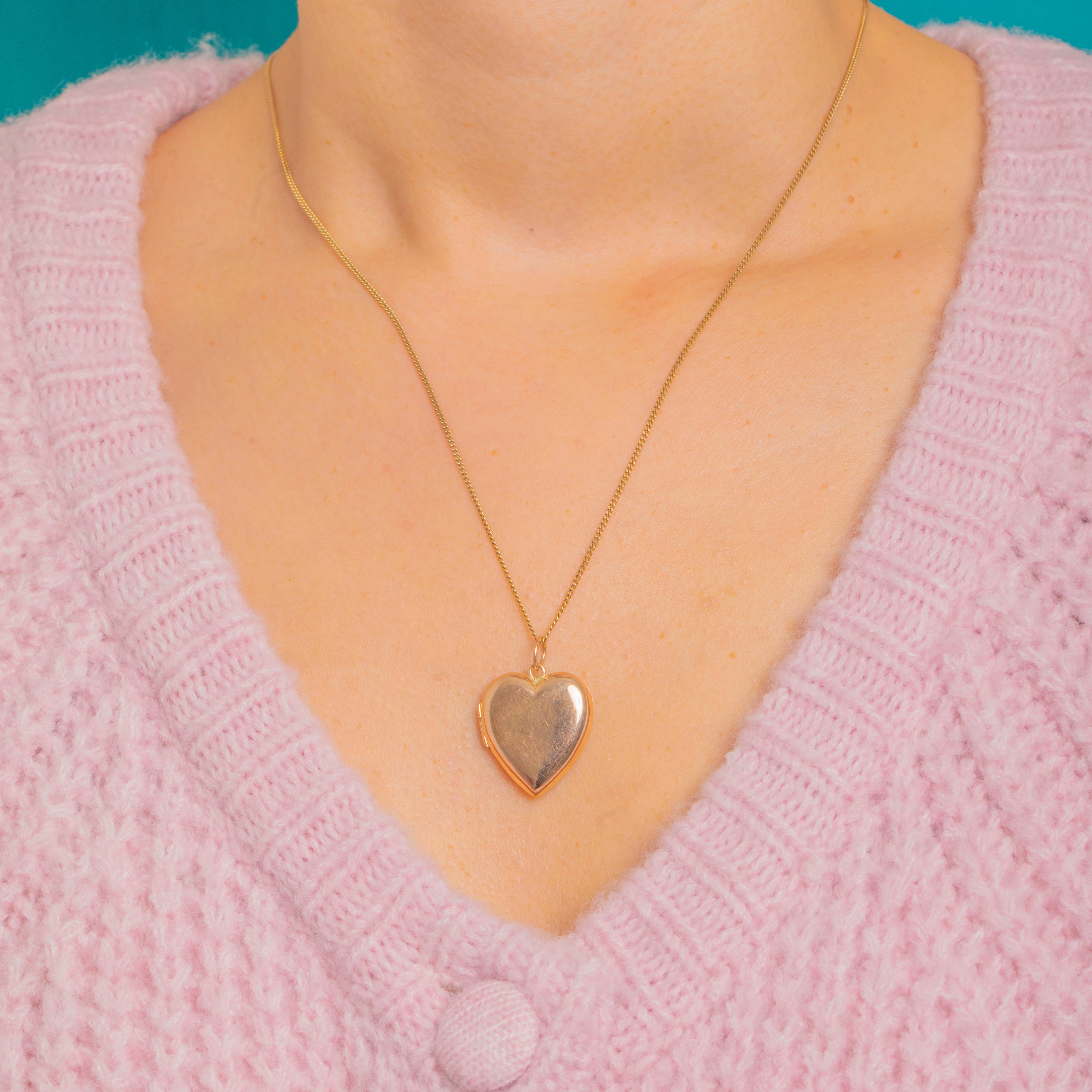A timeless Edwardian heart locket crafted in solid 9ct Gold, its smooth high-polish faces glowing with a warm rosy hue. Classic and romantic in its simplicity, the softly domed heart is beautifully proportioned and effortlessly elegant.