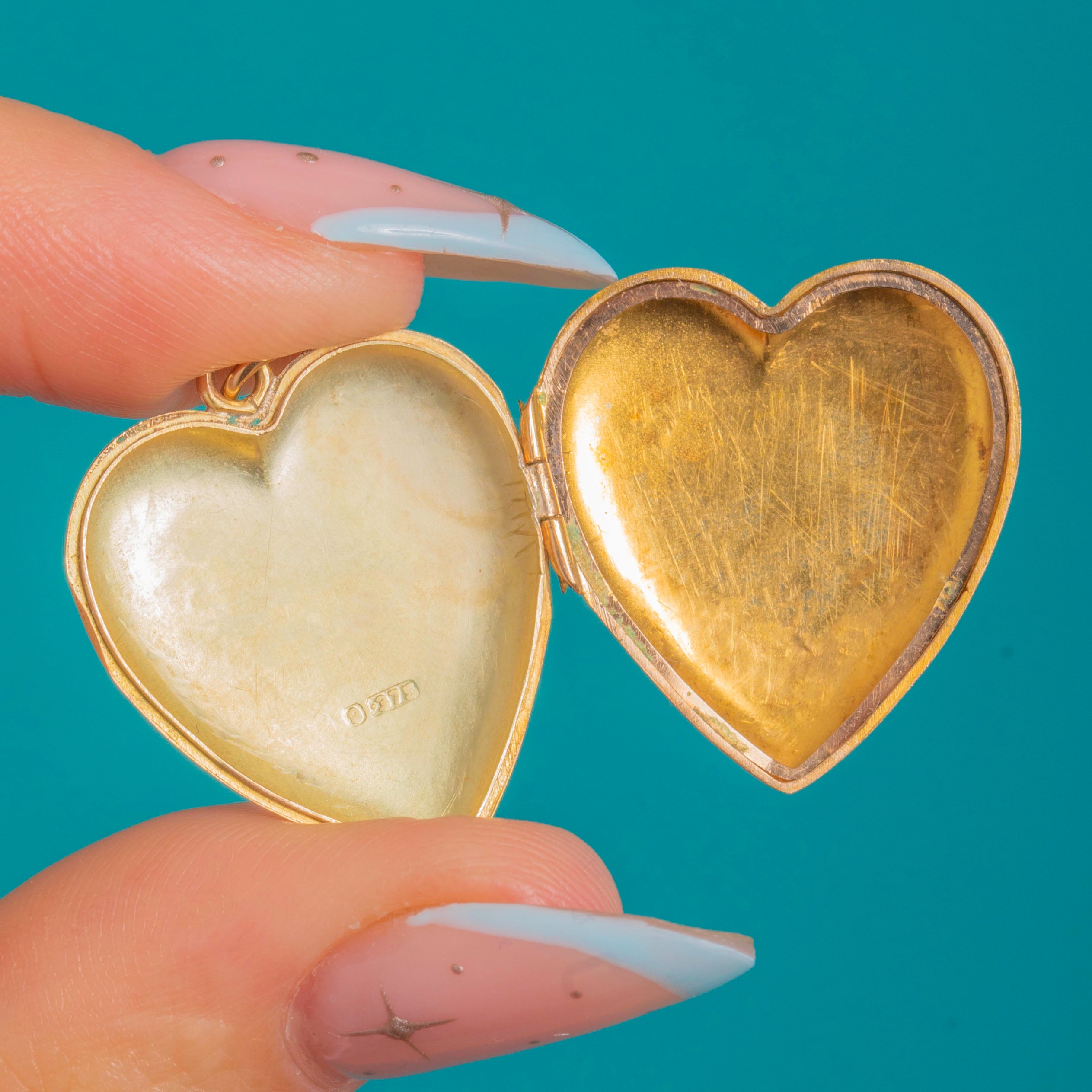 The locket opens to reveal two heart-shaped compartments for tiny mementos, secured by a sturdy side hinge and neat snap closure. It suspends from a fixed hasp with an added jump ring, ready to thread onto your favourite chain. Crisp English hallmarks confirm Chester, 1909, completing its irresistible antique charm.