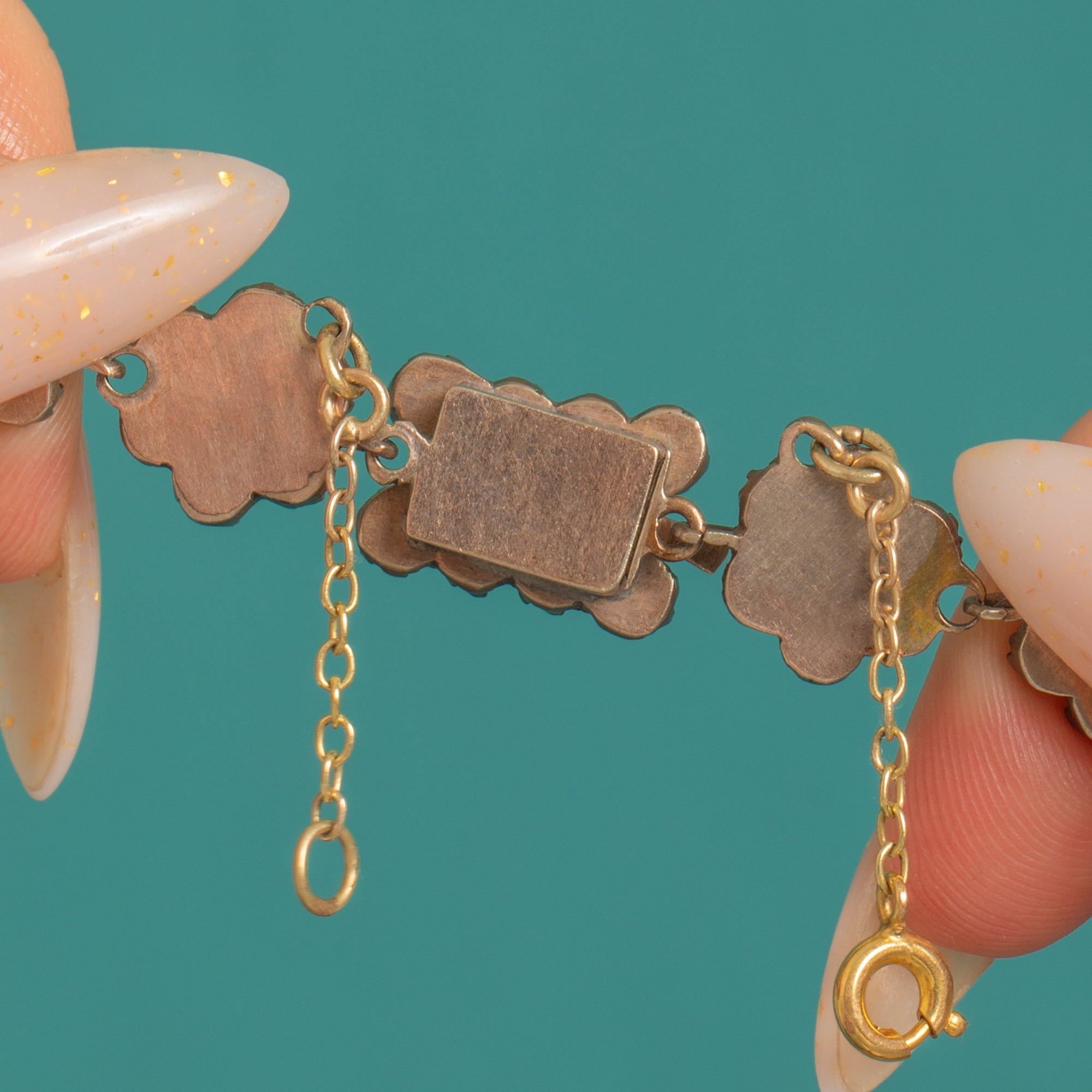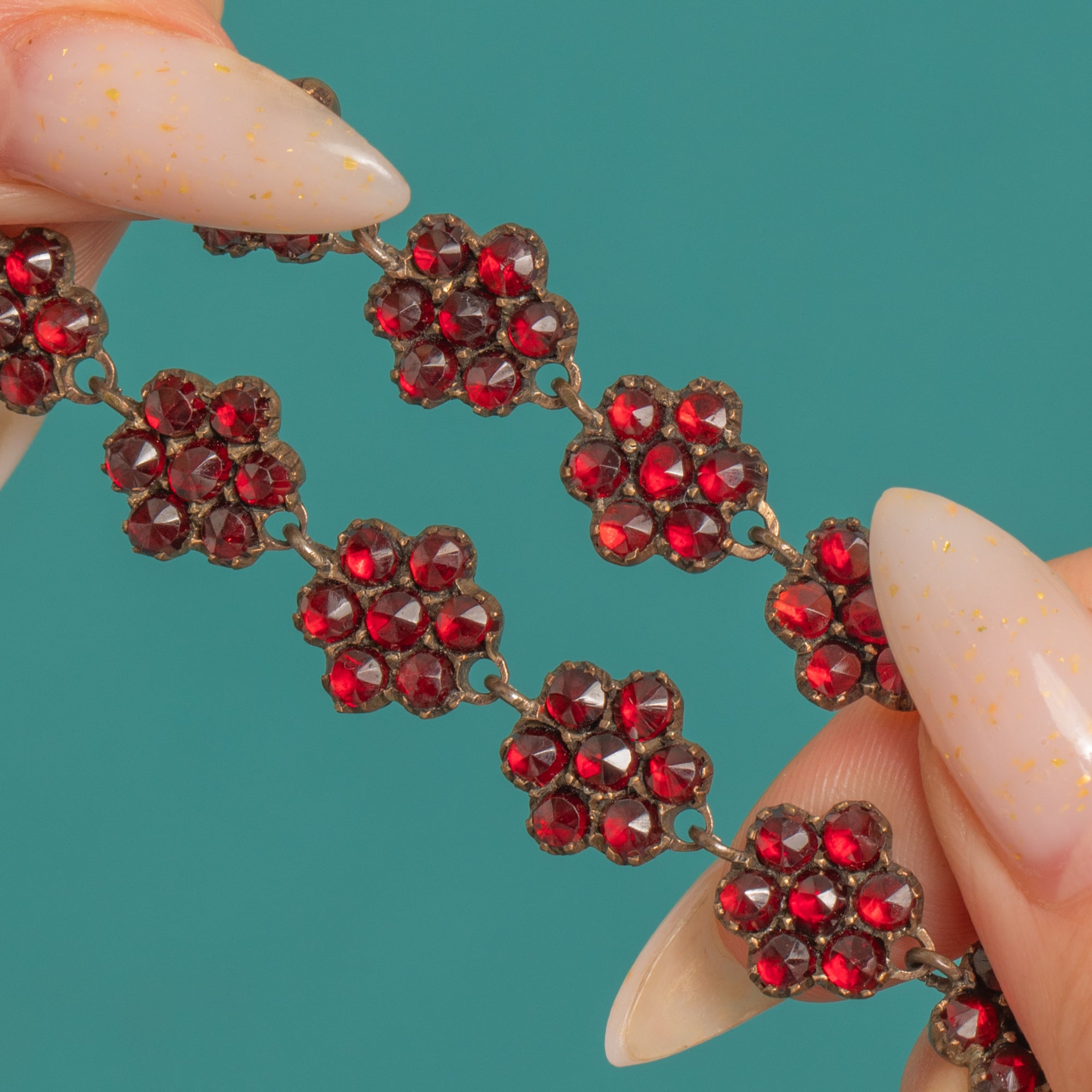 The settings are closed-back collets typical of late 19th-century Bohemian Garnet work. The metal tests as Garnet Gold, complemented by a 9ct Gold safety chain for added security. A sympathetic antique patina enhances the deep, saturated red of the faceted Garnets, bringing warmth and intensity to every facet.