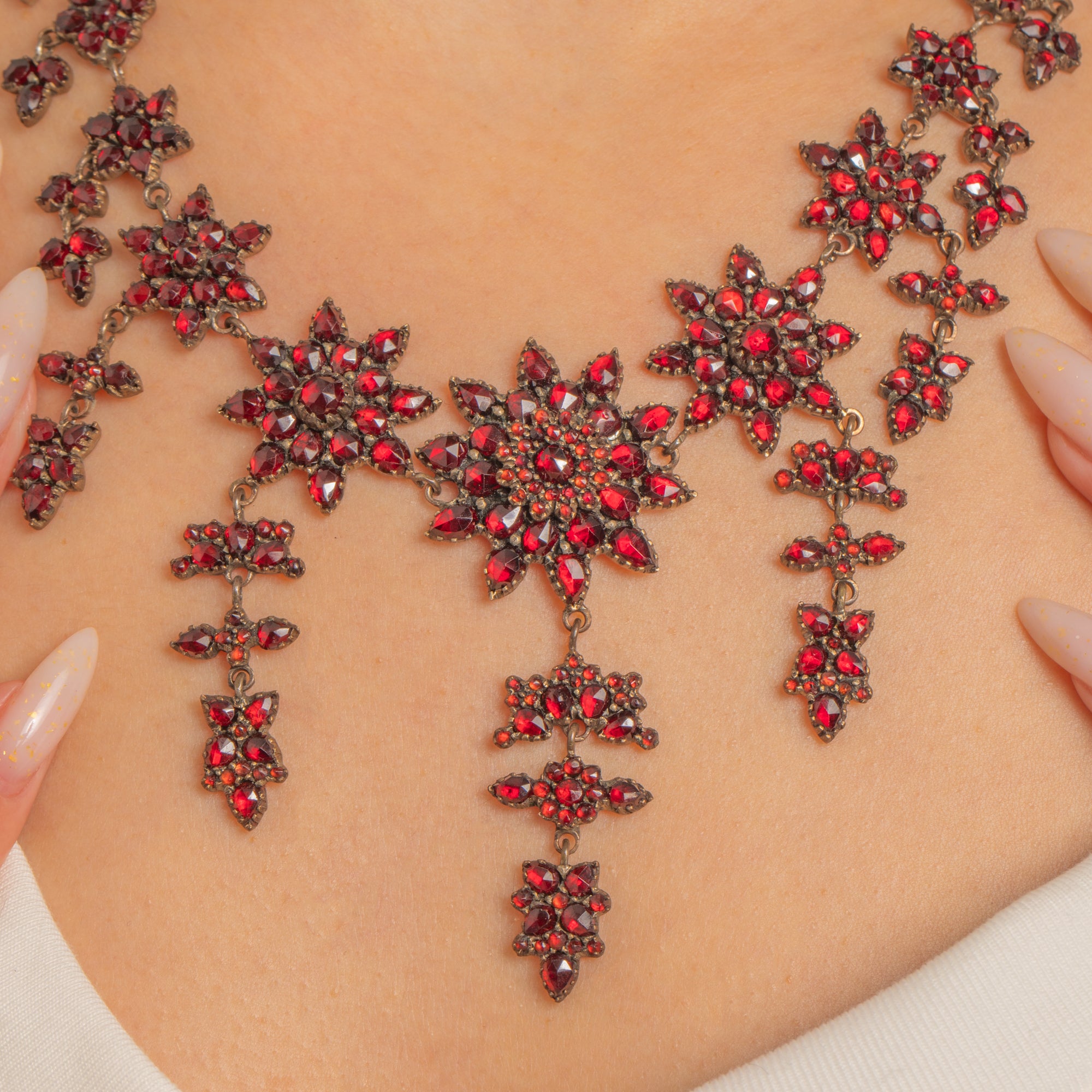 A spectacular Victorian Bohemian Garnet stars necklace, c.1890, alive with a constellation of starburst and rosette clusters that drape fluidly along the neckline. Dense pavé-style Garnet settings culminate in a graduated central girandole of three elegant drops, creating a richly decorative, collar/princess-length silhouette with dramatic Victorian allure.