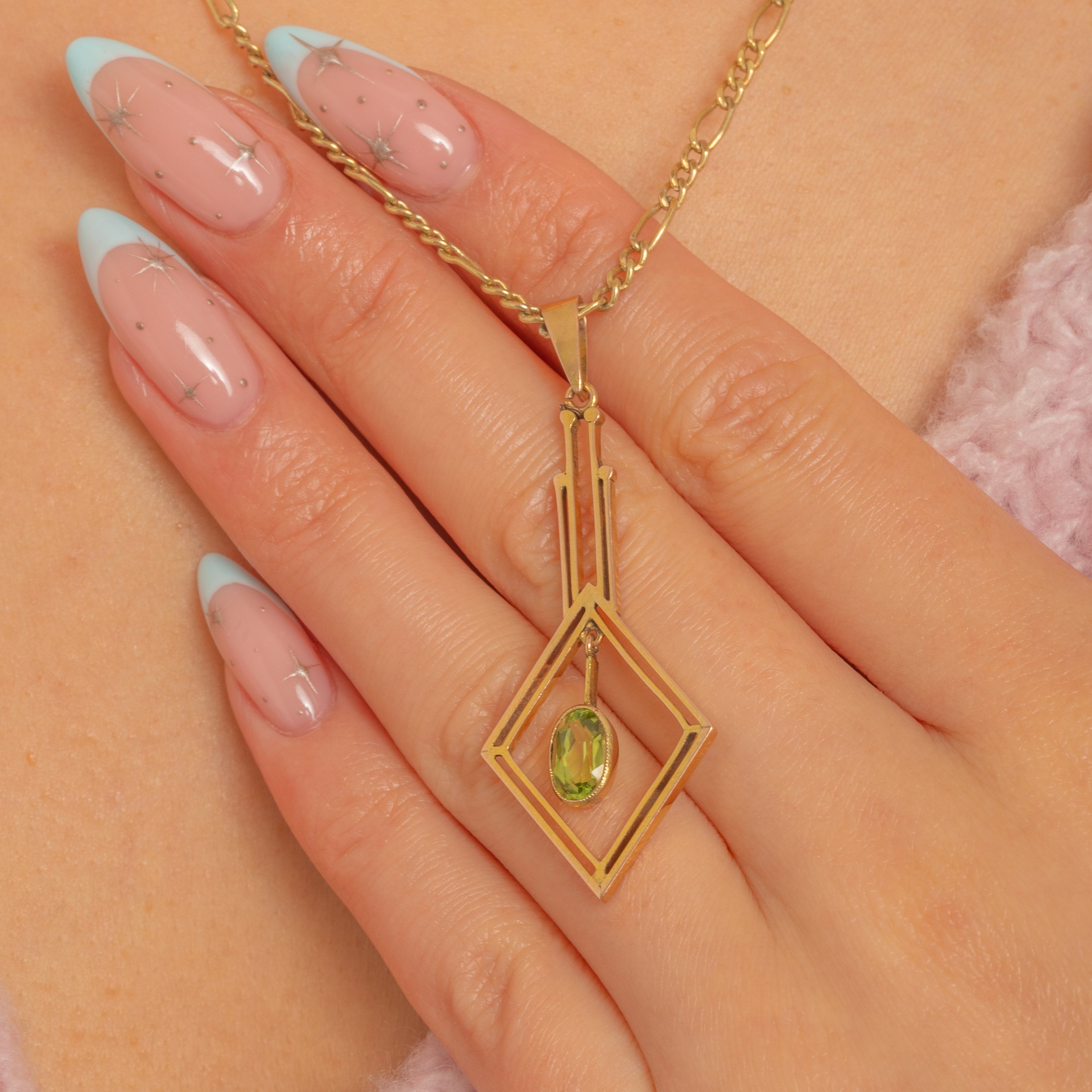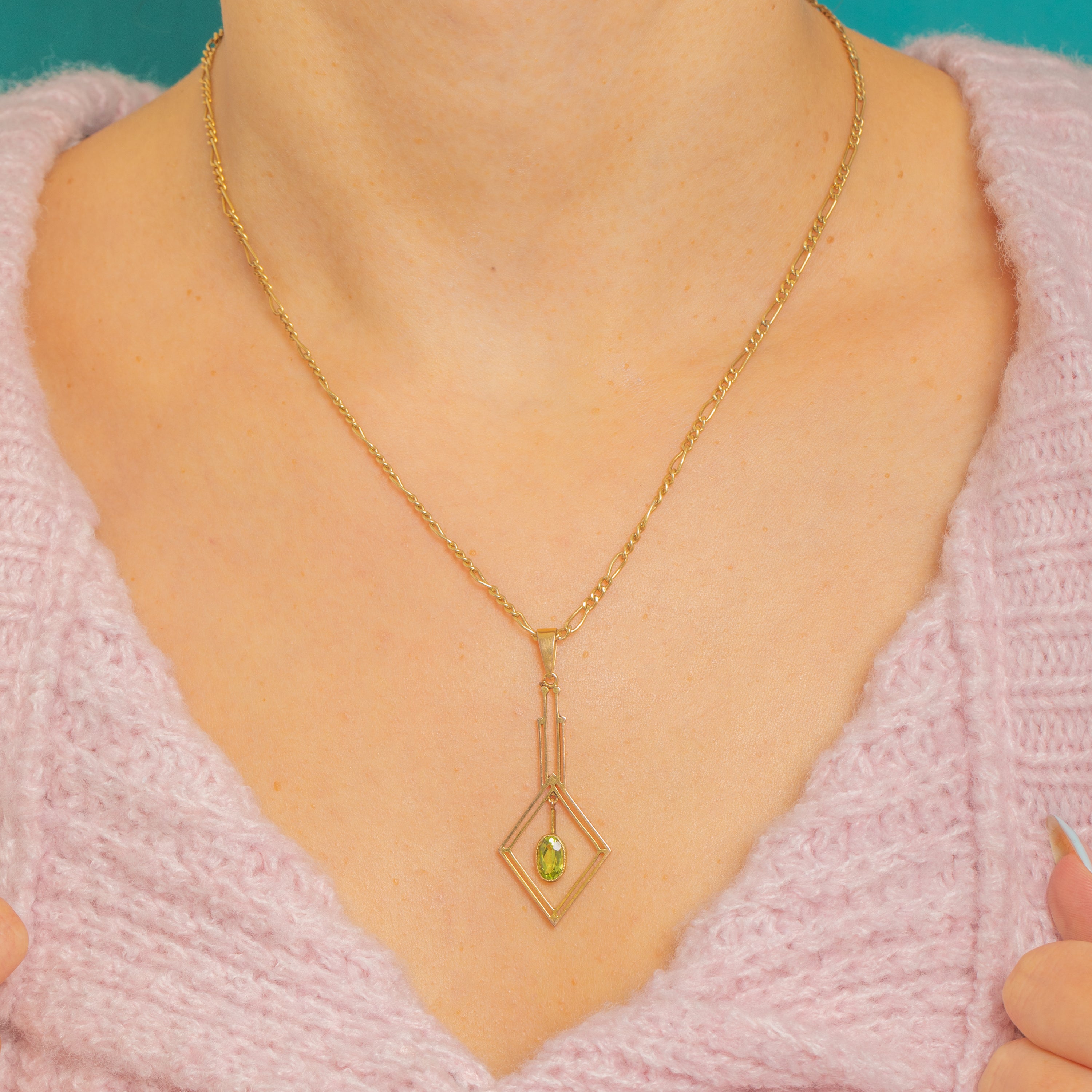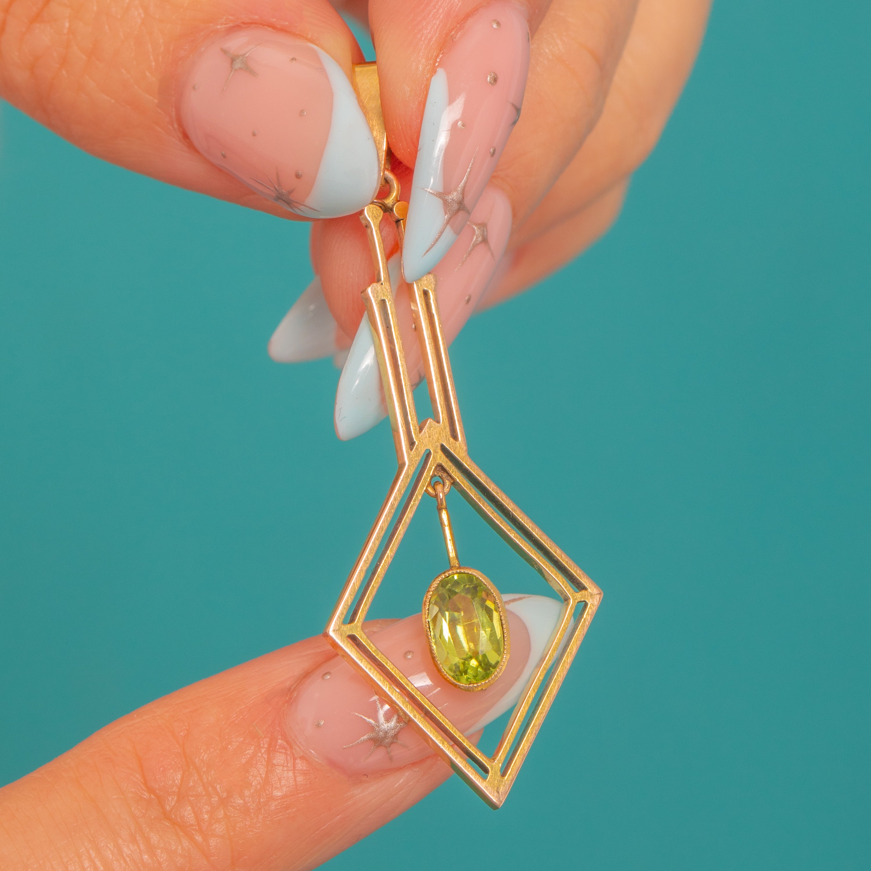 Striking and streamlined, this Art Deco 9ct Gold Peridot pendant captures the era’s love of bold geometry and light-filled openwork. Twin batons step down into a double-line lozenge, framing a vivid lime-green Peridot that swings freely at the centre in a sleek bezel for elegant, kinetic movement.
