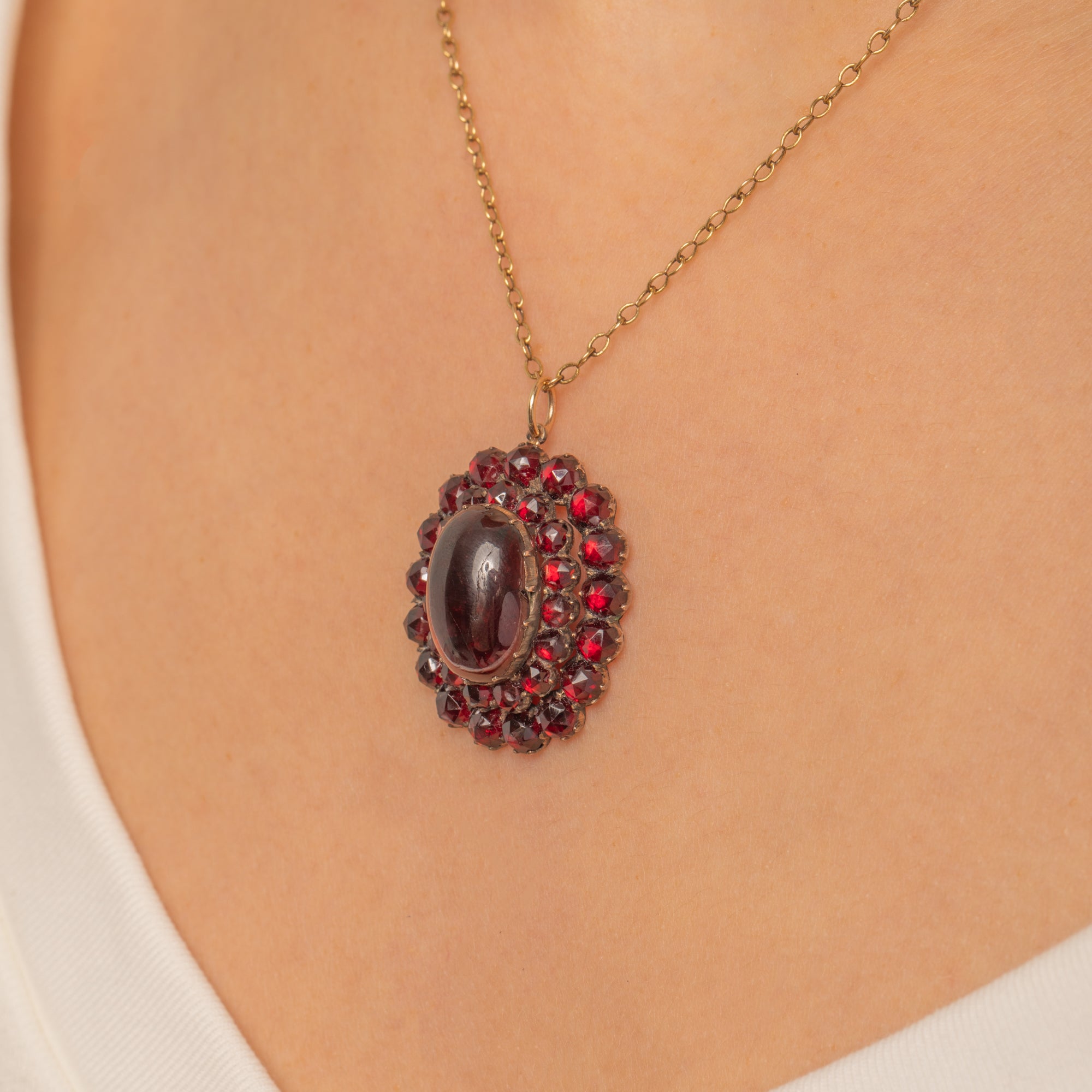 A richly coloured Victorian Garnet cluster pendant, glowing with a high-domed oval Cabochon Garnet embraced by two concentric halos of deep wine-red rose-cut Garnets. The tightly packed closed-back collet settings create a sumptuous, jewel-toned mosaic, while the scalloped reverse and warm golden tones lend that irresistible antique allure.