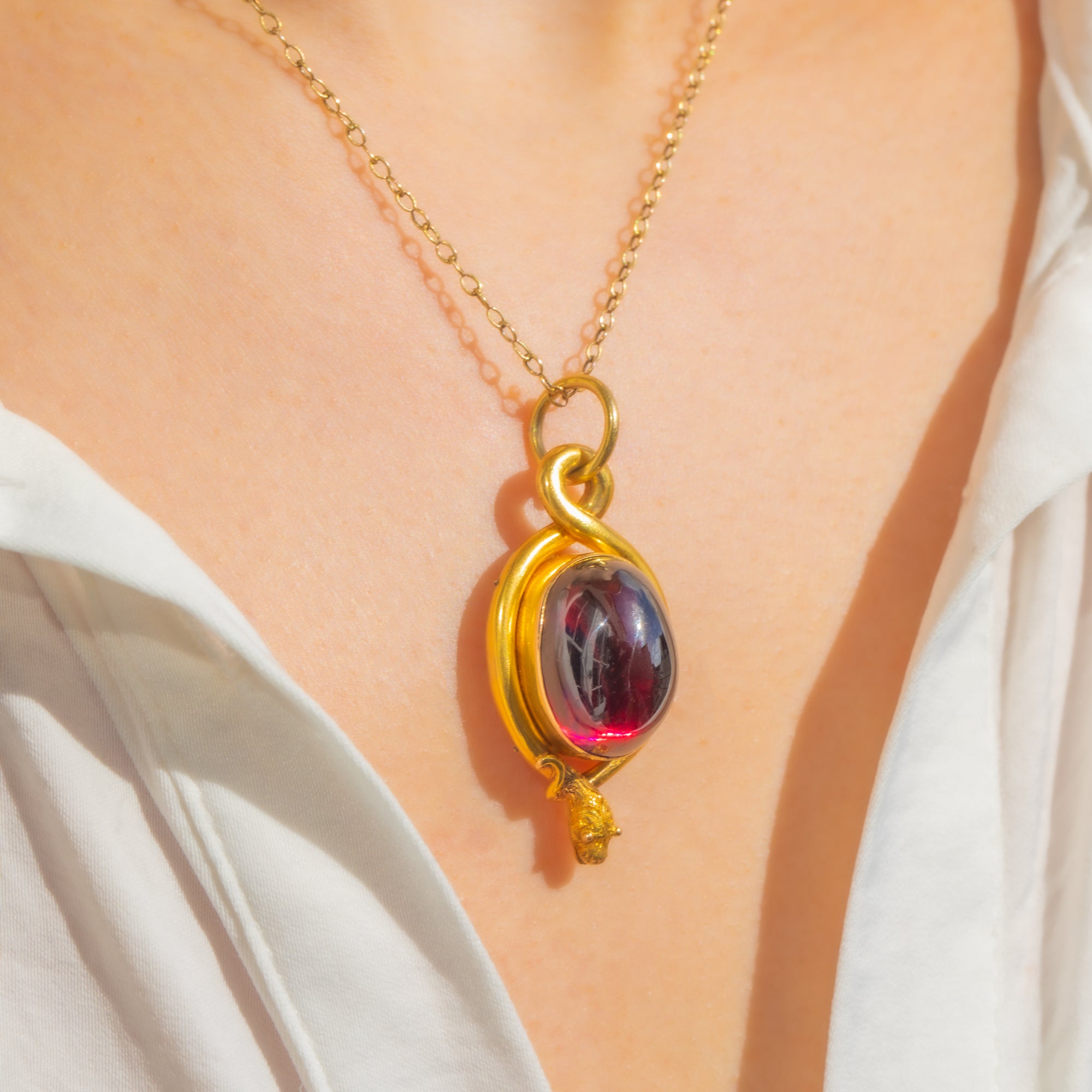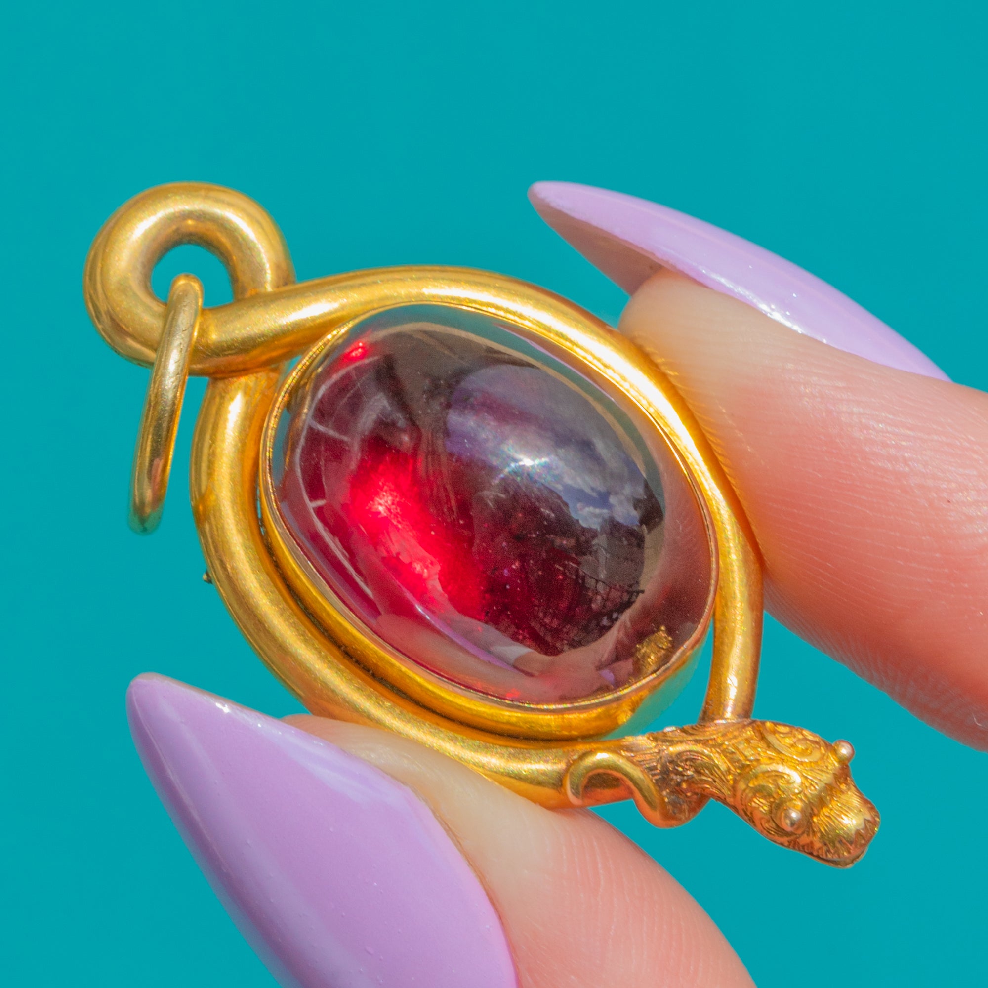 A sumptuous Victorian snake pendant in rich 18ct Gold, coiling protectively around a glowing 19.00ct Garnet cabochon. The high-domed oval Garnet moves from deep claret to near-black depending on the light, its smooth dome embraced by a continuous serpent bezel that loops seamlessly into the integrated bail. The sculpted, lifelike snake head crowns the design with exquisite detail, while the reverse reveals a locket back for that quintessential 19th-century flourish.