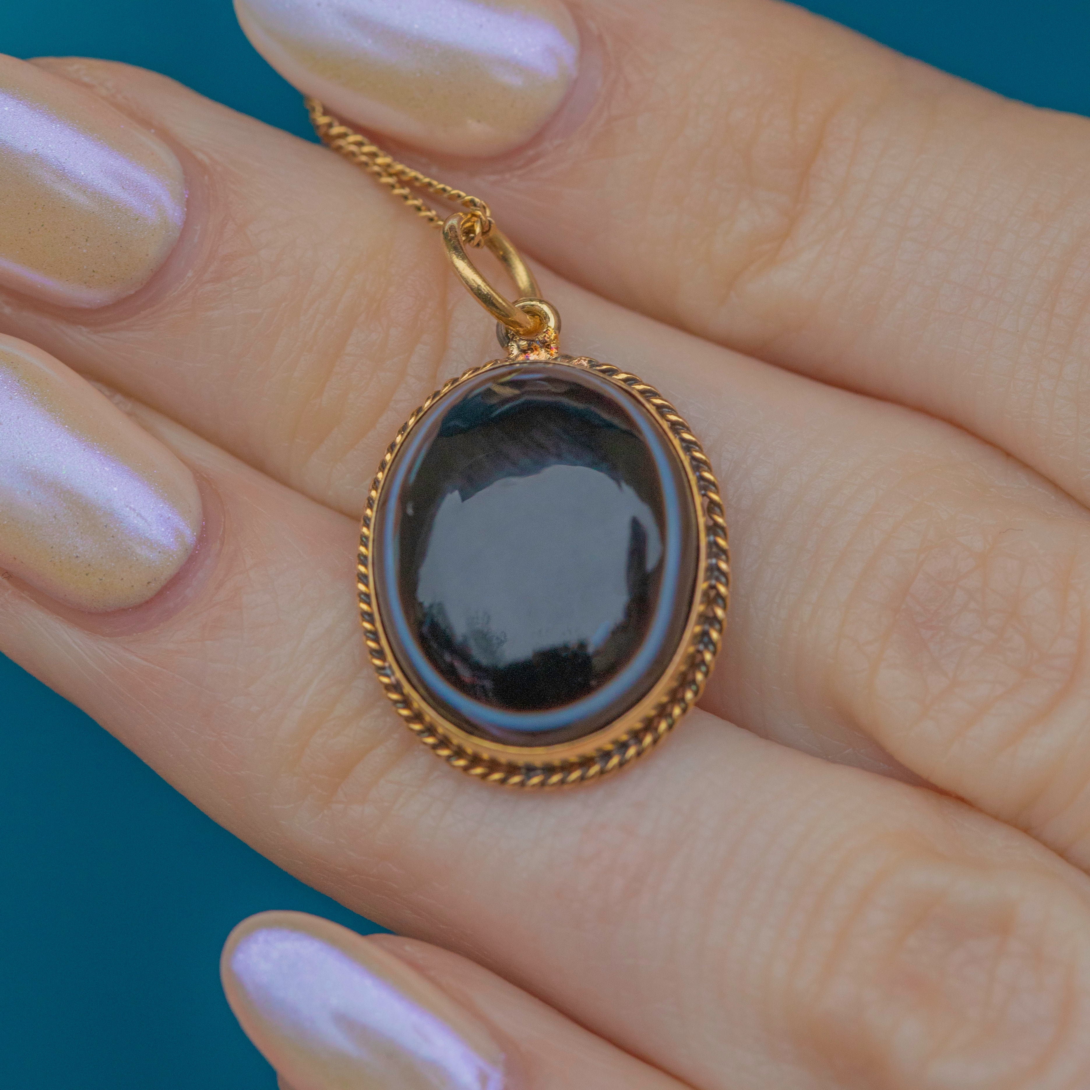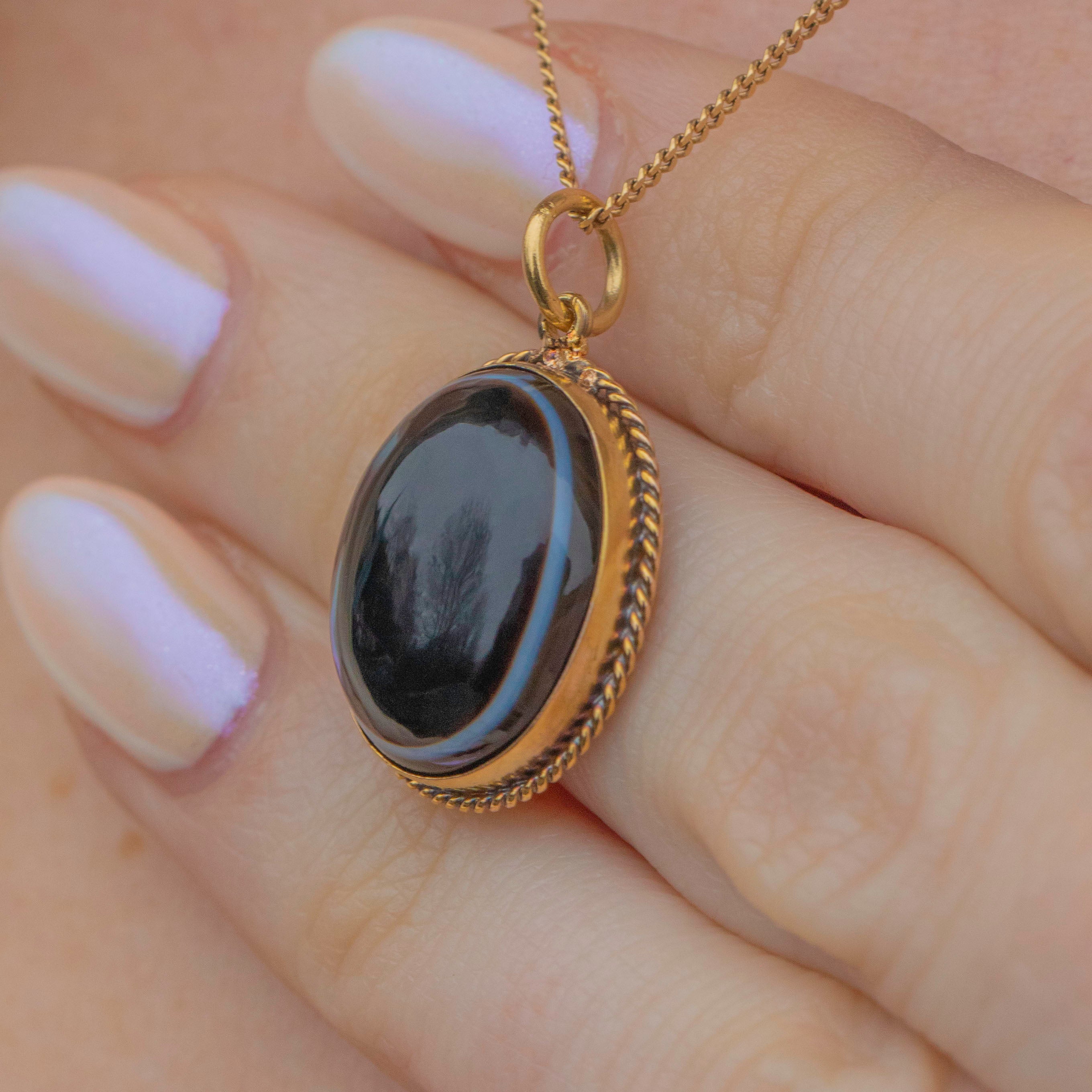 Prepare to lose yourself in this Victorian 15ct Gold Banded Agate pendant! Boasting an inky Agate with a thin white band haloing her circumference, she is complemented by 15ct Gold roped border radiating around her edges.