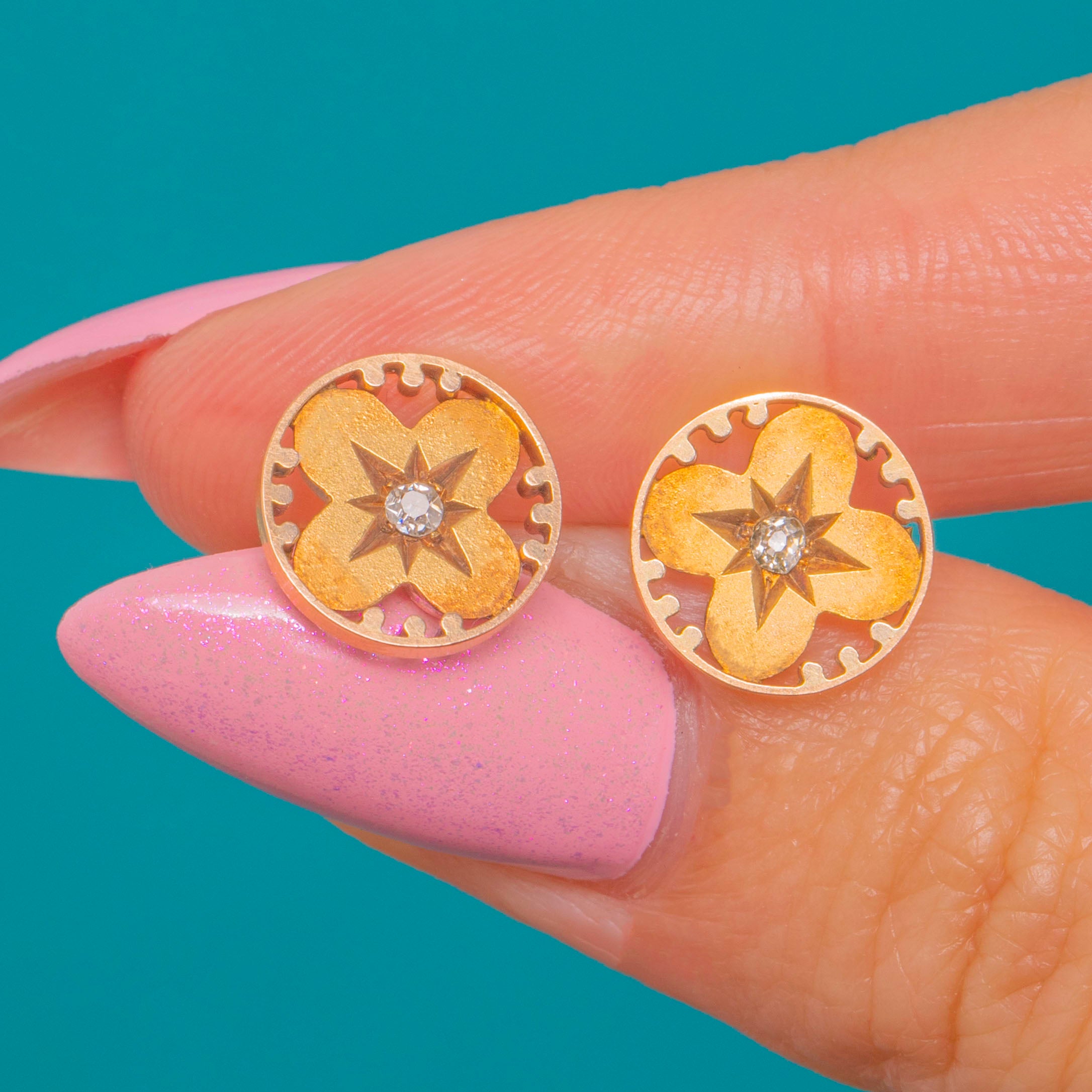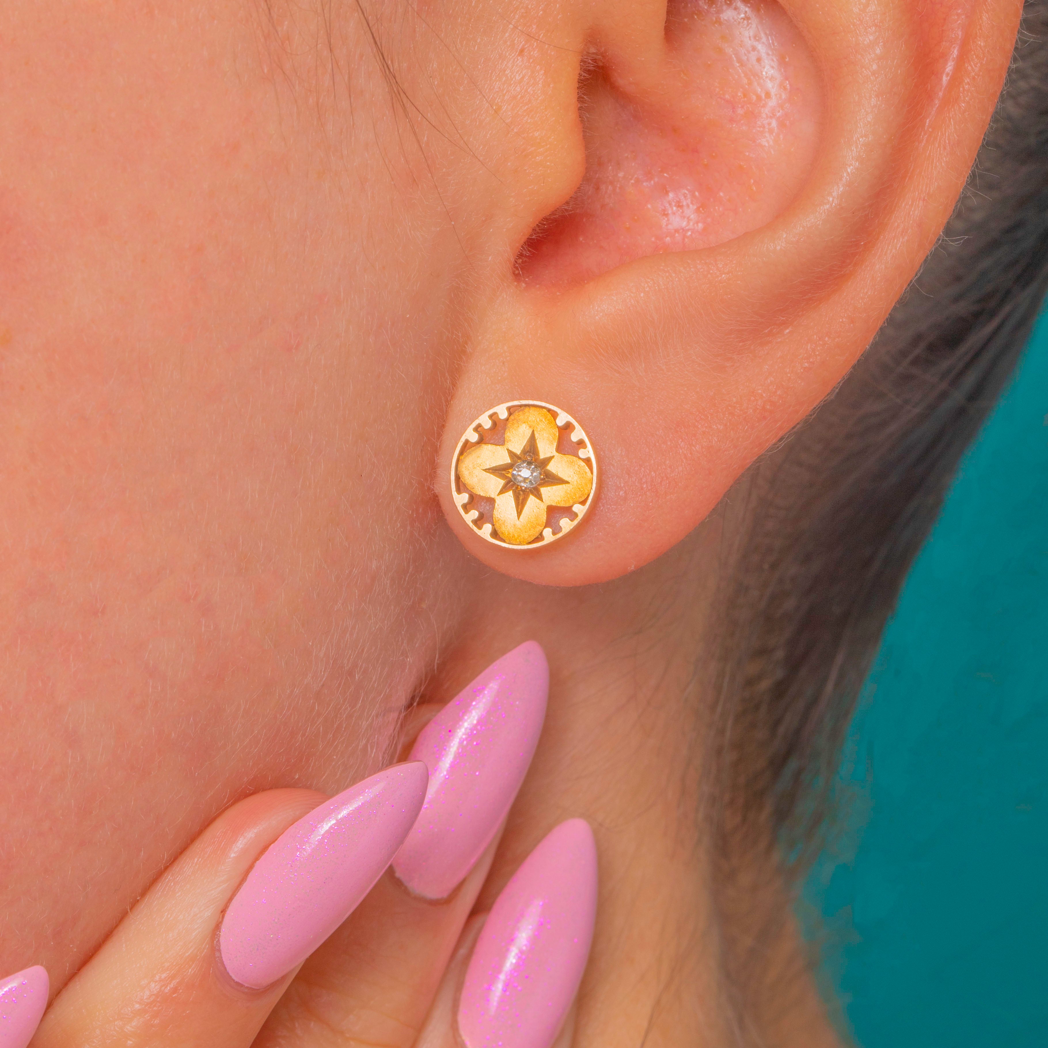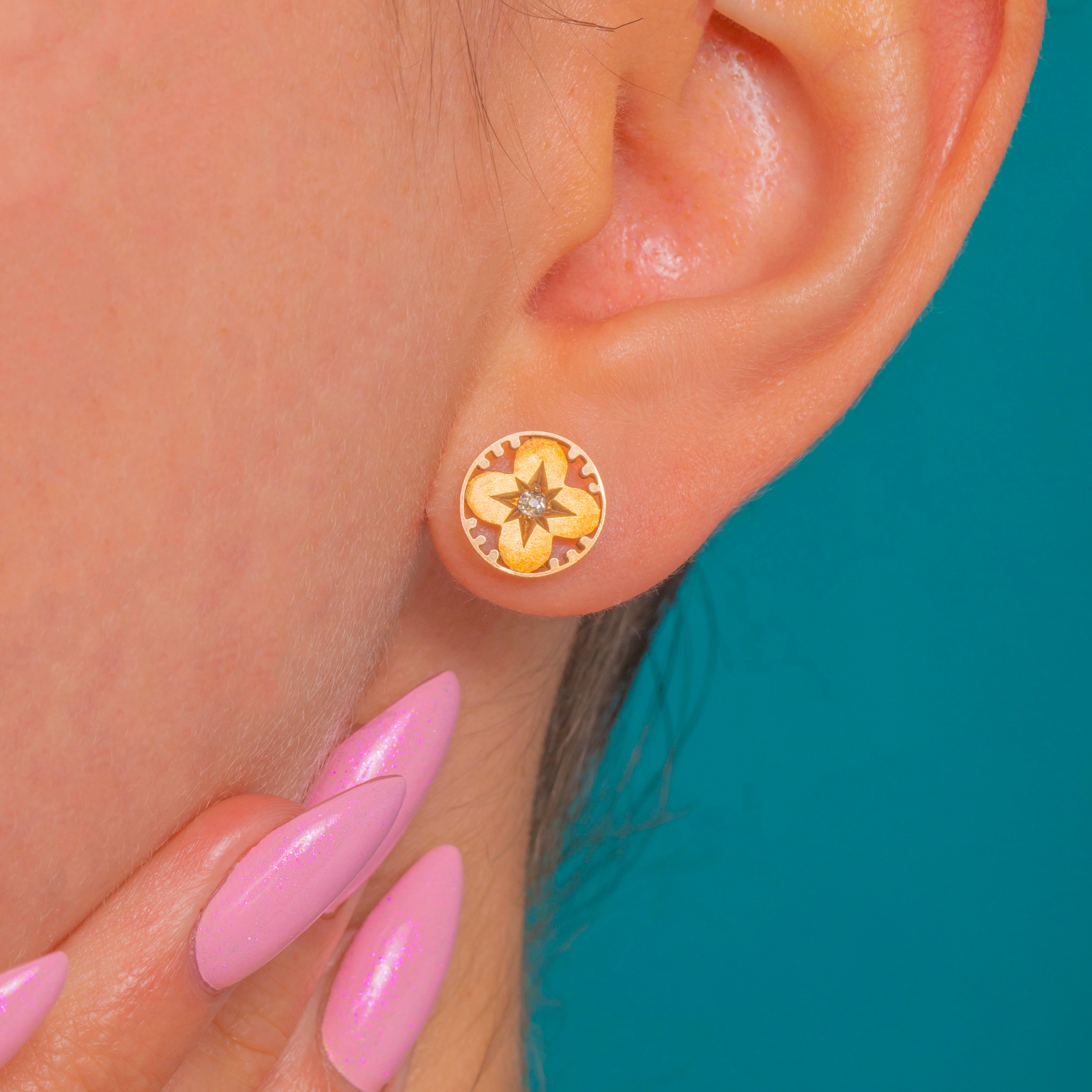 These Victorian 15ct Gold “clover” disk studs are a petite delight, bringing together celestial sparkle and botanical charm. Each earring is centred by a star-set Diamond nestled within a softly domed quatrefoil boss, the motif framed by a delicately scalloped border with a refined play of satin and polished finishes.