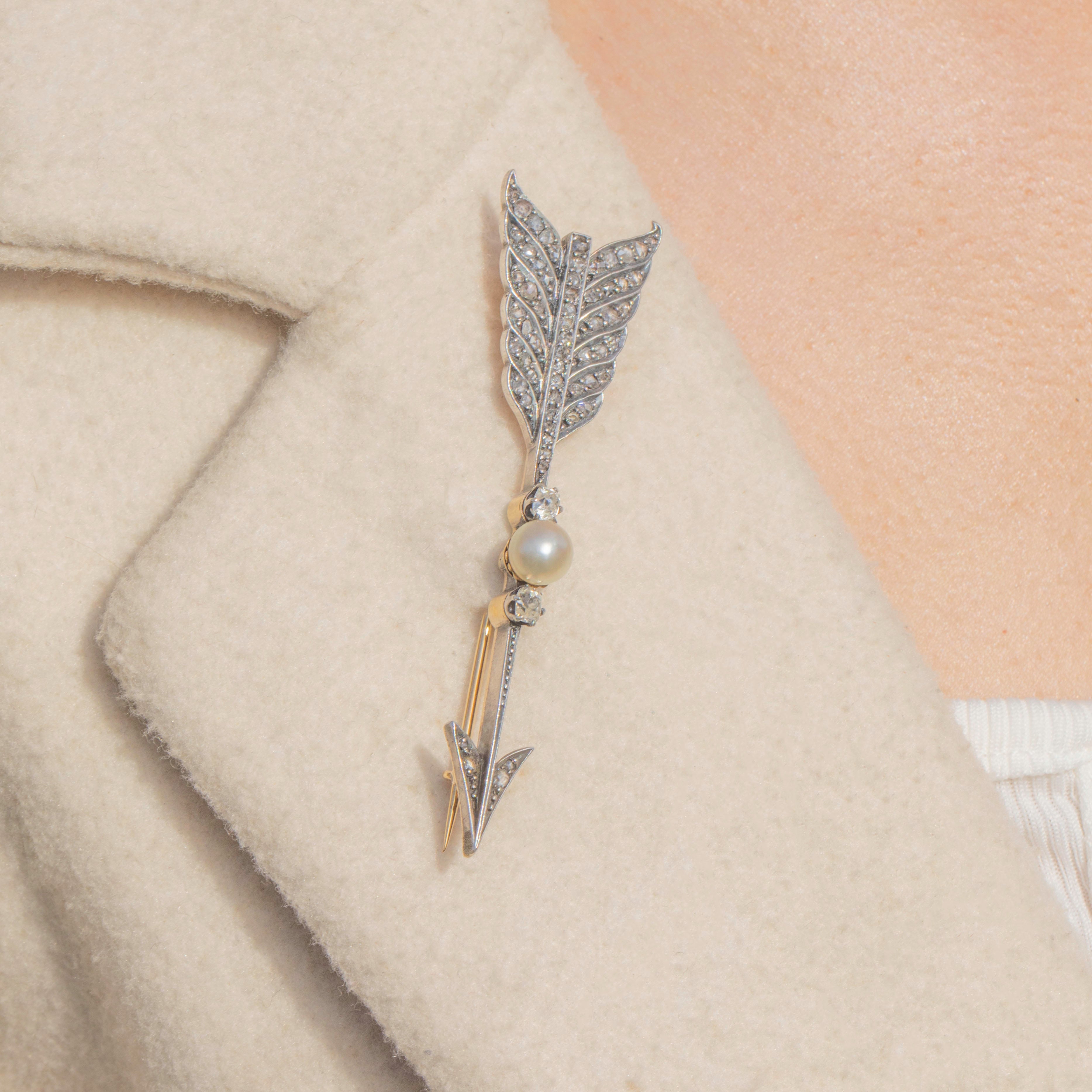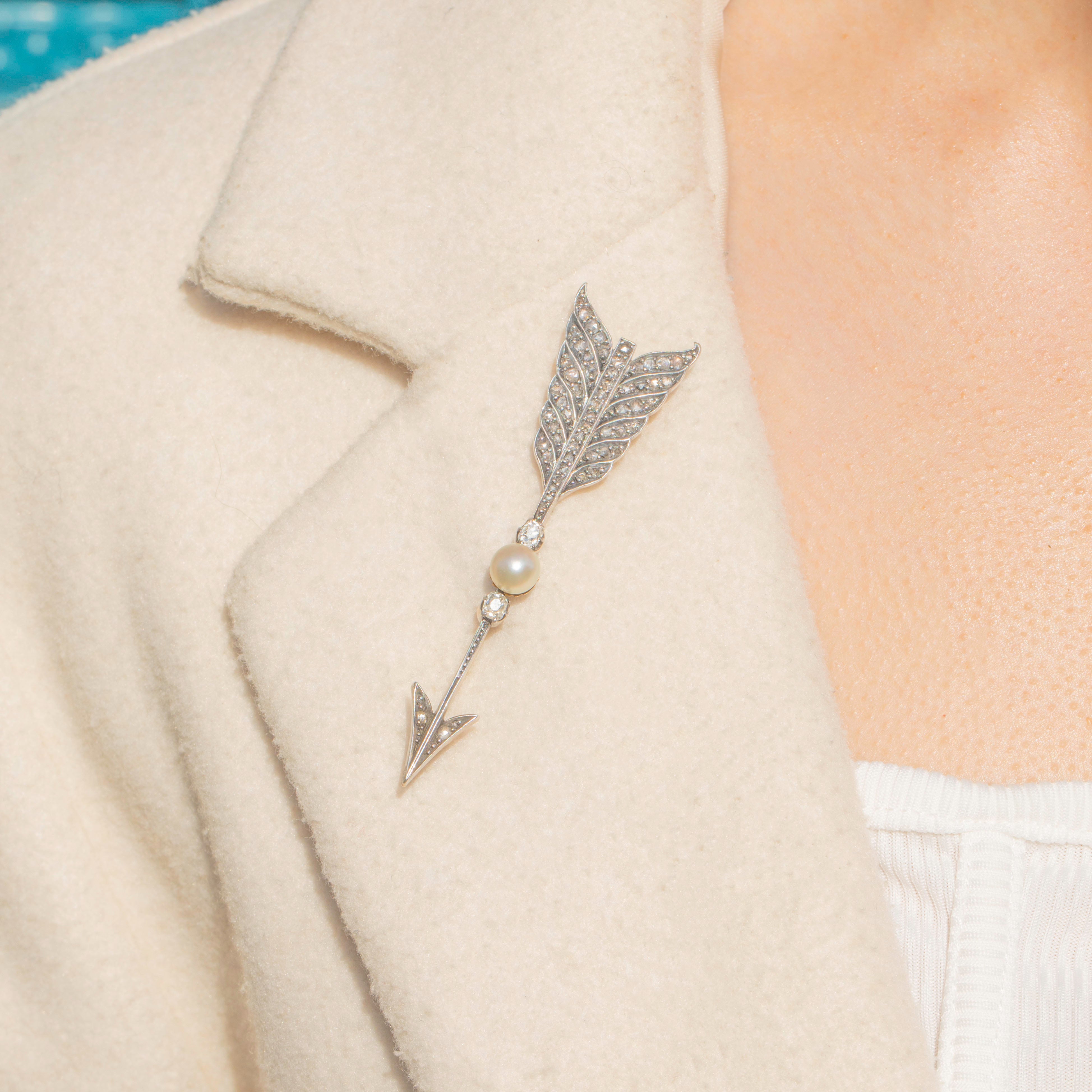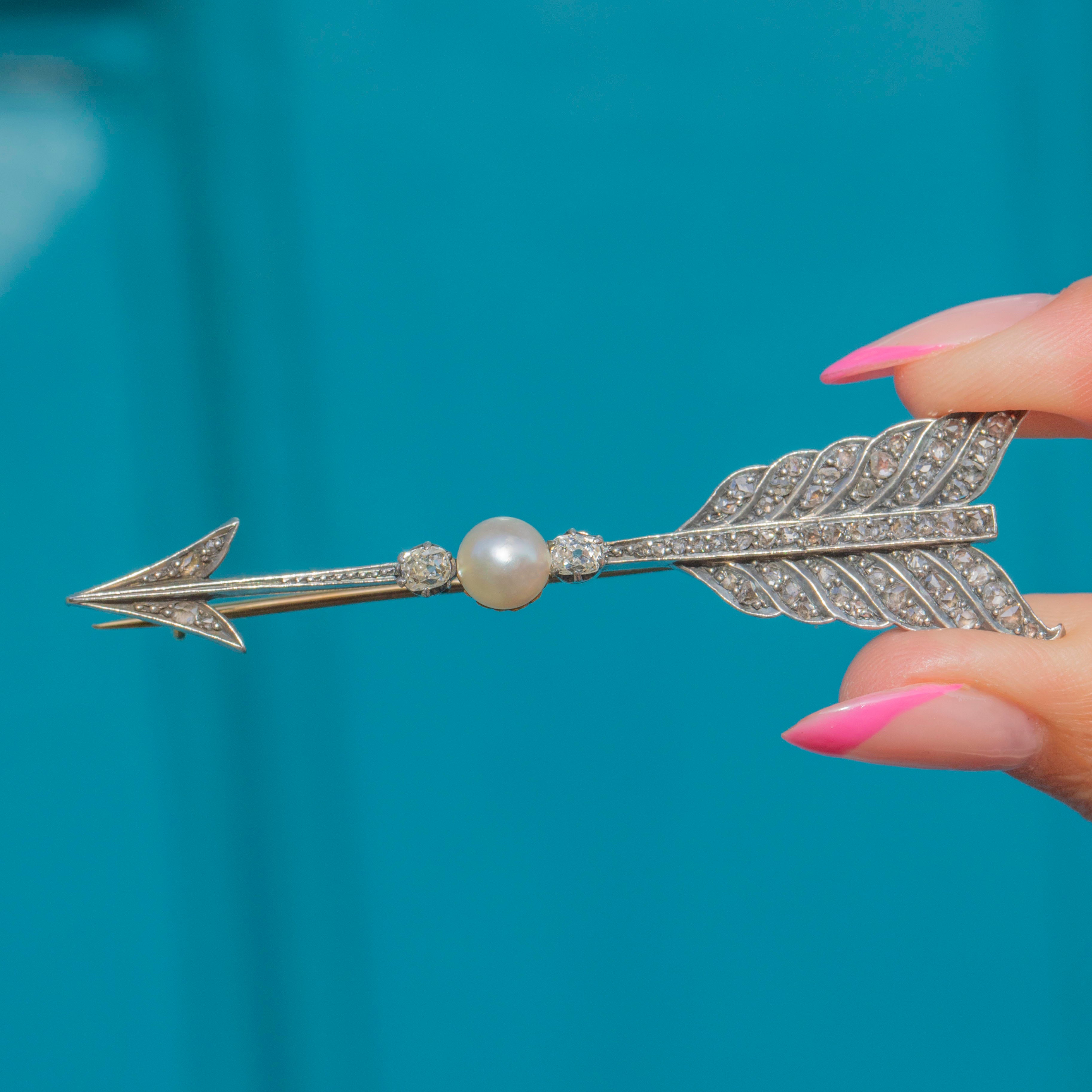 As Cupid sends this Victorian 15ct Gold Diamond Pearl arrow brooch into your jewellery collection, hearts are sure to flutter. With a sea of scintillating rose-cut and old-mine cut Diamonds, with a combined carat weight of 1.17ct, this antique brooch will serenade any onlooker as she is affixed to your jacket lapel.