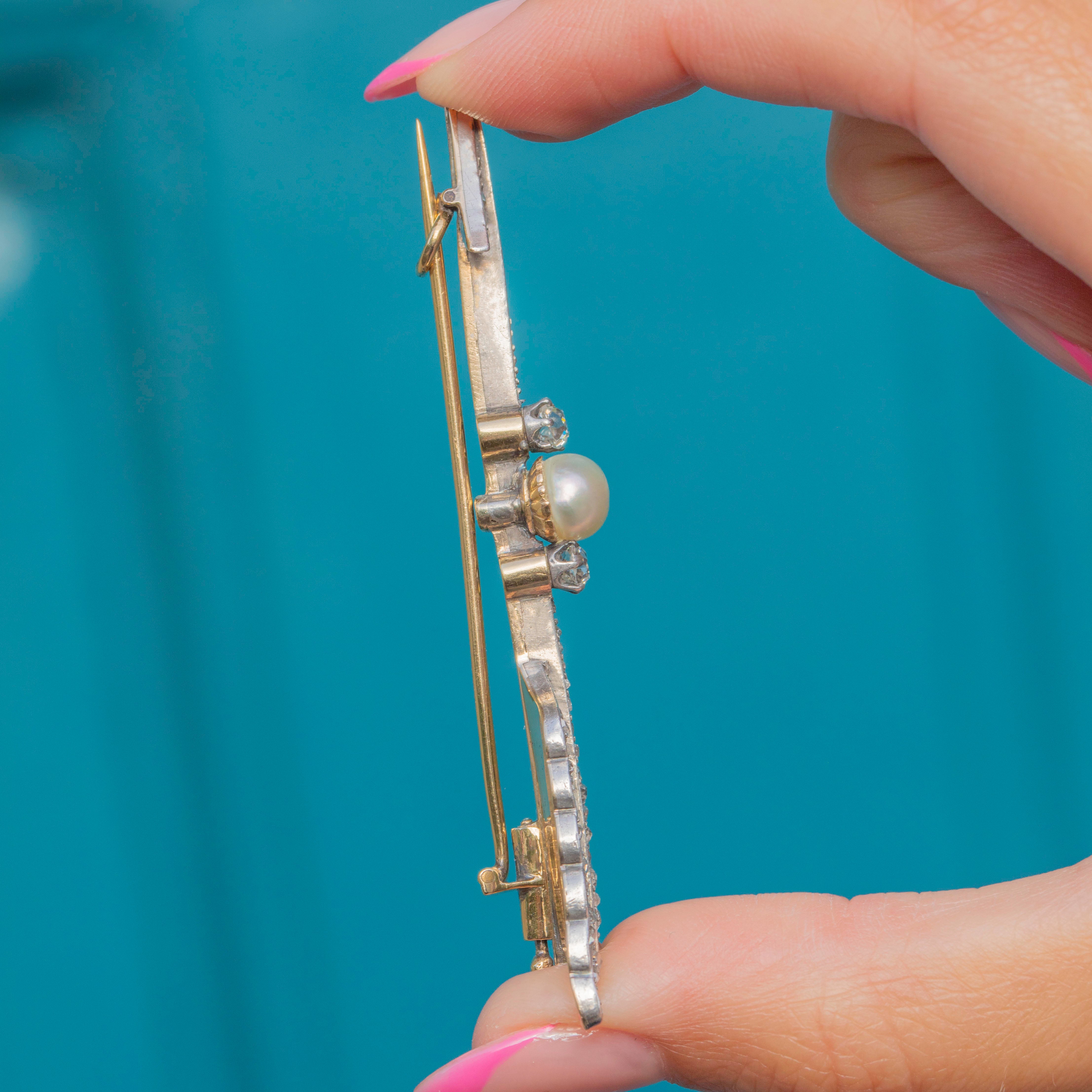 MATERIALS: Tests as Sterling Silver body backed with 15ct Gold & 15ct Gold brooch fittings, Old-Mine Cut Diamonds (0.30ct), Rose-Cut Diamonds (0.87ct), Pearl.