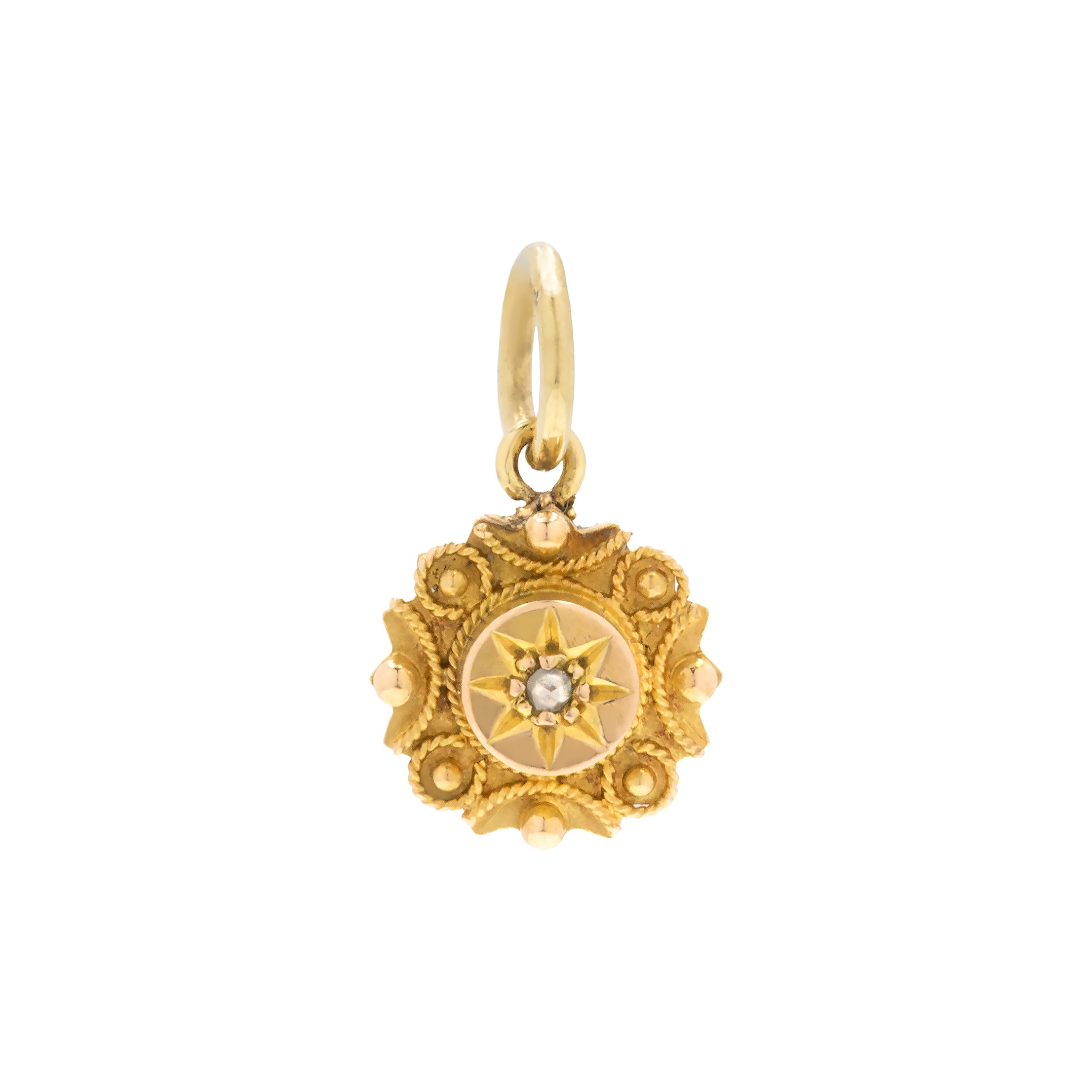 Add a touch of celestial charm to your outfit with this Victorian 15ct Gold Etruscan Diamond charm! Crafted from solid 15ct Gold, this antique pendant showcases a star-set twinkling rose-cut Diamond at her centre surrounded by intricate details for a refined finish; this Etruscan beauty will feel right at home in your jewellery box.