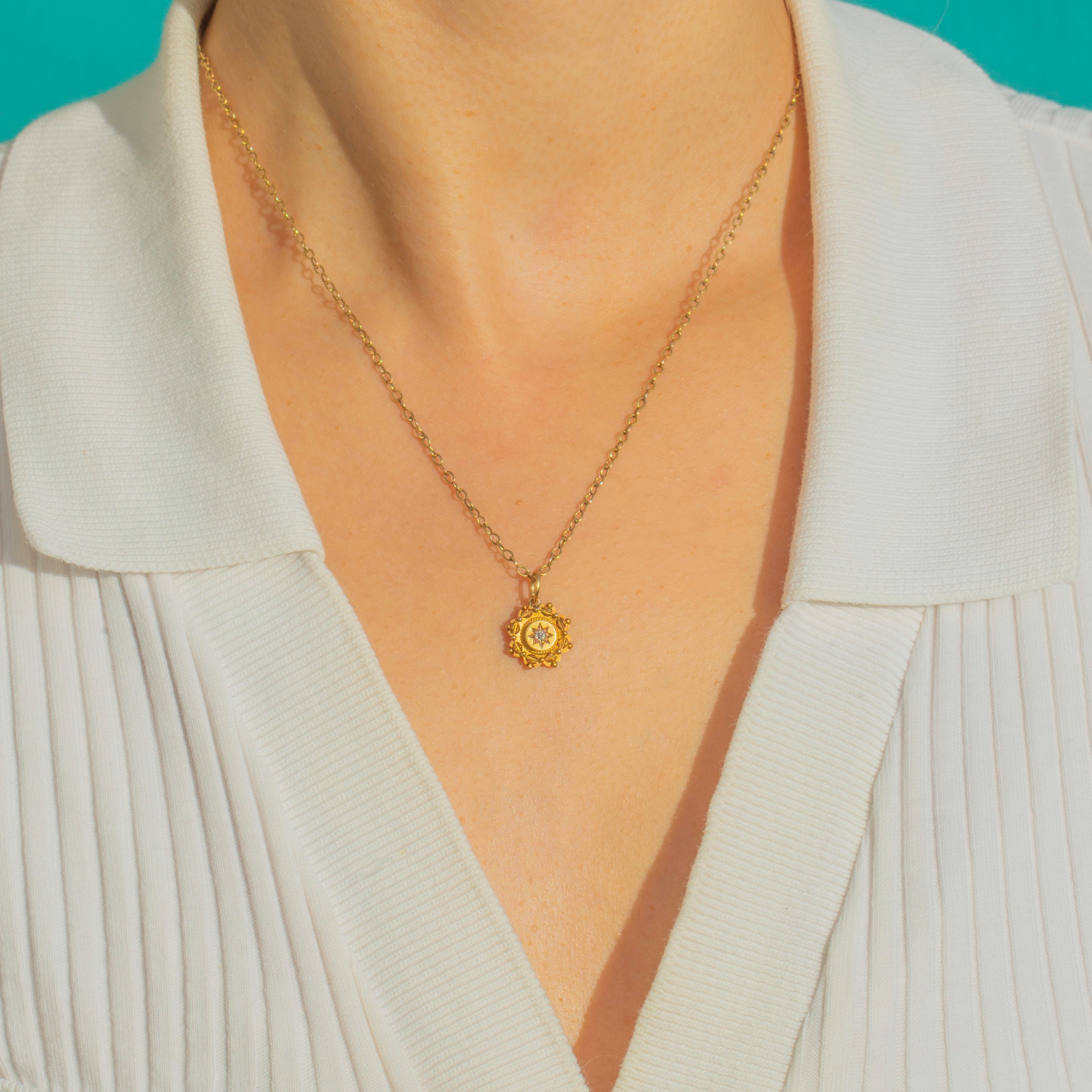 VERY GOOD-EXCELLENT: Evidence of a historical conversion, likely from a stick pin, otherwise in lovely condition. The Diamond is bright and secure, and the Gold surface retains its crisp Etruscan granulation with only light age-related wear.