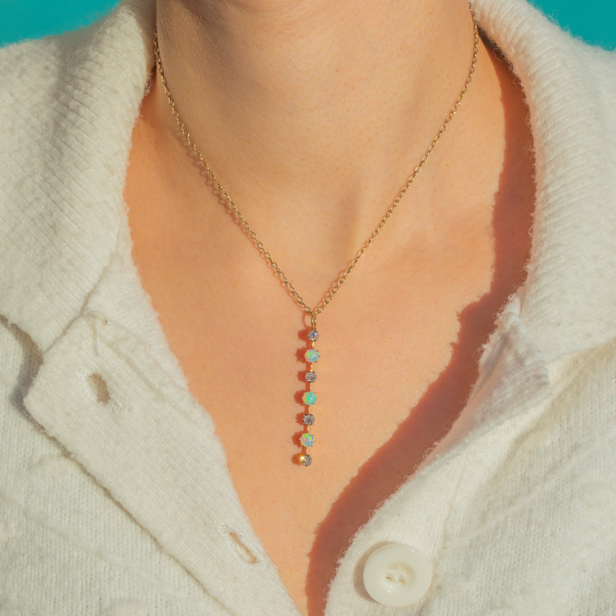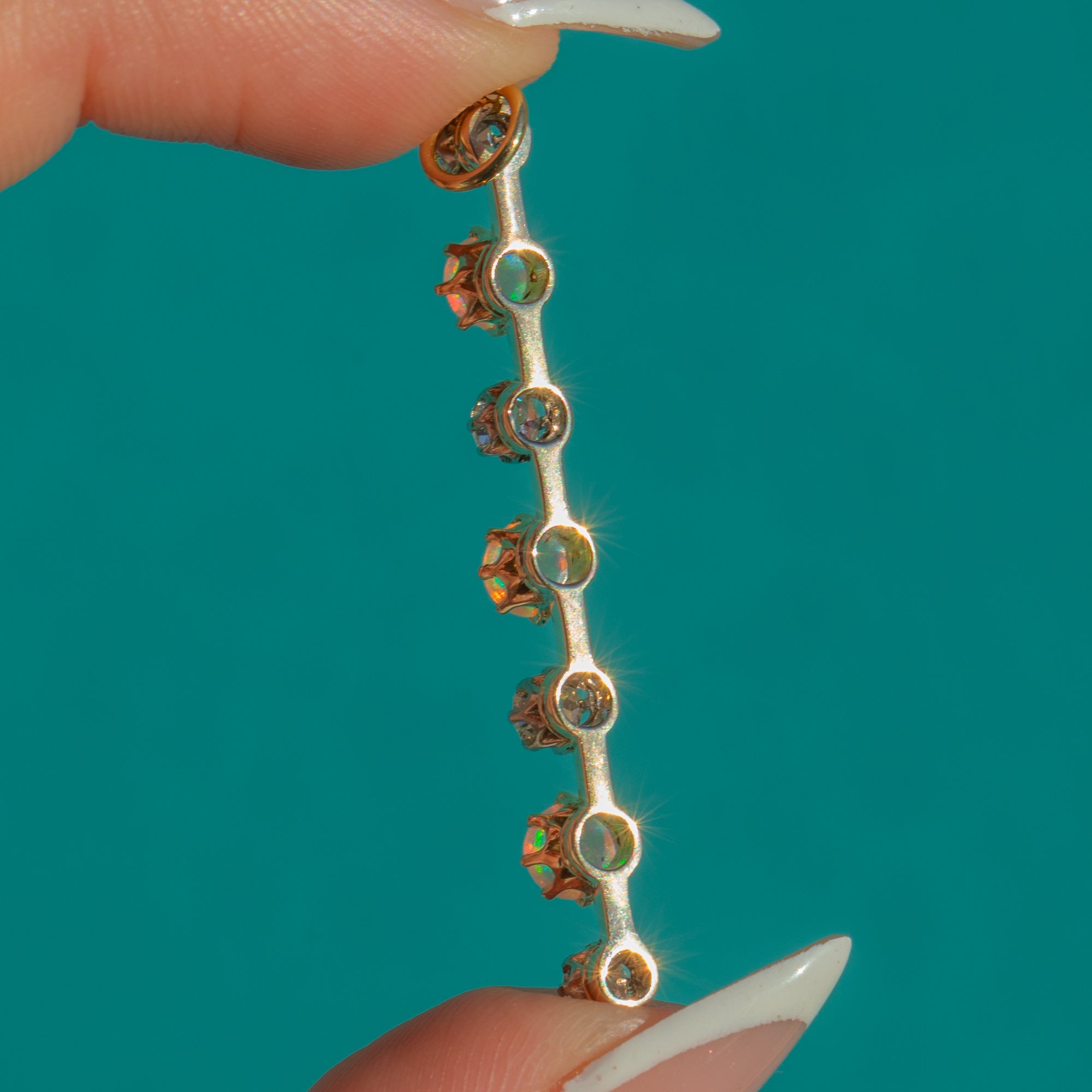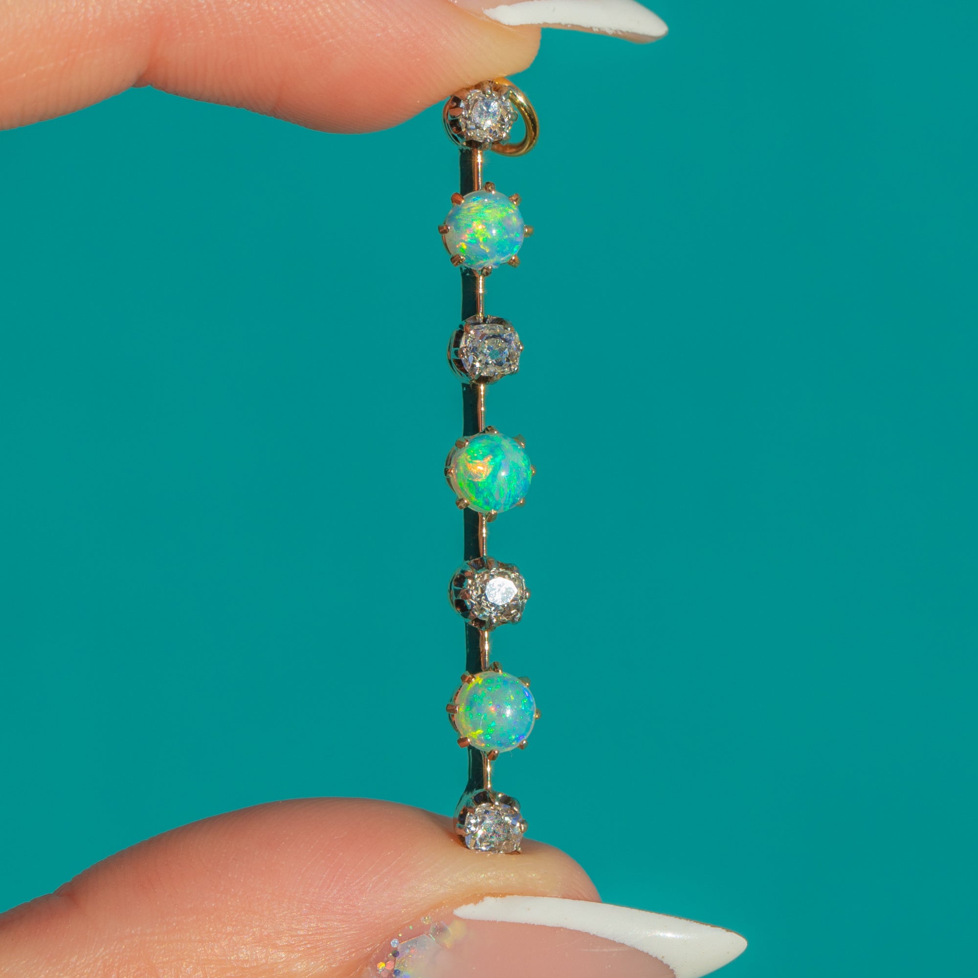 A refined Victorian bar pendant in 15ct Gold, set with a beautiful rhythm of glowing Opals and sparkling old mine-cut Diamonds. The stones alternate along a slender spine in delicate coronet settings with open backs, allowing the Diamonds to scintillate and the Opals to display their vibrant play-of-colour. Crisp settings and a graceful, elongated silhouette make this a timeless piece to cherish and wear with ease.