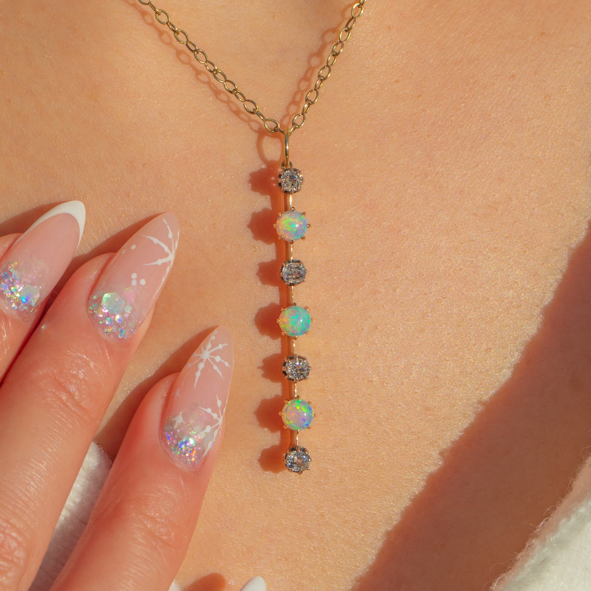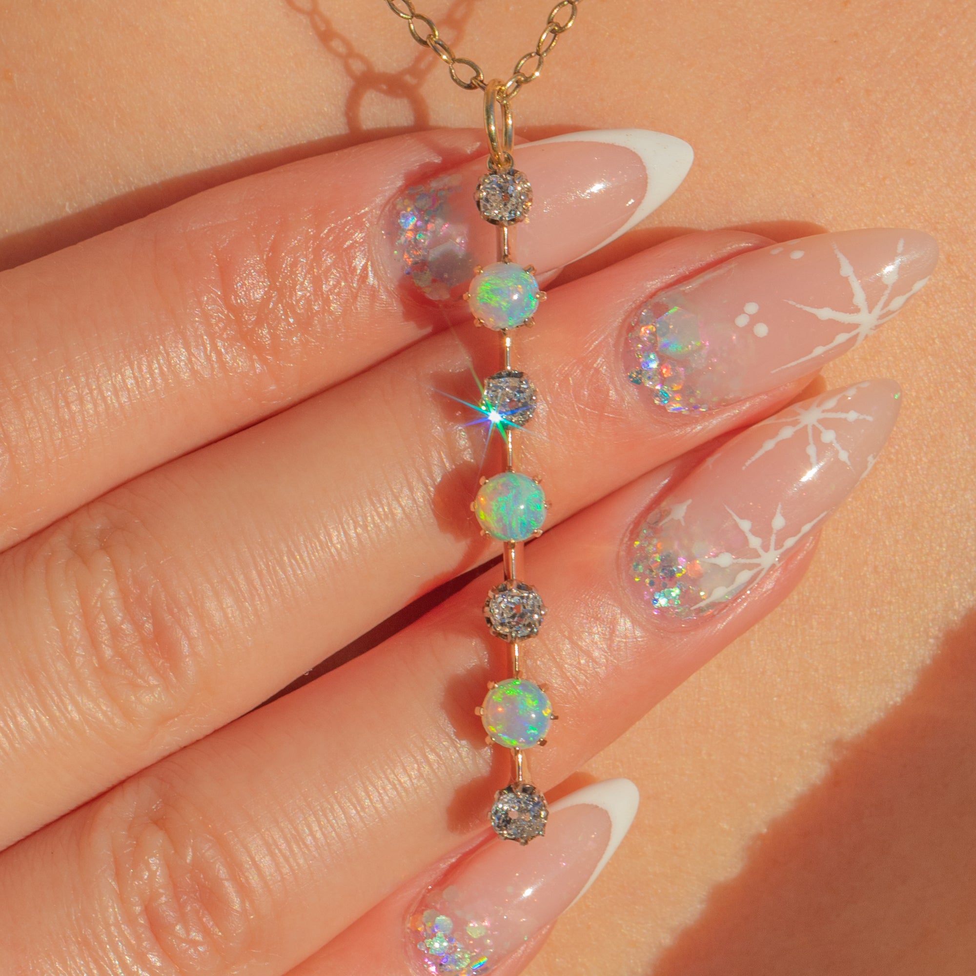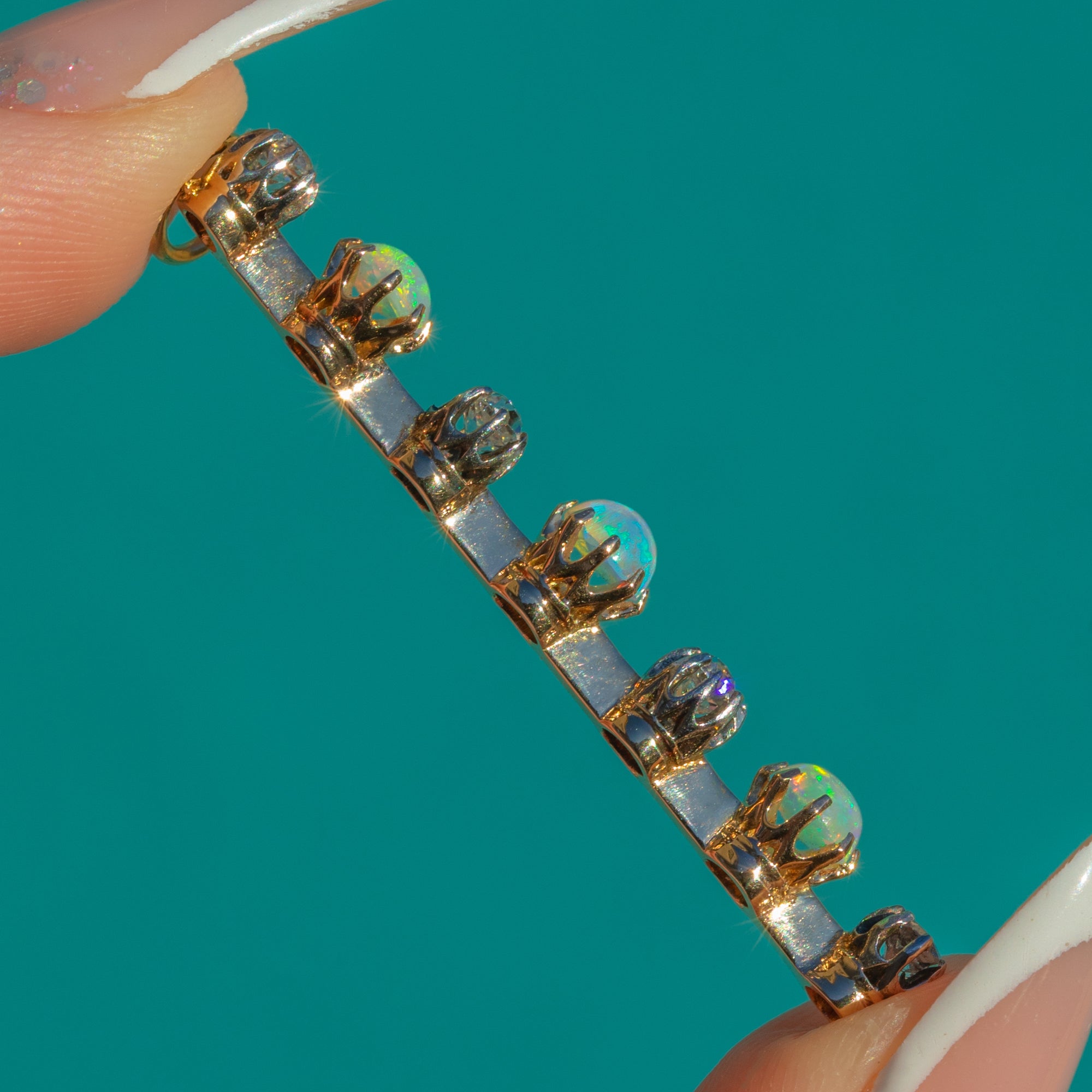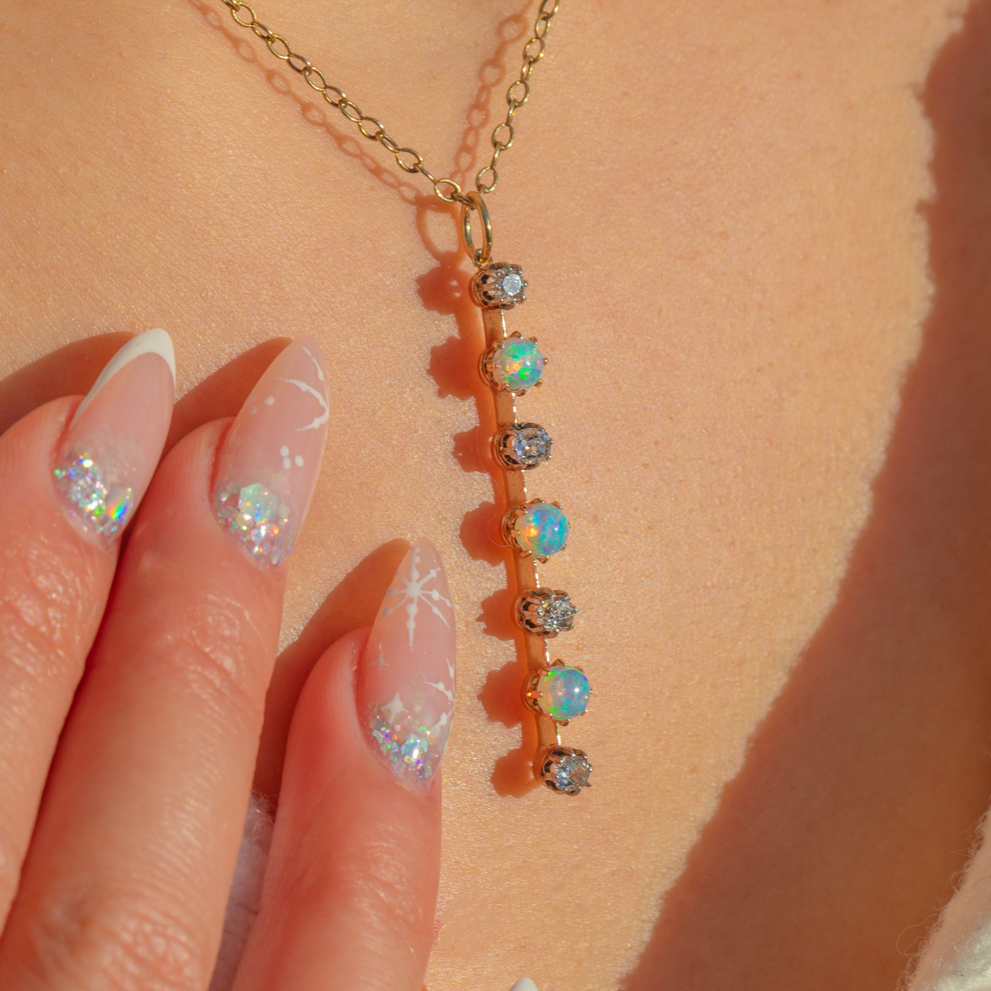 A refined Victorian bar pendant in 15ct Gold, set with a beautiful rhythm of glowing Opals and sparkling old mine-cut Diamonds. The stones alternate along a slender spine in delicate coronet settings with open backs, allowing the Diamonds to scintillate and the Opals to display their vibrant play-of-colour. Crisp settings and a graceful, elongated silhouette make this a timeless piece to cherish and wear with ease.
