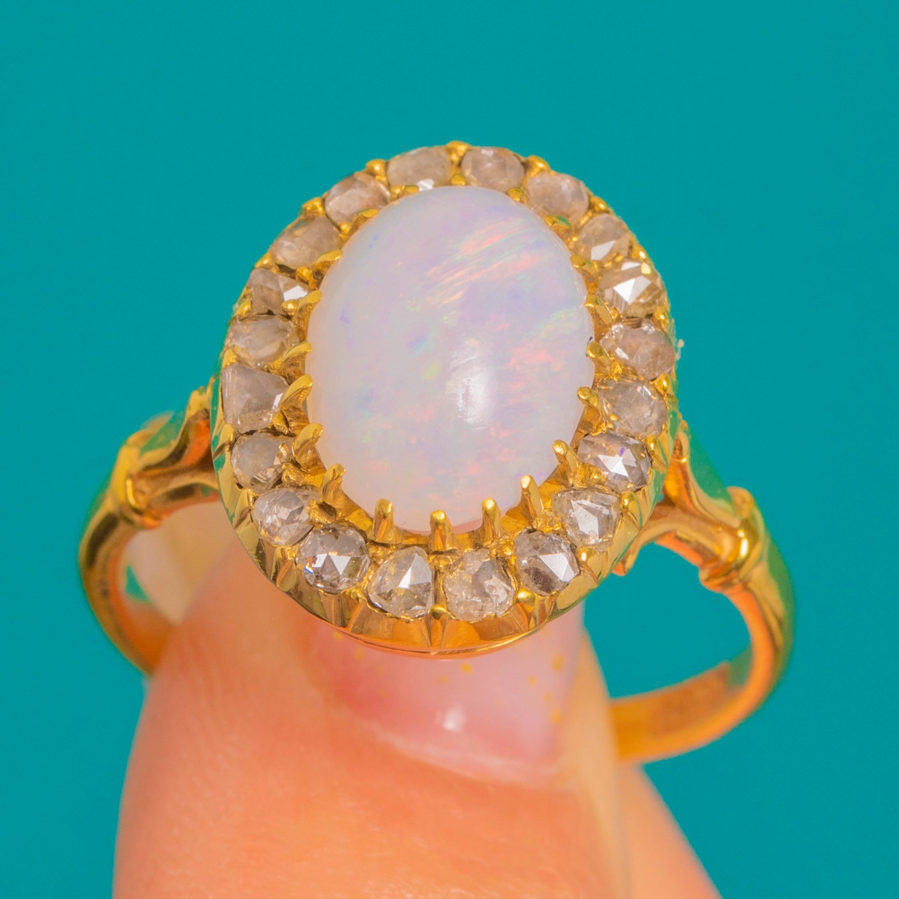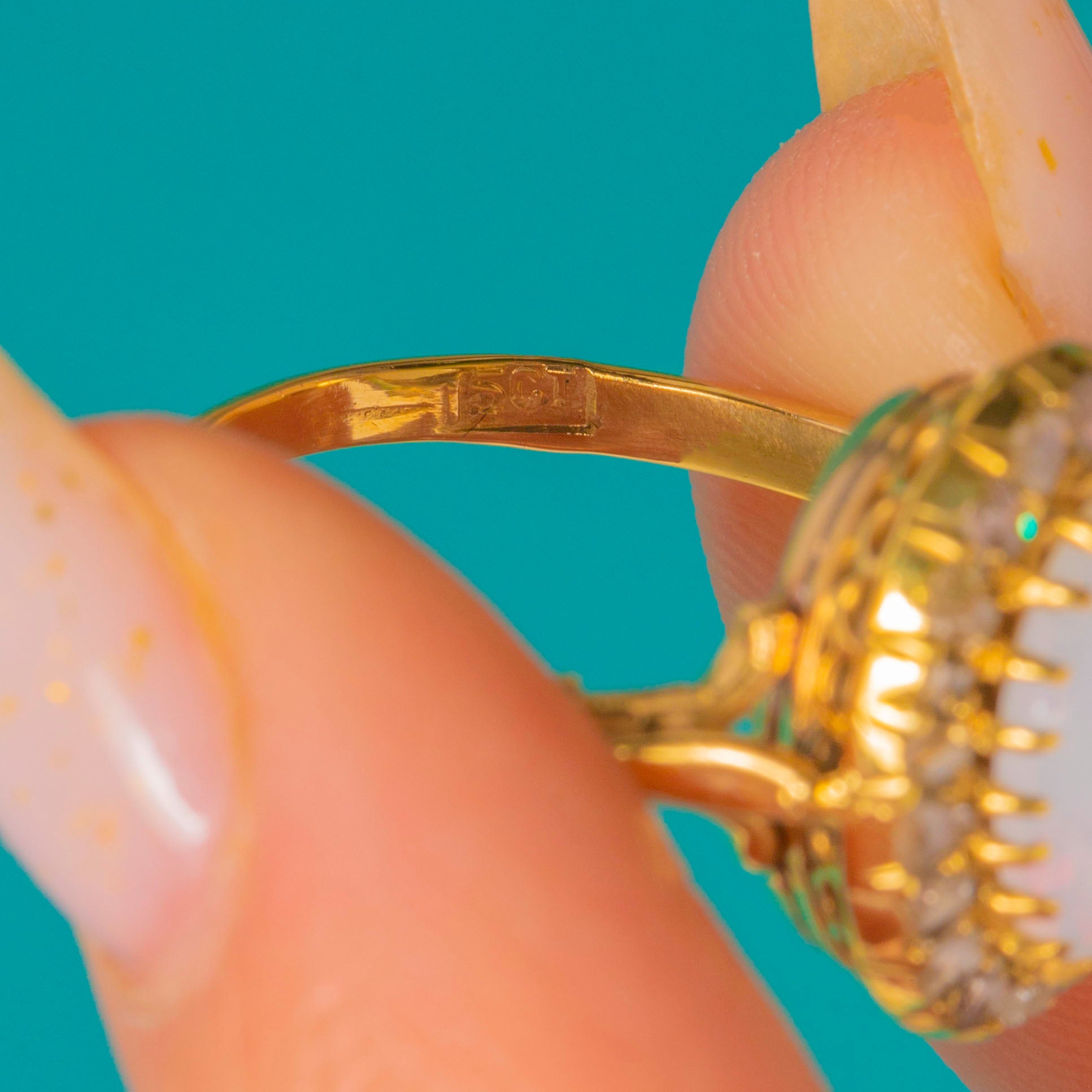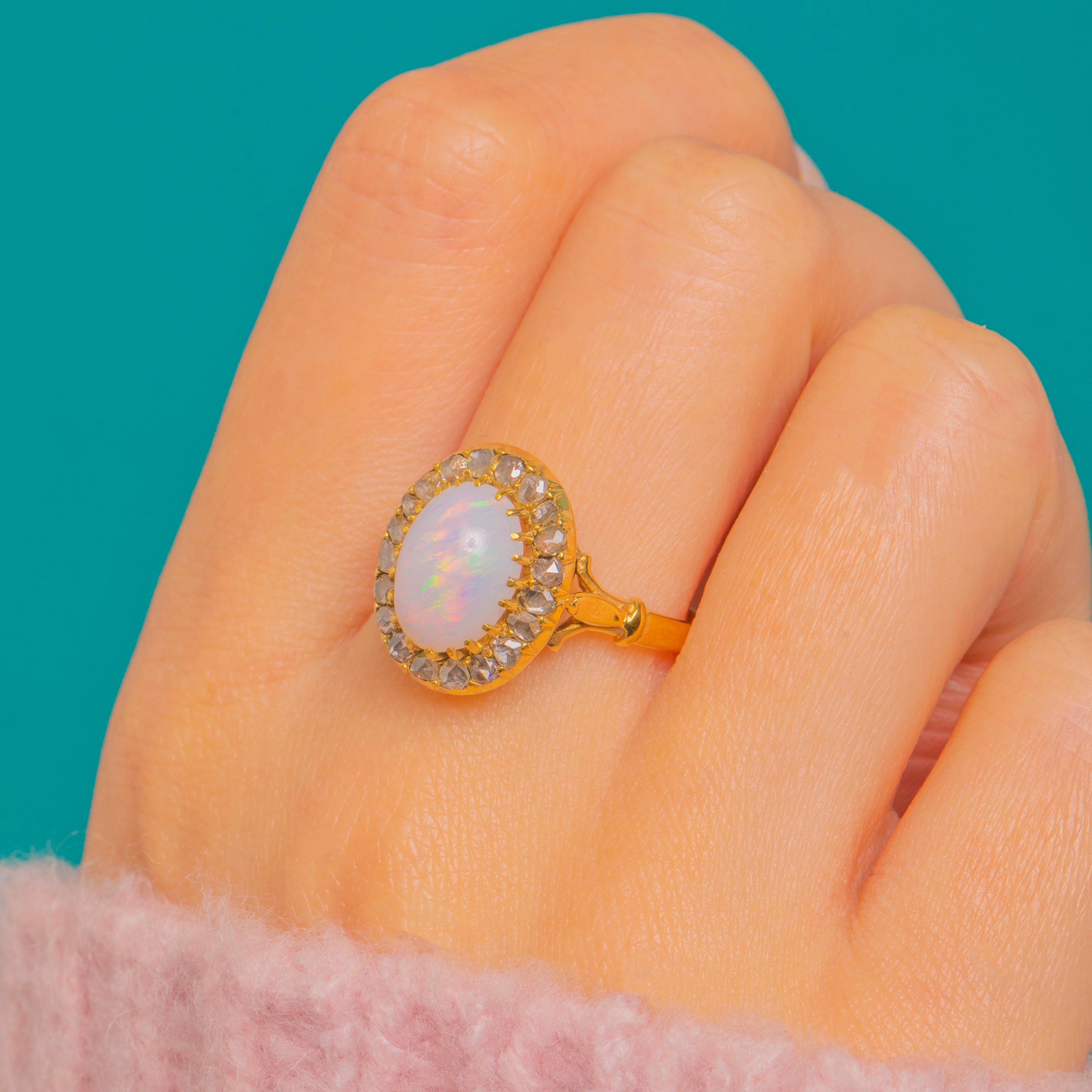 This delicate cluster ring pairs a high‑set, domed Opal cabochon with a halo of rose‑cut Diamonds, all set in warm 15ct Gold.
