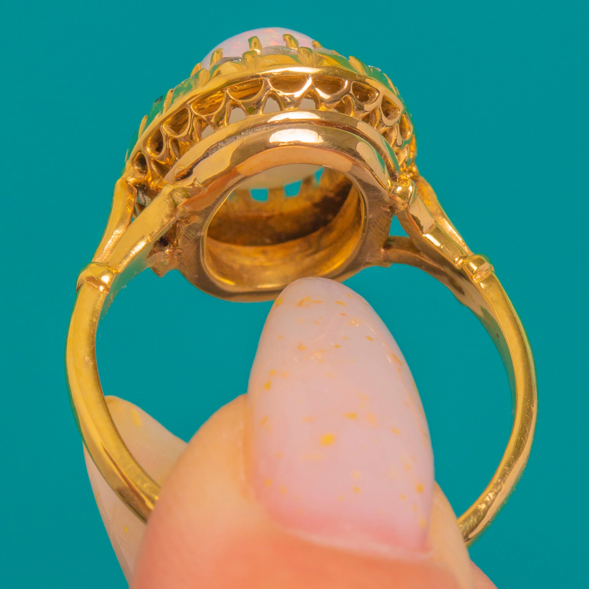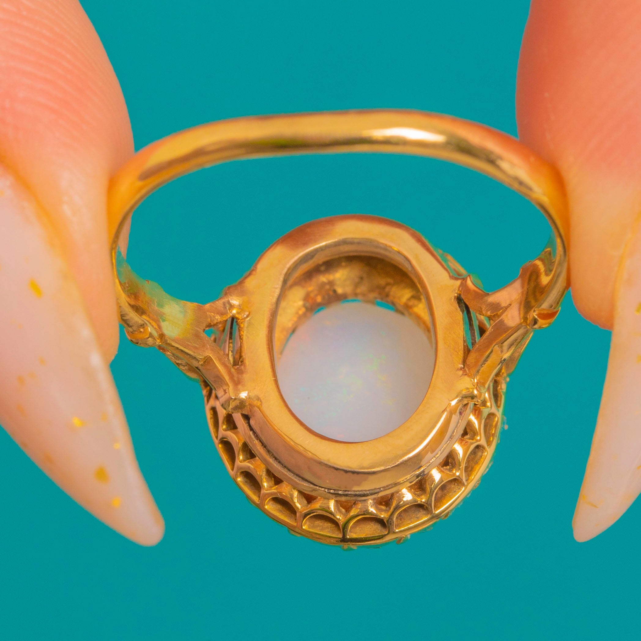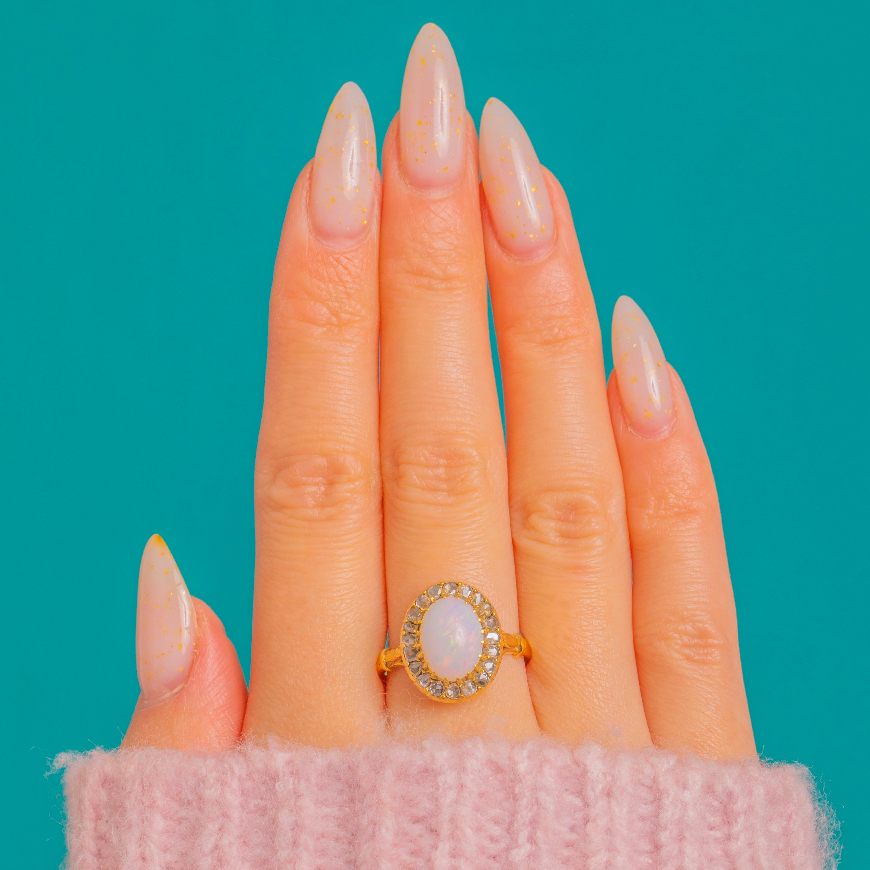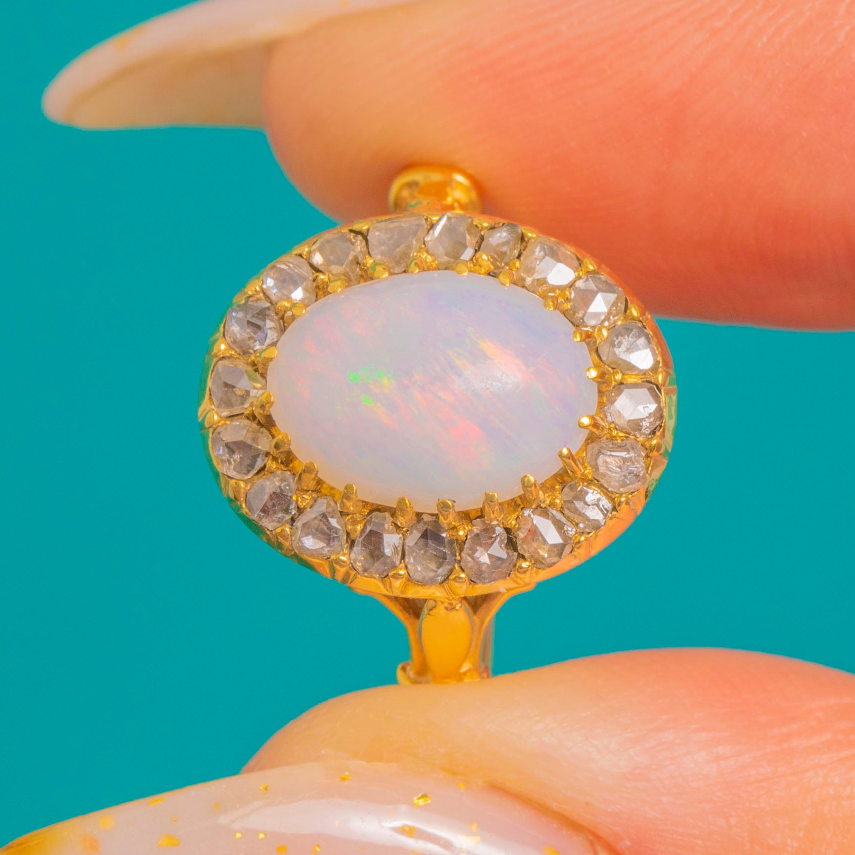 This delicate cluster ring pairs a high‑set, domed Opal cabochon with a halo of rose‑cut Diamonds, all set in warm 15ct Gold.