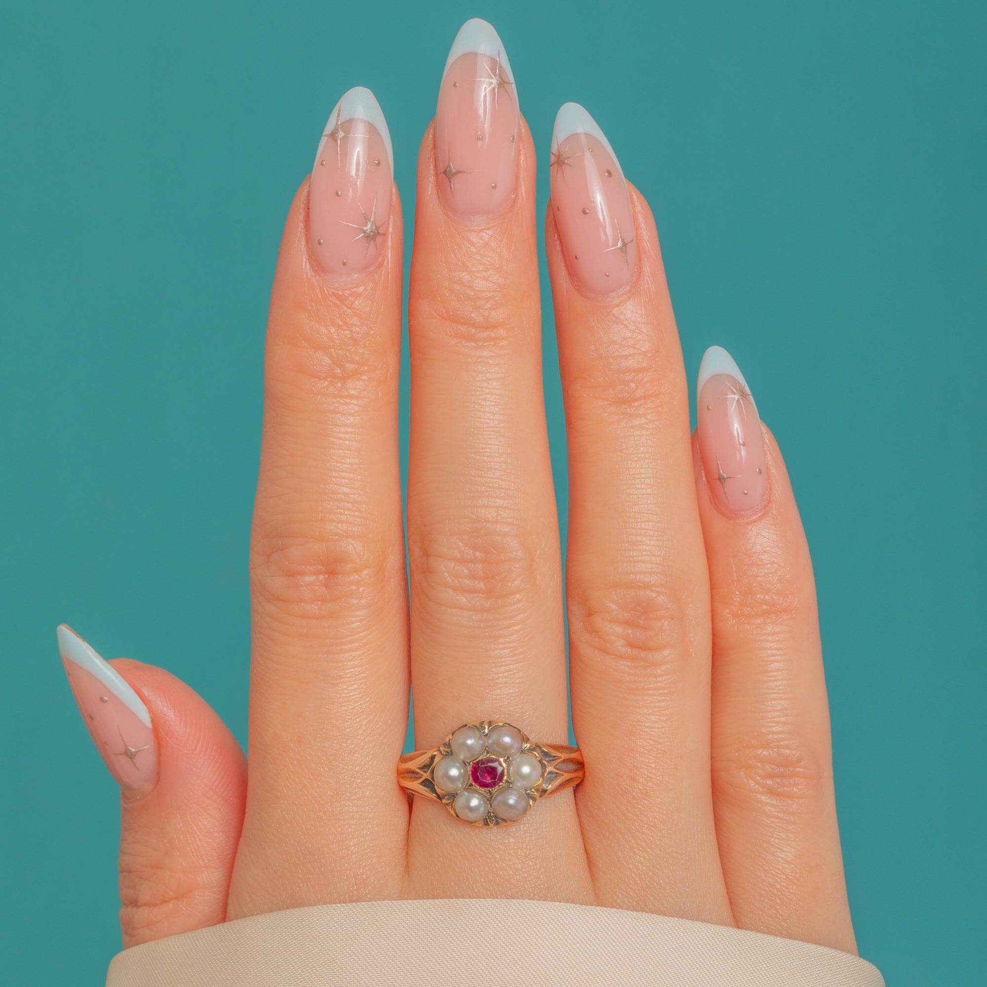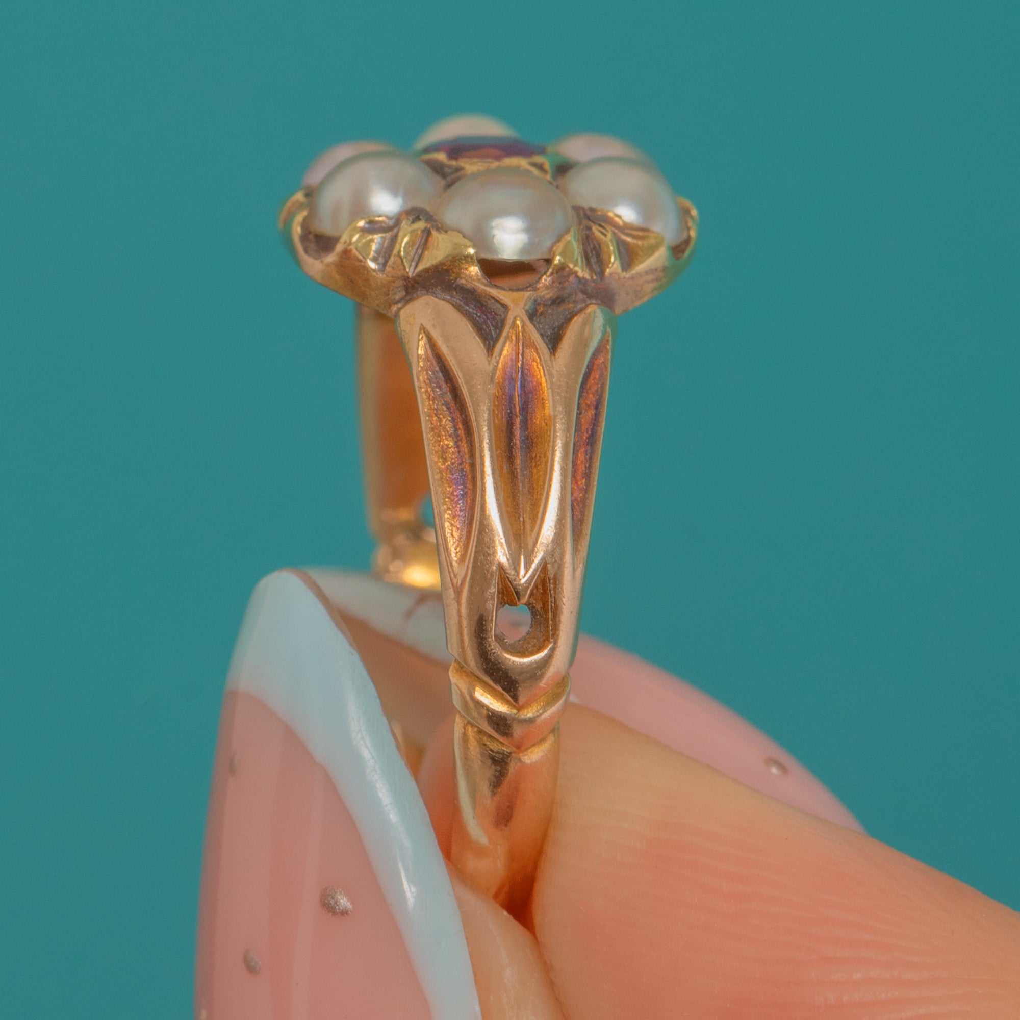 Pretty as a posy, this Victorian 15ct Gold cluster ring centres a lively round Ruby, haloed by six creamy Pearls in a classic daisy formation. The floral head is framed by a scalloped, star-edged setting and flows into elegant split, chased shoulders for a delicate, romantic silhouette.