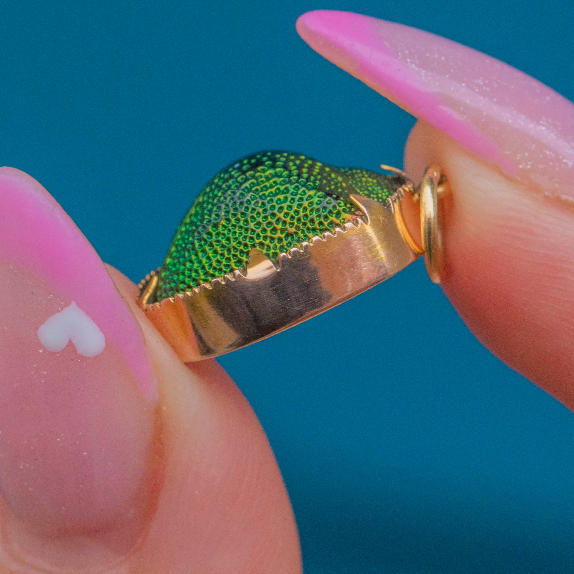 This fascinating Victorian charm features a genuine iridescent scarab beetle, mounted in a 15ct Gold setting. Its vibrant green carapace shimmers with natural metallic hues, changing beautifully in the light.