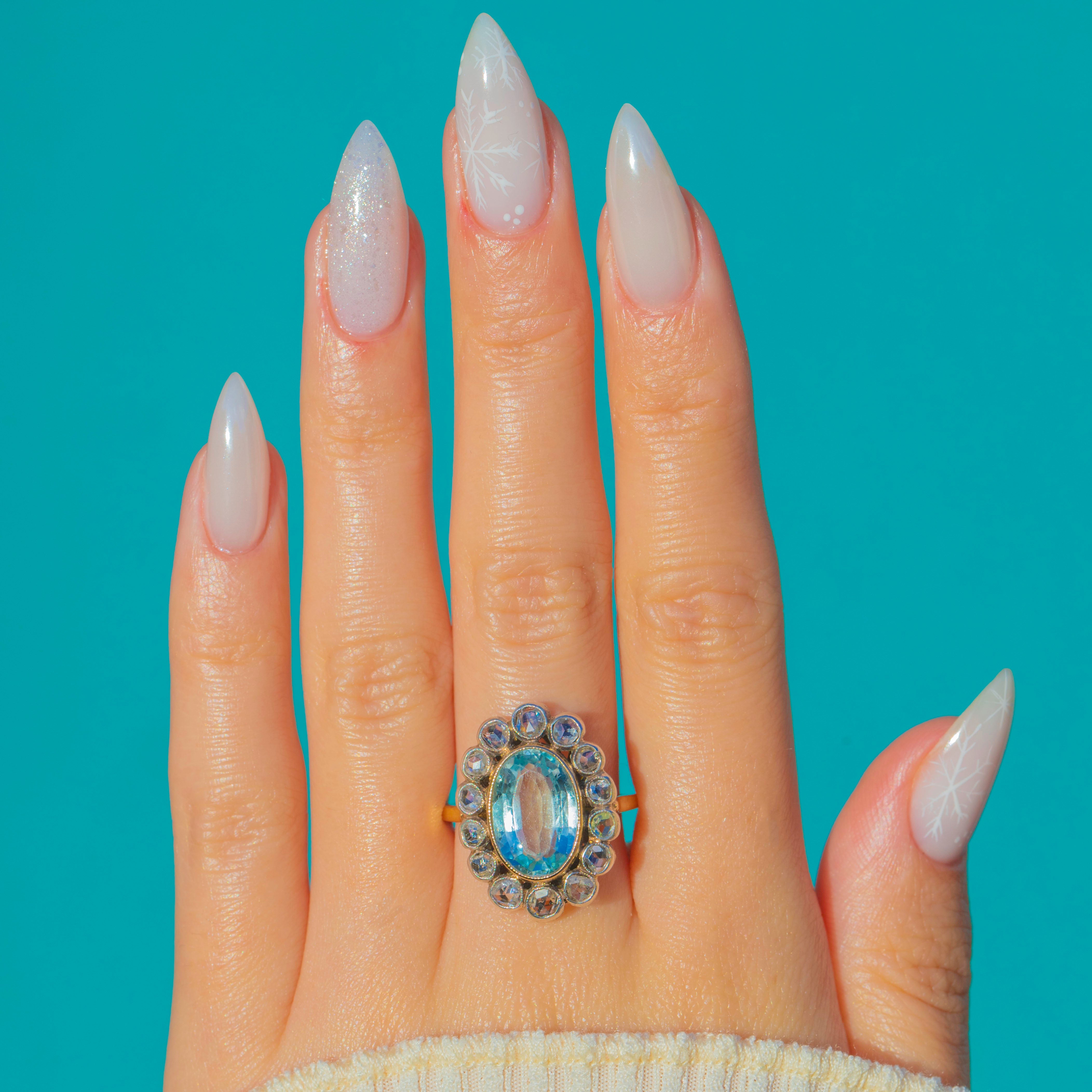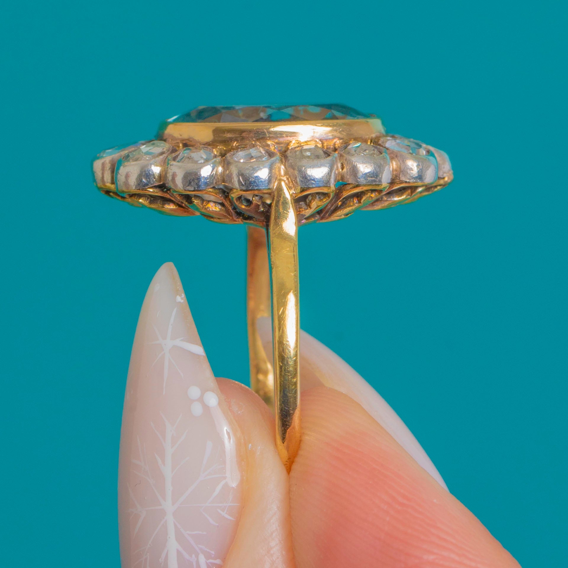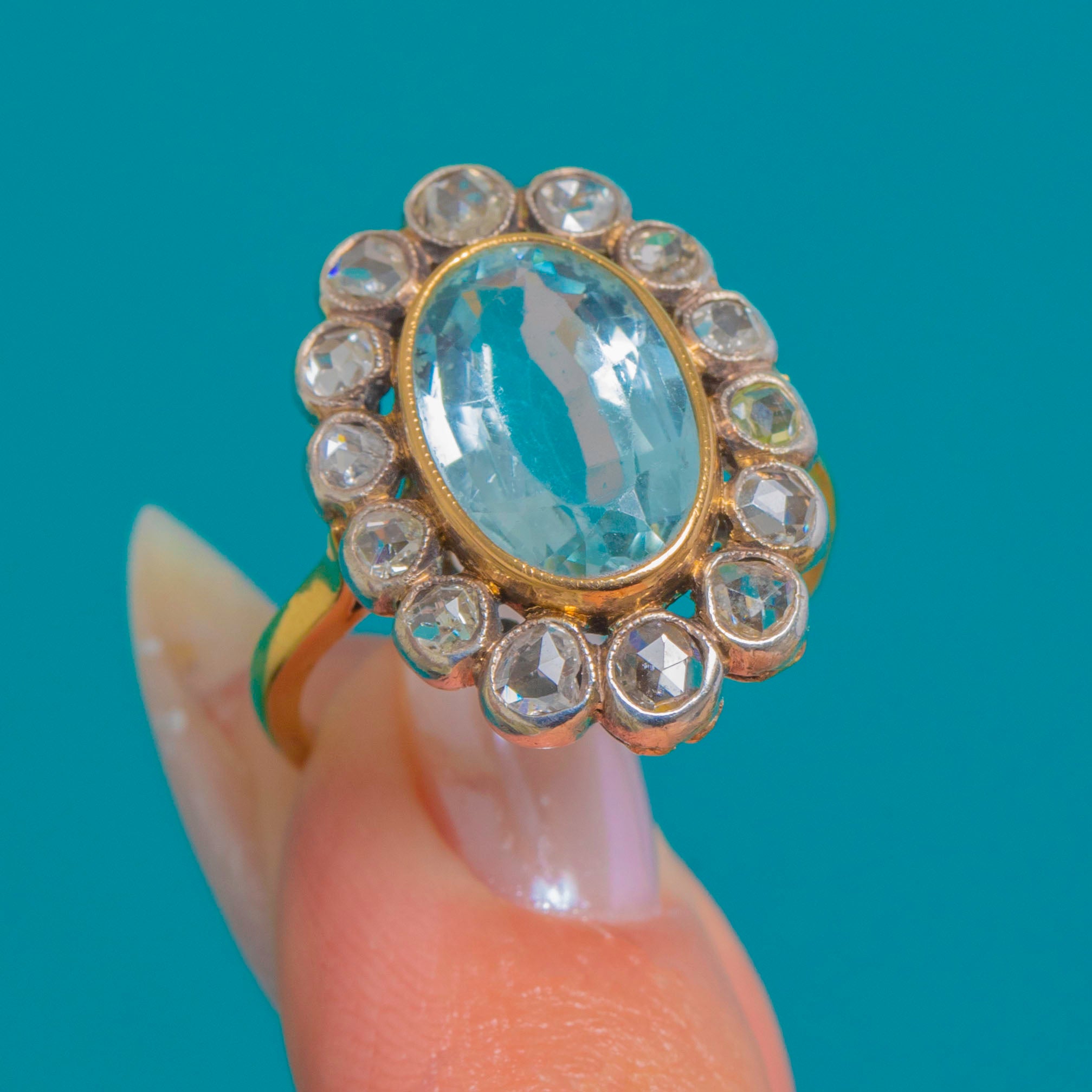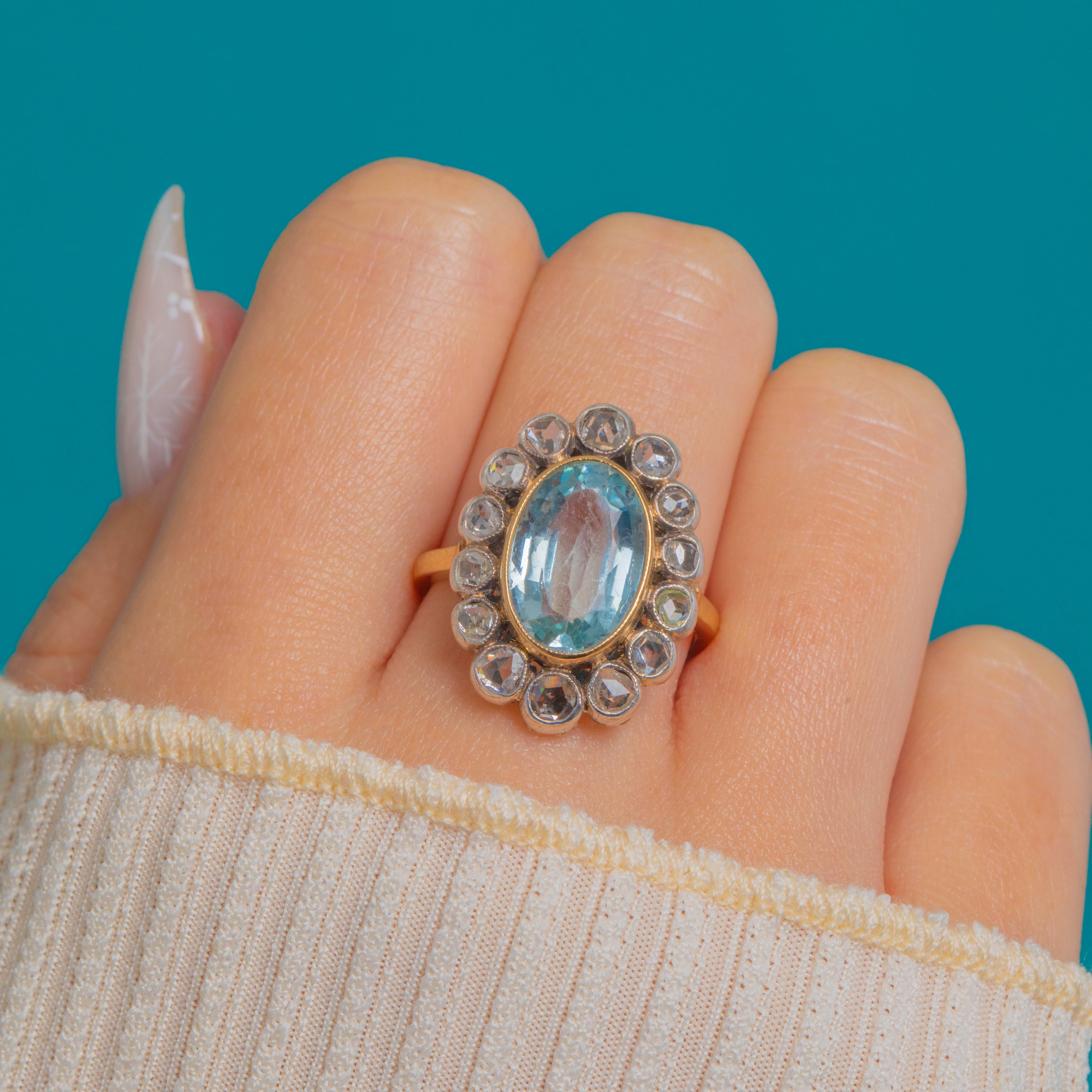 A luminous Victorian cluster ring showcasing a serene 2.00ct oval Aquamarine embraced by a halo of glittering Rose cut Diamonds. The centre stone sits neatly within a smooth rub-over bezel, its soft blue glow beautifully offset by the silvery, scalloped cut-down collets of the surrounding Diamonds.