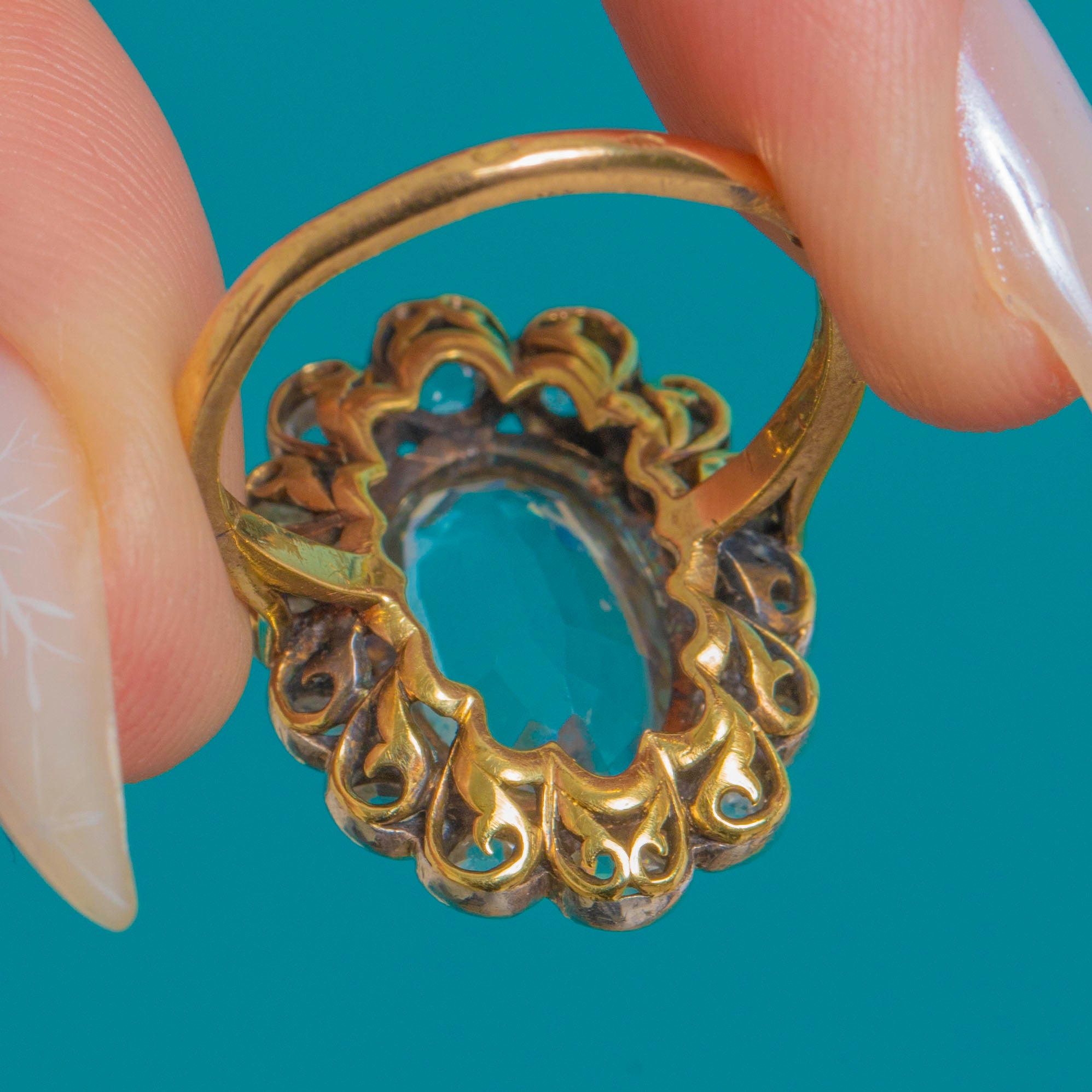 VERY GOOD: The Aquamarine shows minor facet abrasions under magnification but remains bright and attractive. The silver-topped collets display a gentle antique patina; the settings are secure with no missing stones noted. The 15ct Gold shank shows light dings and general wear consistent with age, with a possible old sizing seam at the base; the ring is sound and safe to wear.