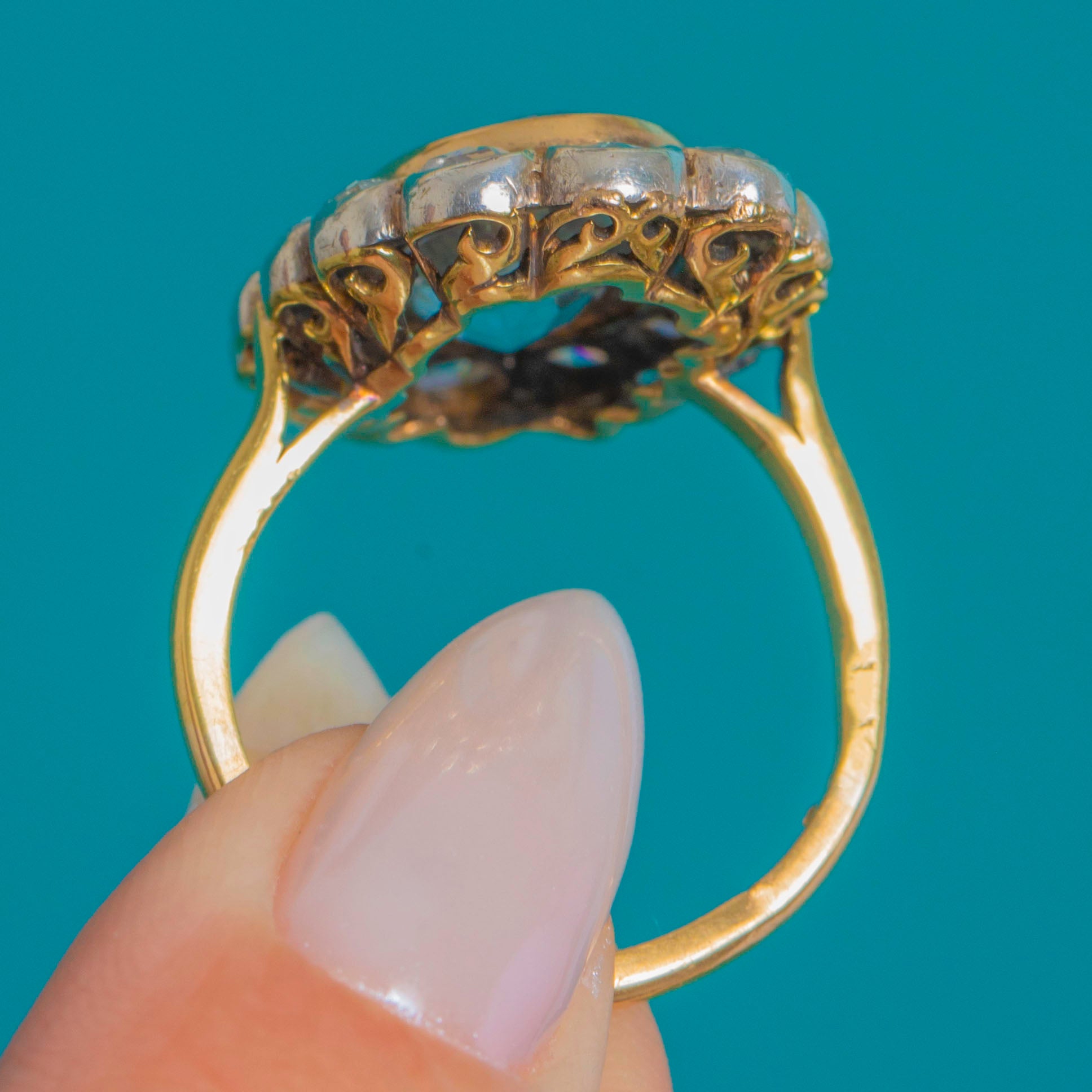 Finely hand-fabricated, the two-tone head is elevated over a delicate, pierced scroll under-gallery and flows into a simple 15ct Gold shank. The silver-over-gold aesthetic and romantic daisy silhouette impart that unmistakably antique elegance—refined, poetic, and enduringly chic.