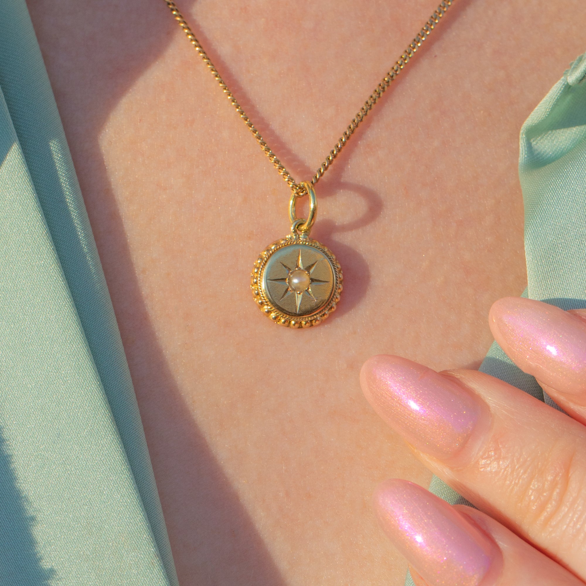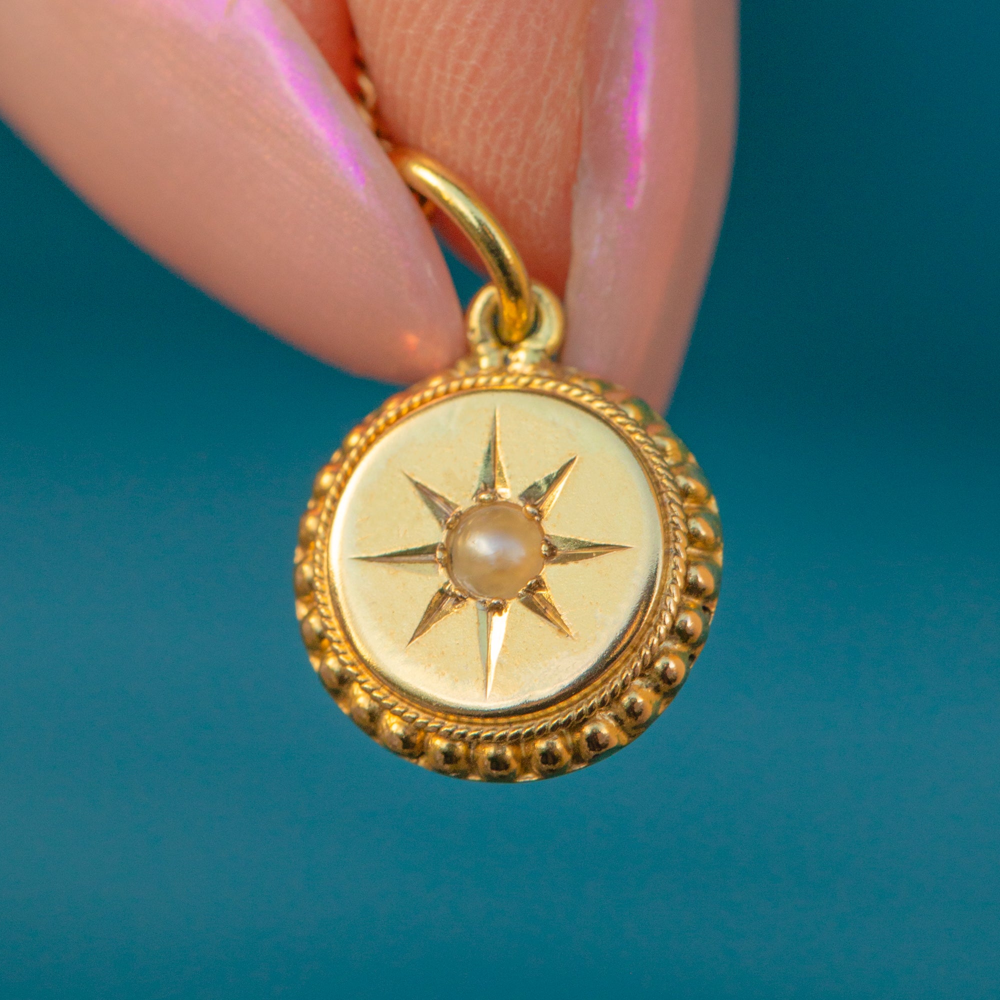 Featuring a lustrous champagne-hued Pearl and stunning star settings, this petite Etruscan charm is bursting with antique character. Wonderfully versatile, this ethereal Victorian charm is a must-have!