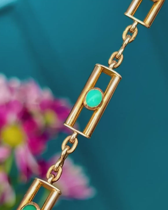 This Victorian bracelet is crafted in buttery 15ct Gold and set with bright natural Turquoise cabochons.