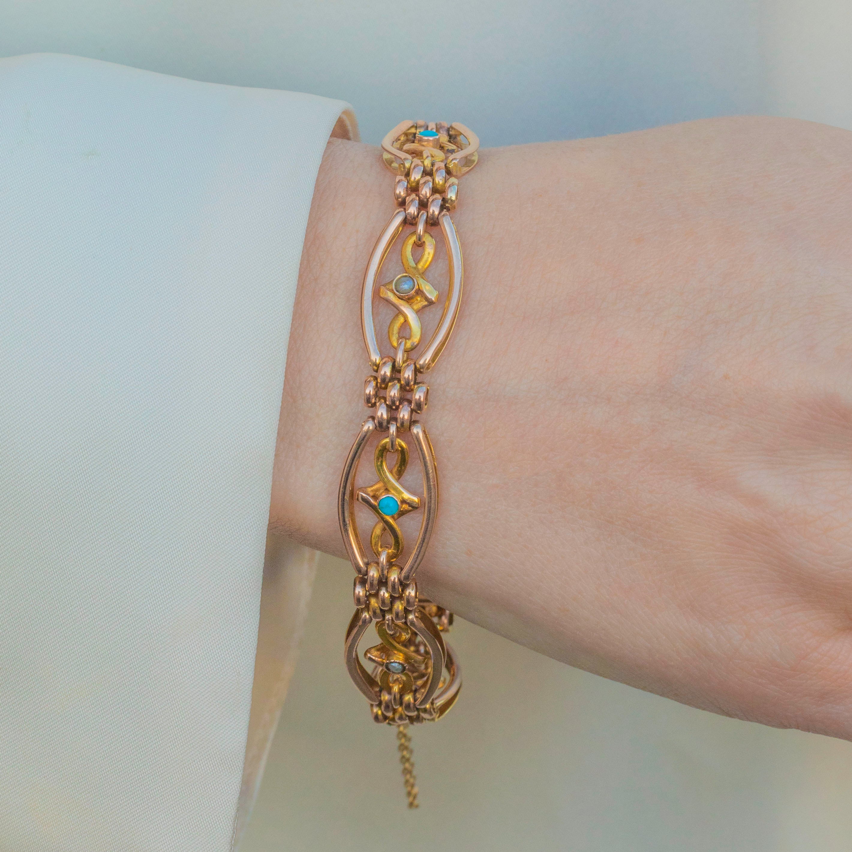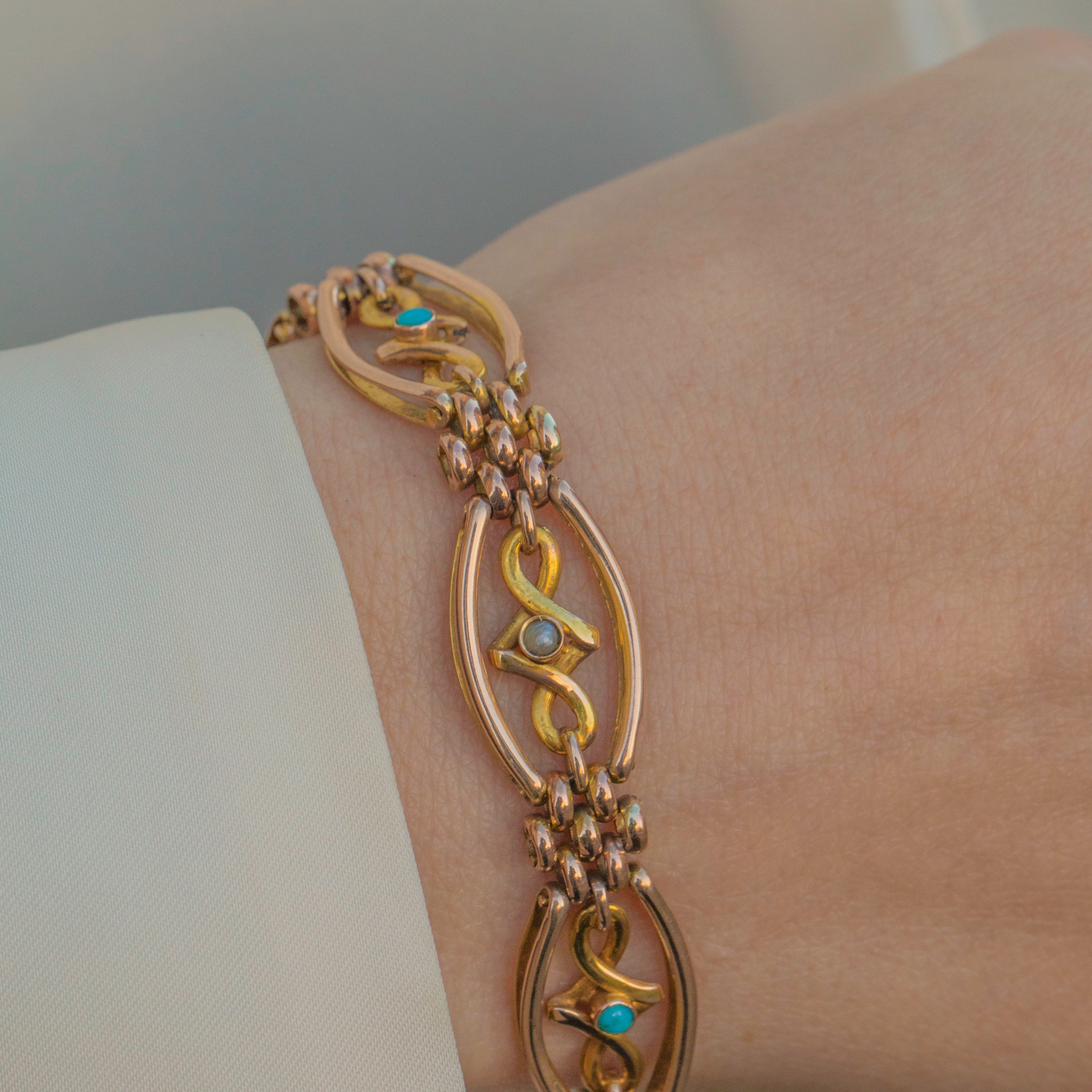 EXCELLENT. This Victorian 9ct Gold Turquoise Pearl gate bracelet is in excellent condition throughout. Each gemstone is securely set and retains a brilliance of hue, whilst the links are all securely connected and are free from any damage to note. Her clasp fastens securely shut and she is complete with a safety chain. Accruing a gorgeous saturation over its lifetime, her 9ct Gold remains as bright as ever! Allow her to lovingly wrap herself around your wrist for years to come.