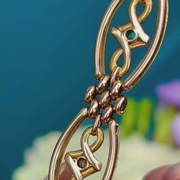 What a sumptuous Victorian 9ct Gold Turquoise Pearl gate bracelet! Crafted from the bright, buttery antique 9ct Gold, she features interlocking gate links and is embellished with gemstones throughout.