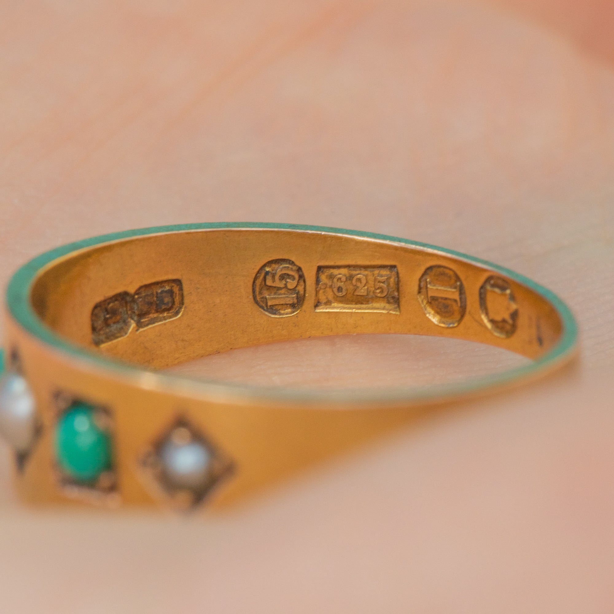 VERY GOOD. This Victorian 15ct Gold Pearl gypsy ring is in very good condition. The gemstones are secured into place, and the inside of the band is fully hallmarked. There is some wear to note on the inside of the band, but this isn't visible when worn and you can wear the piece comfortably.