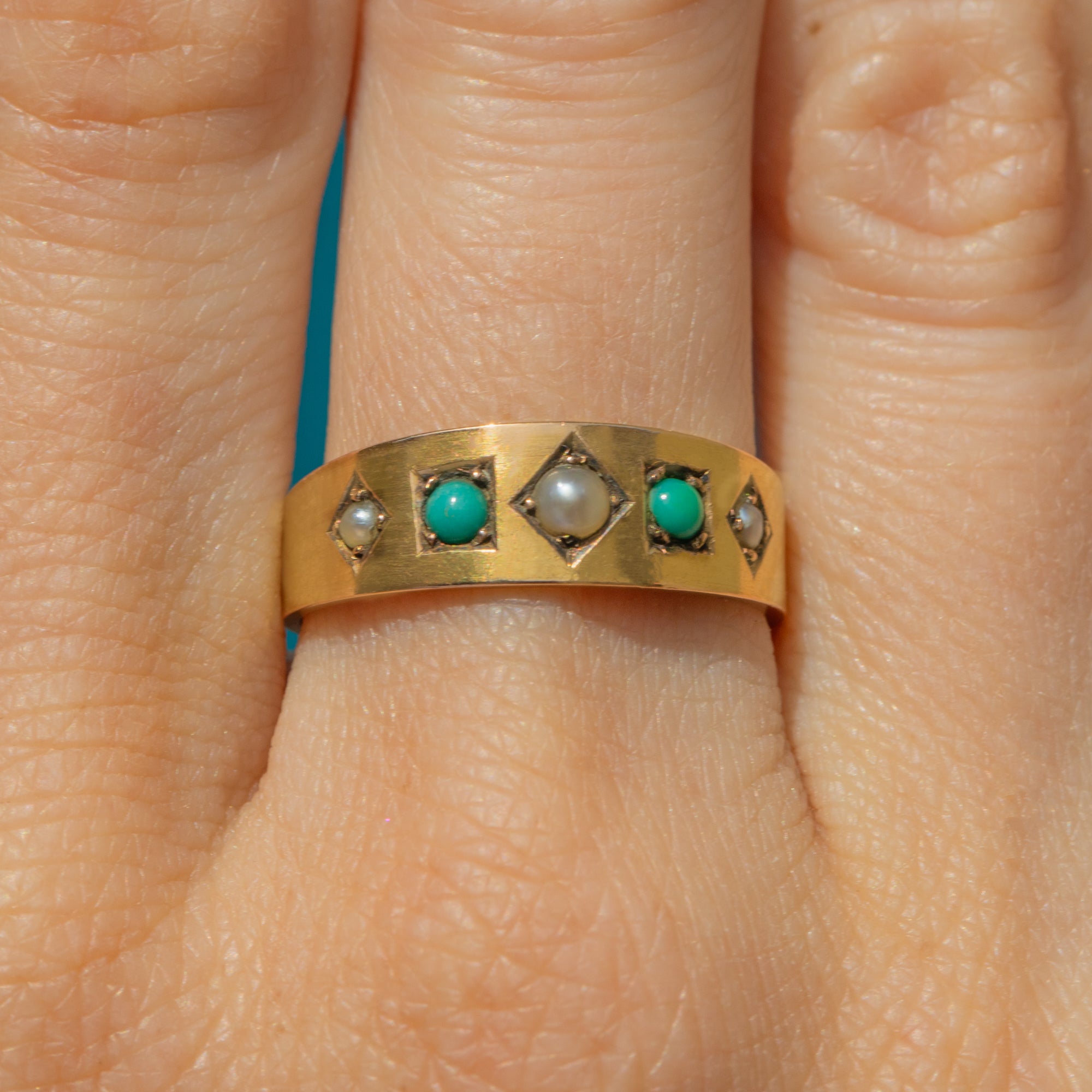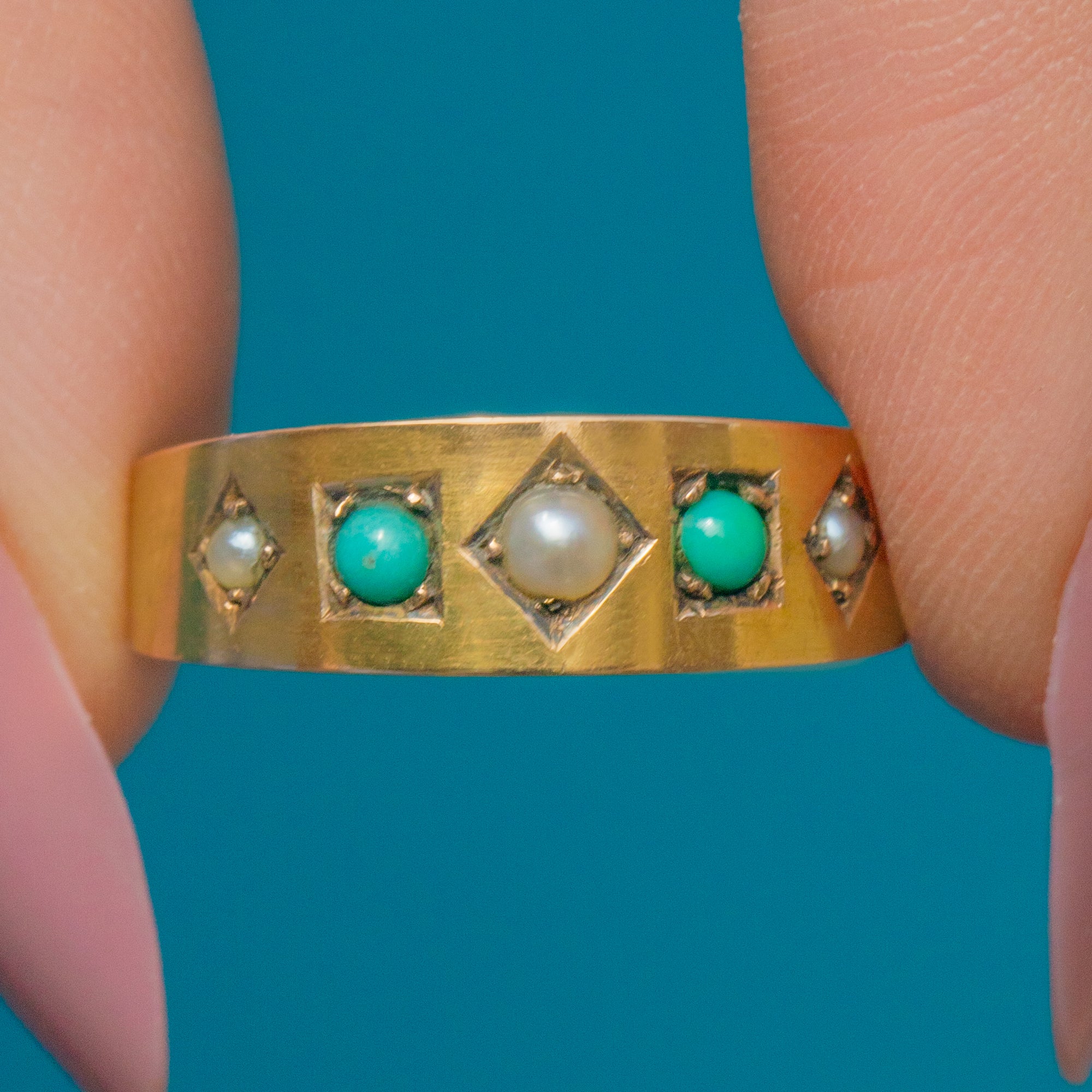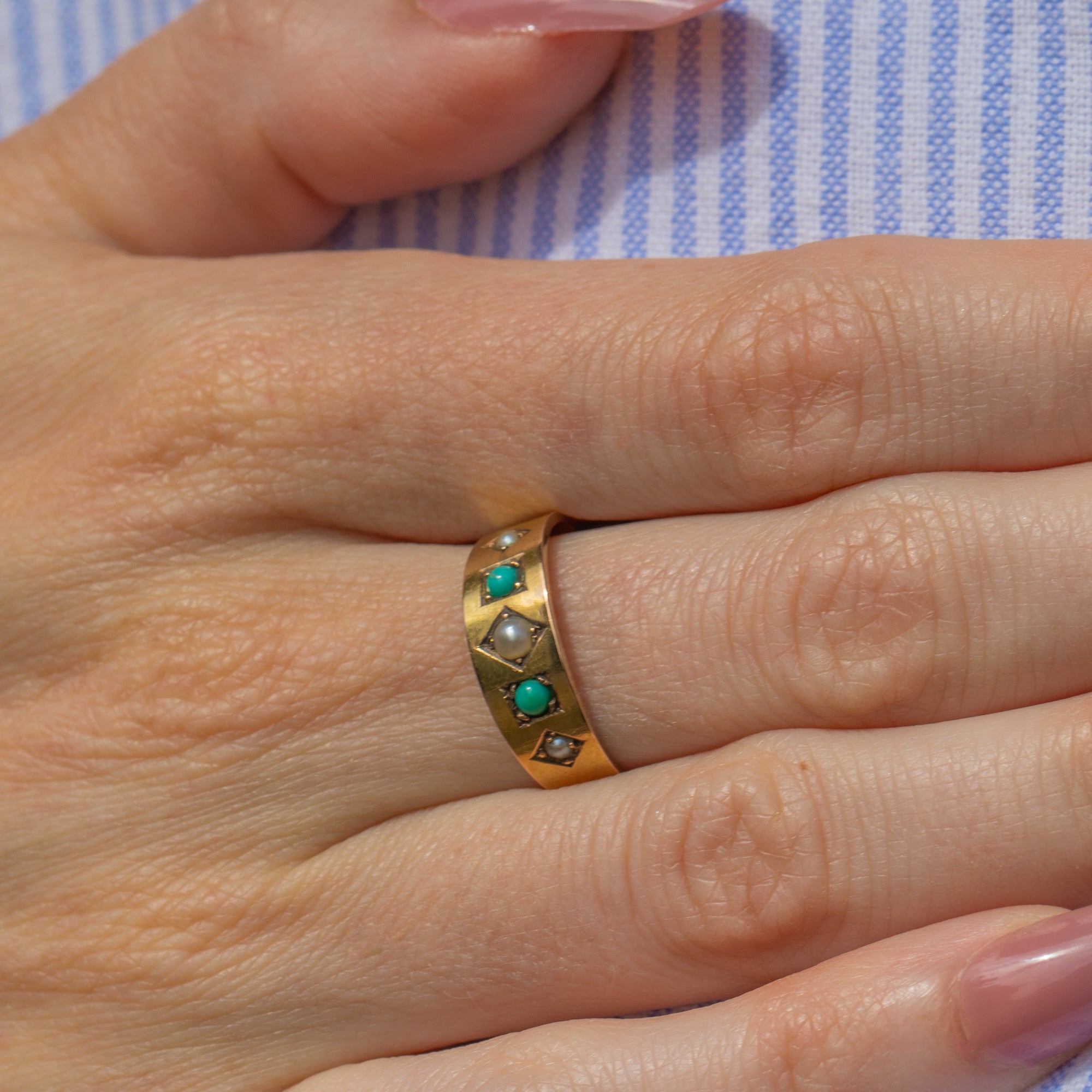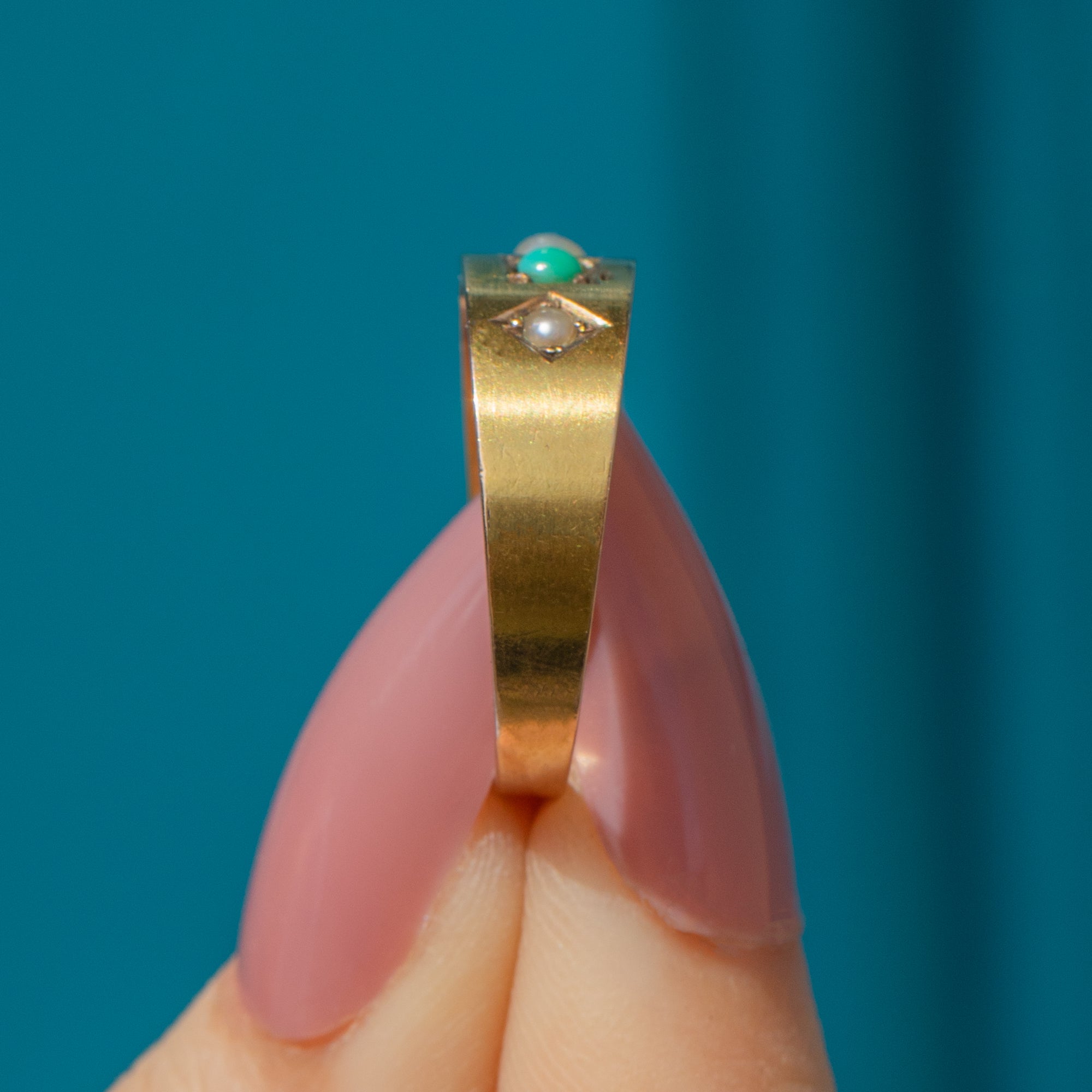 Victorian 15ct Gold Turquoise Pearl Gypsy Ring, c.1884