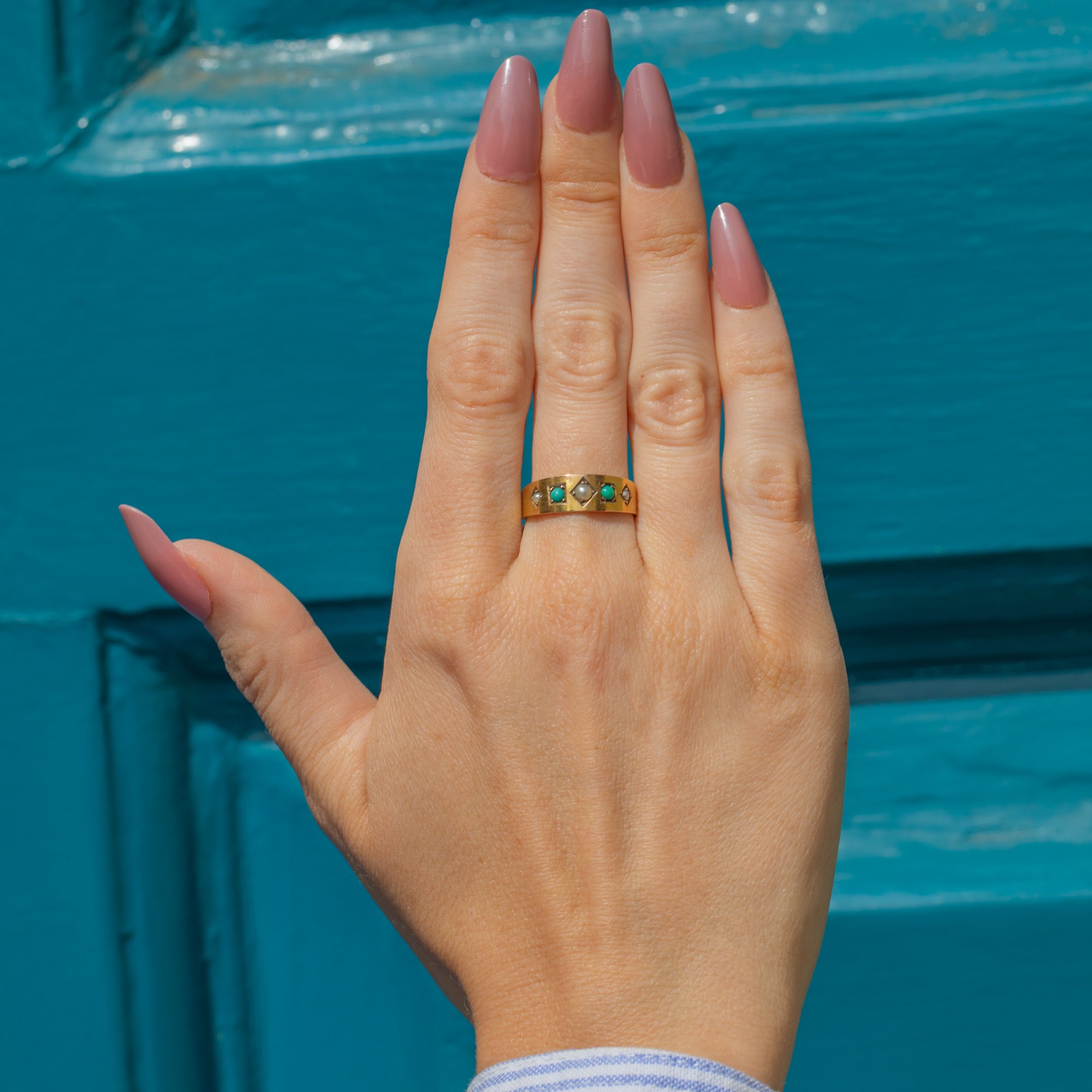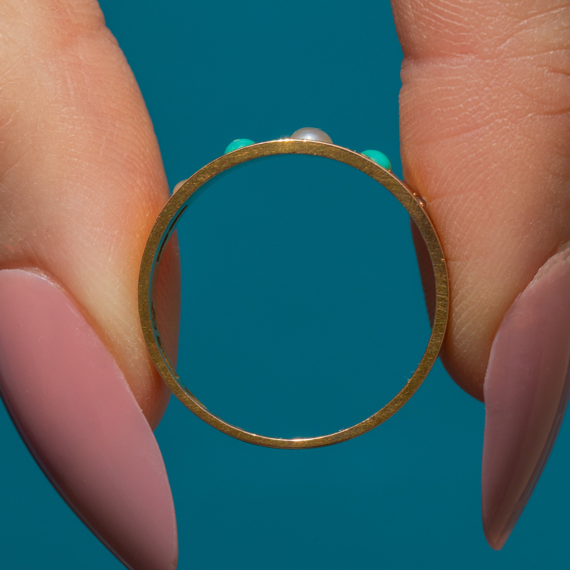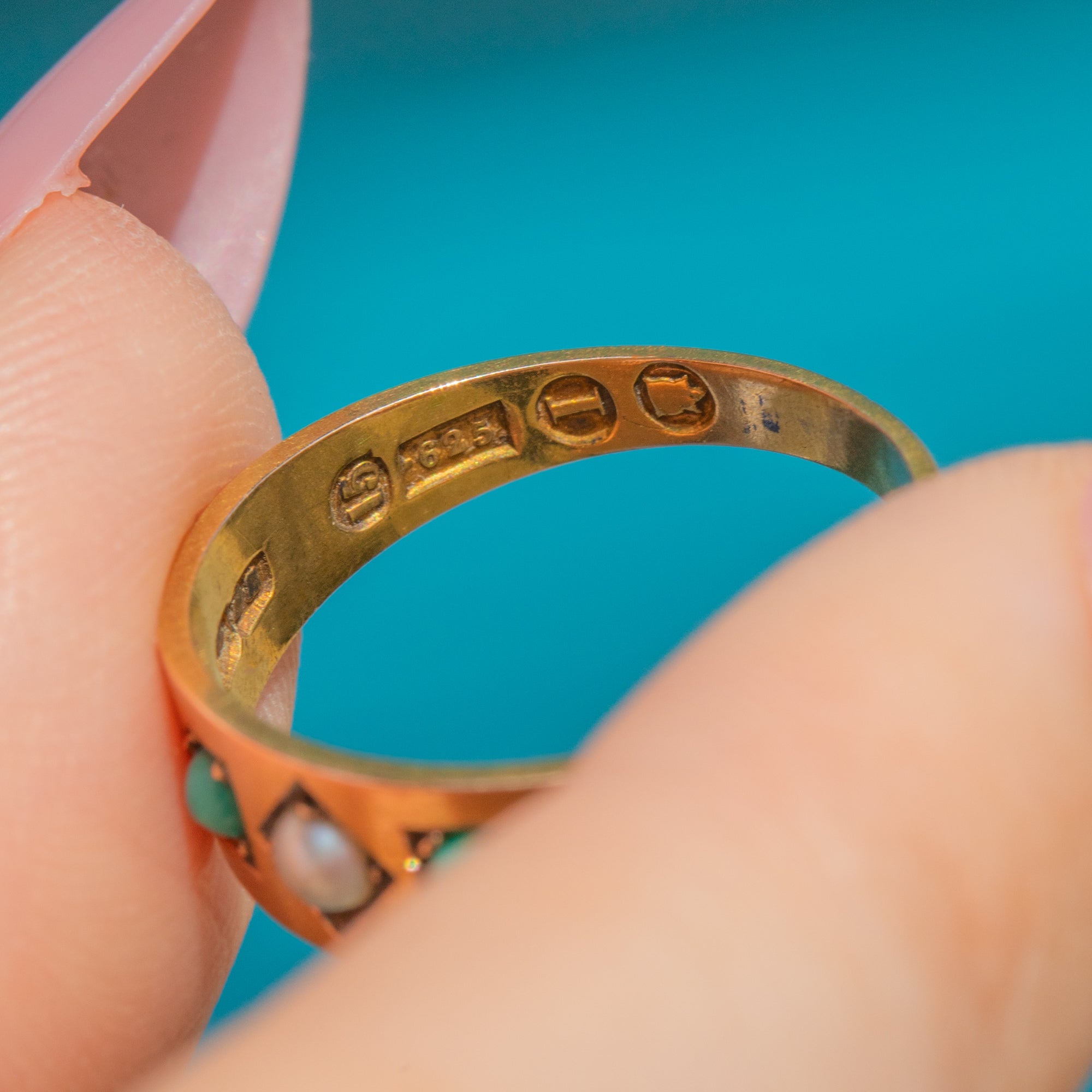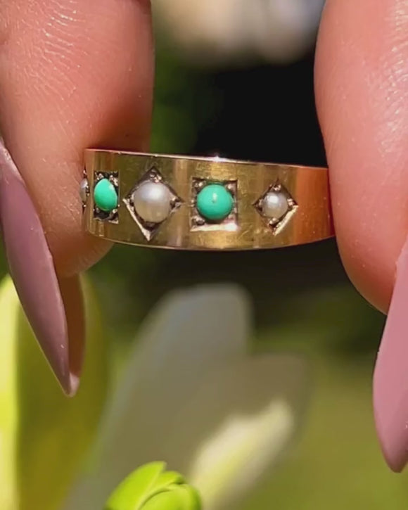 Victorian 15ct Gold Turquoise Pearl Gypsy Ring, c.1884